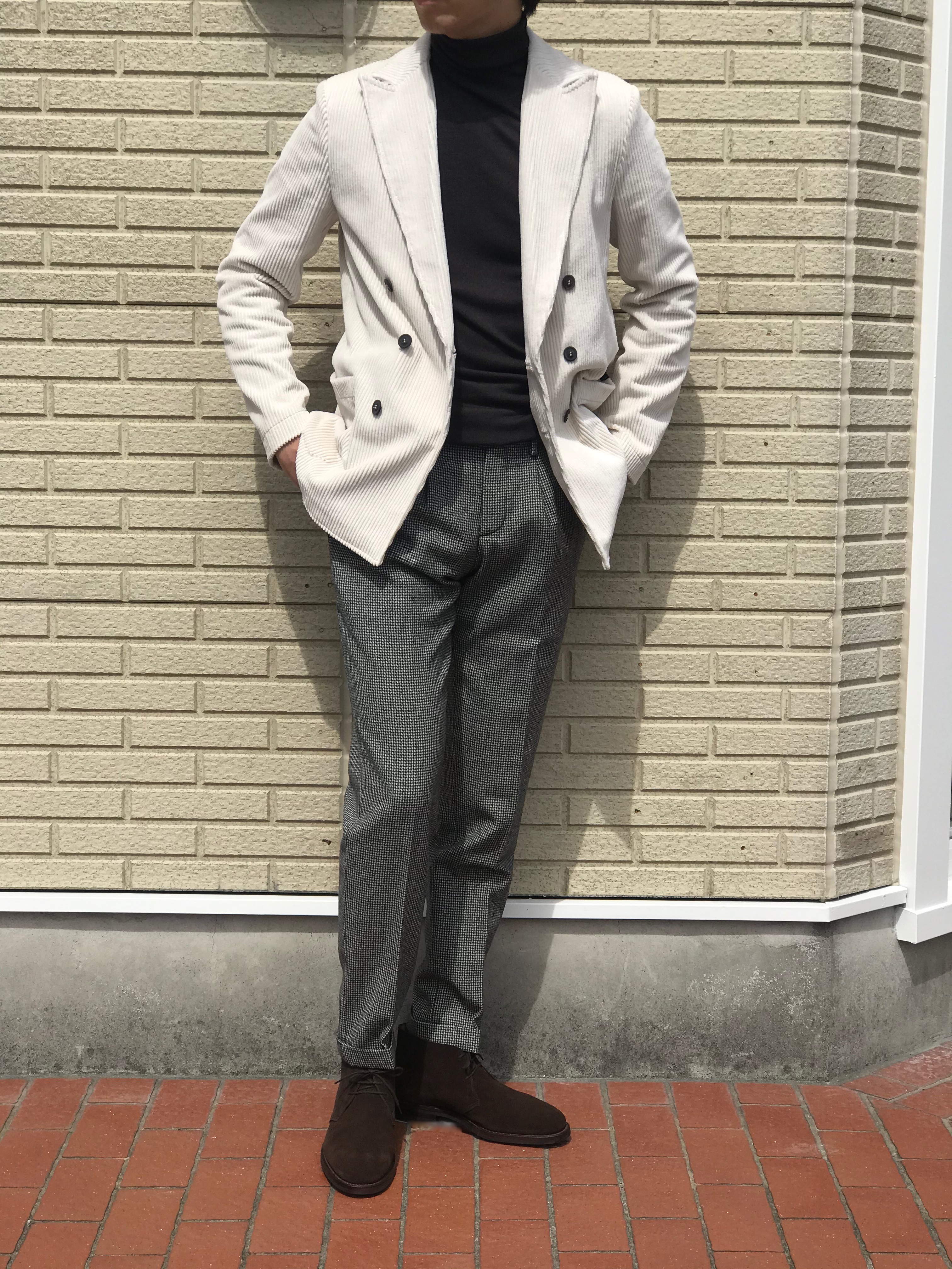 続いては、太畝コーデュロイのダブルブレスト。手軽に楽しめるとはおよそ言い難い存在感ですが、時には、普段のライフスタイルの殻を破って、妄想を大きく膨らませるのも大事です。