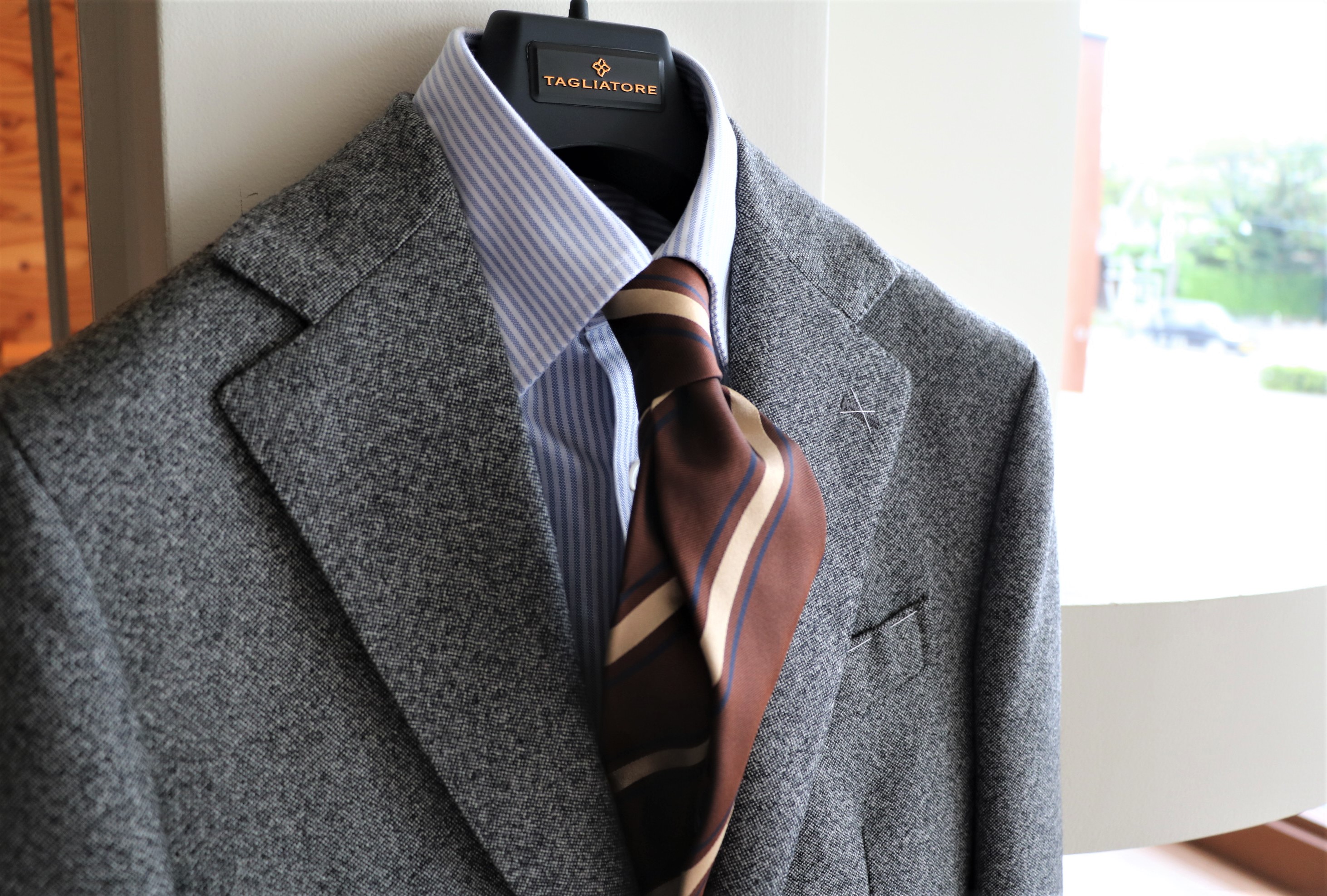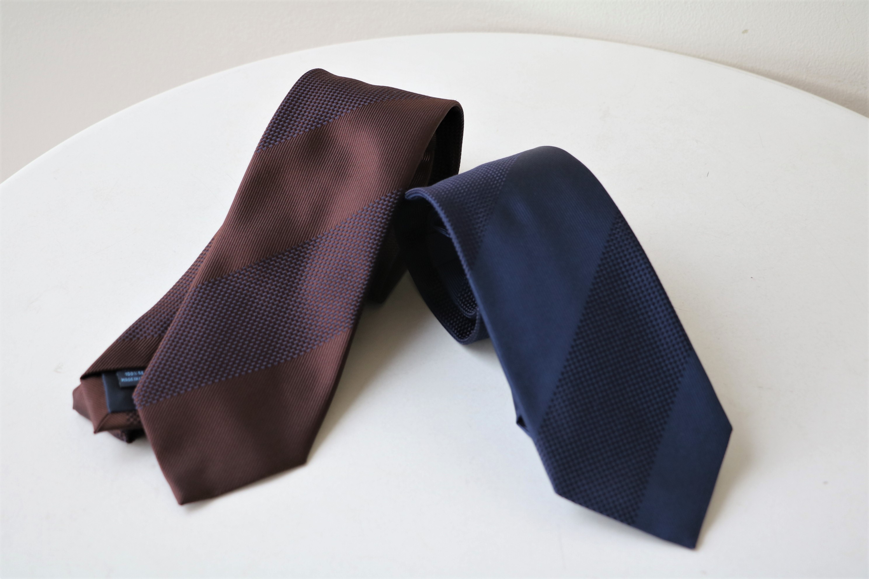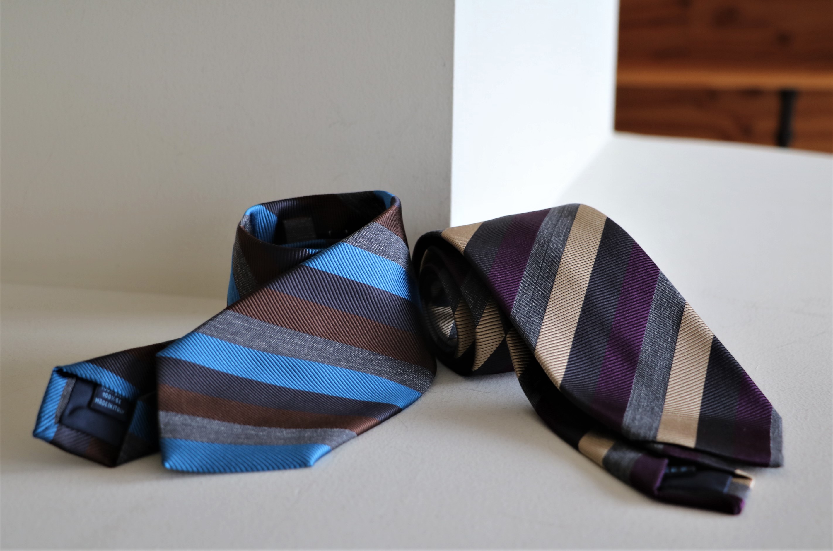 シルクのソリッド(無地)タイは、多くのブランド、ショップから提案されています。私どもグローリーガイでも何度となくオーダーを入れているタイプです。ただ、今回セレクトしたのは、織りの変化でみせるストライプ柄のネクタイ。ブラウンにはパープルがかったグレイを。ネイビーは青の濃淡で表情をつけています。
