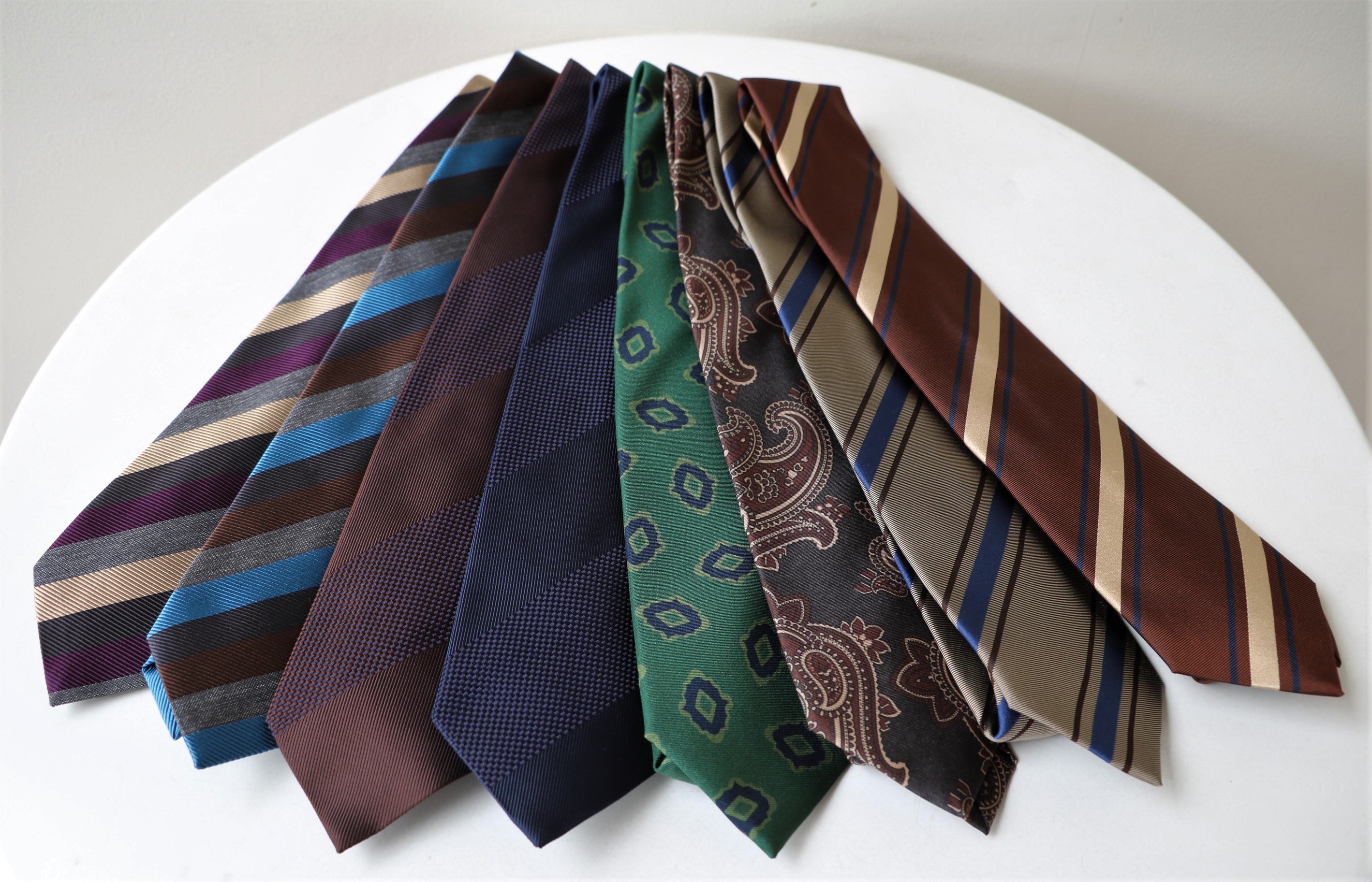 上からプリントのストライプ、小柄のオールオーバー、サテンソリッド。全てシルクです。ブラックスーツに限定せずに濃いグレイのスーツに合わせても素敵です。