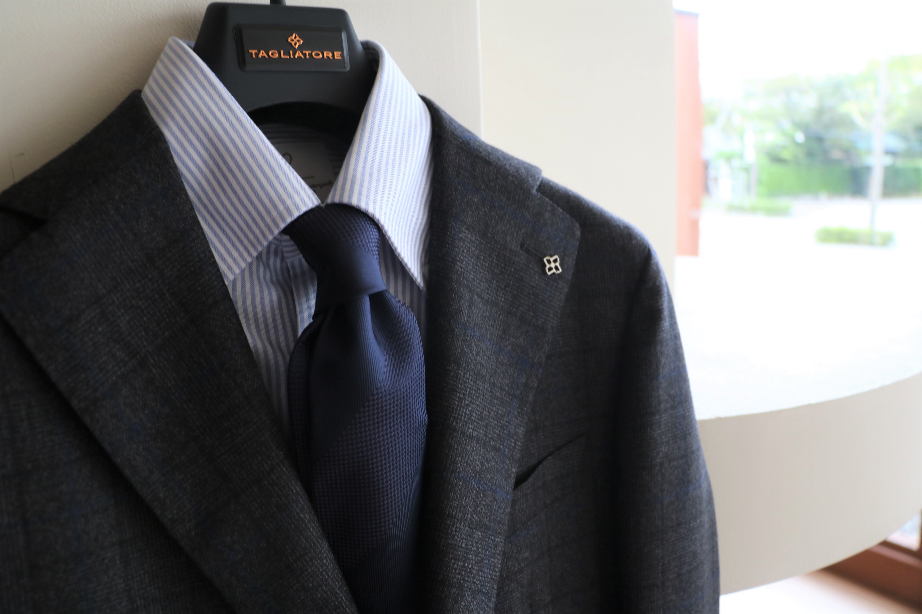 アクセントカラーがパープルのネクタイで合わせたシャツはMaria Santangelo(マリア サンタンジェロ)、スーツはTAGLIATORE(タリアトーレ)。コバルトブルーで合わせたシャツはBAGUTTA(バグッタ)、スーツはDe Petrillo(デ ペトリロ)です。