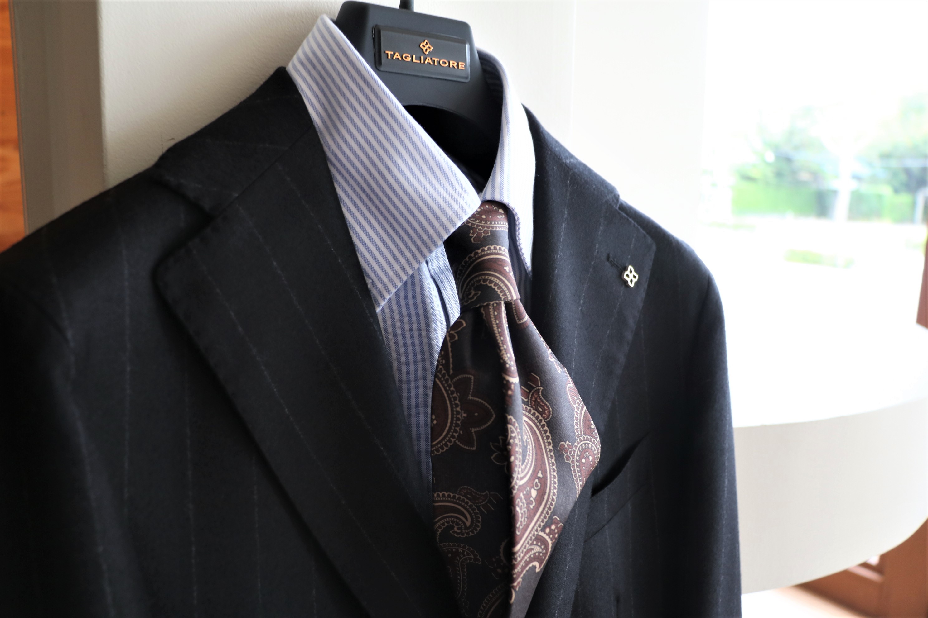 ブラウンのタイは、アズーロ・エ・マローネの基本コーディ。ネイビーは青のグラデーションで組み合わせてみました。
