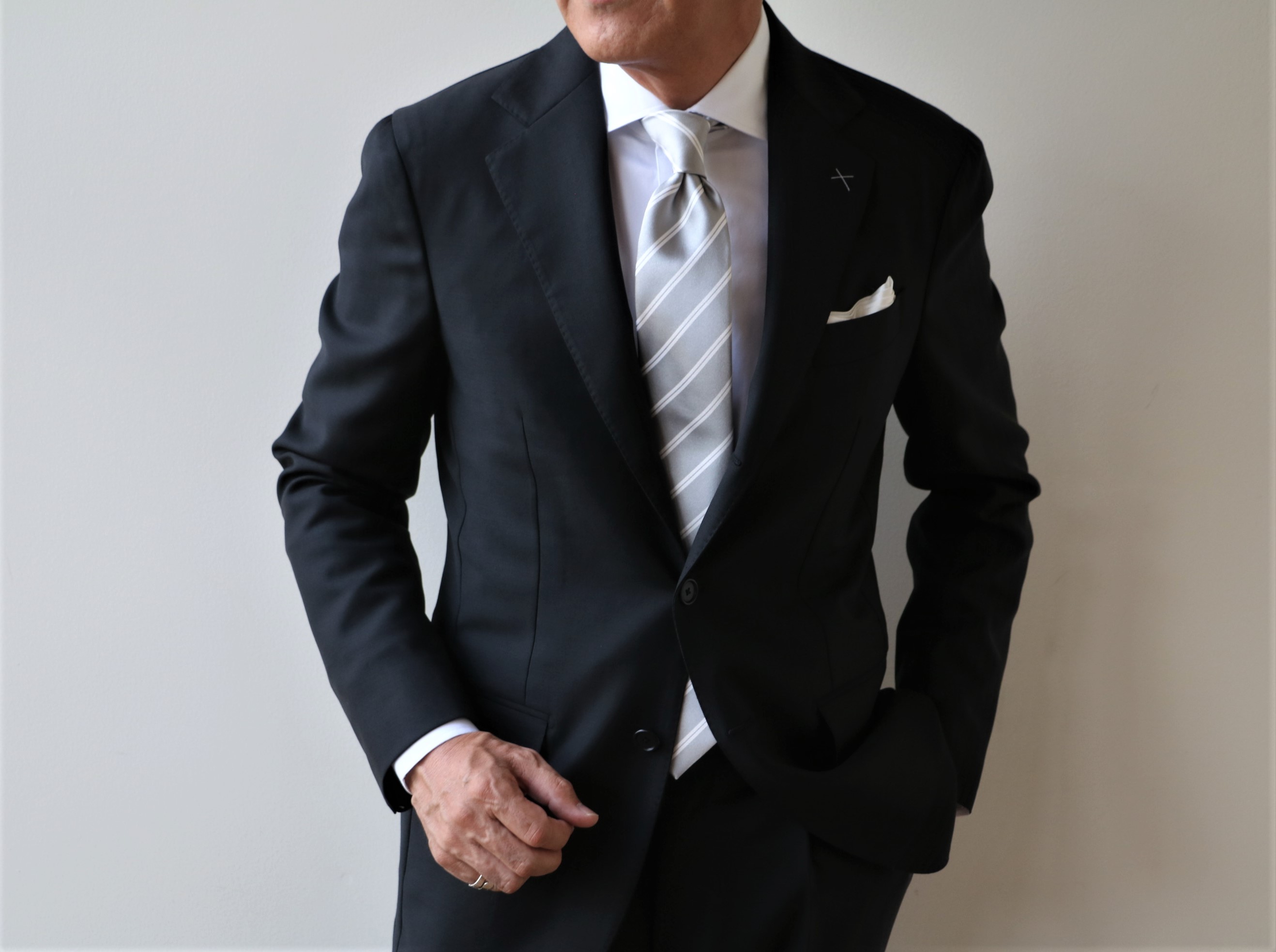 ご案内を明日に控えているDe Petrillo(デ ペトリロ)のブラックスーツに合わせてみました。掲載済みのTAGLIATORE(タリアトーレ)のブラックスーツと比較してください。モーニングやタキシードに比べ、略式にはなりますが、日本では必ずや揃えておかないと困るブラックスーツです。