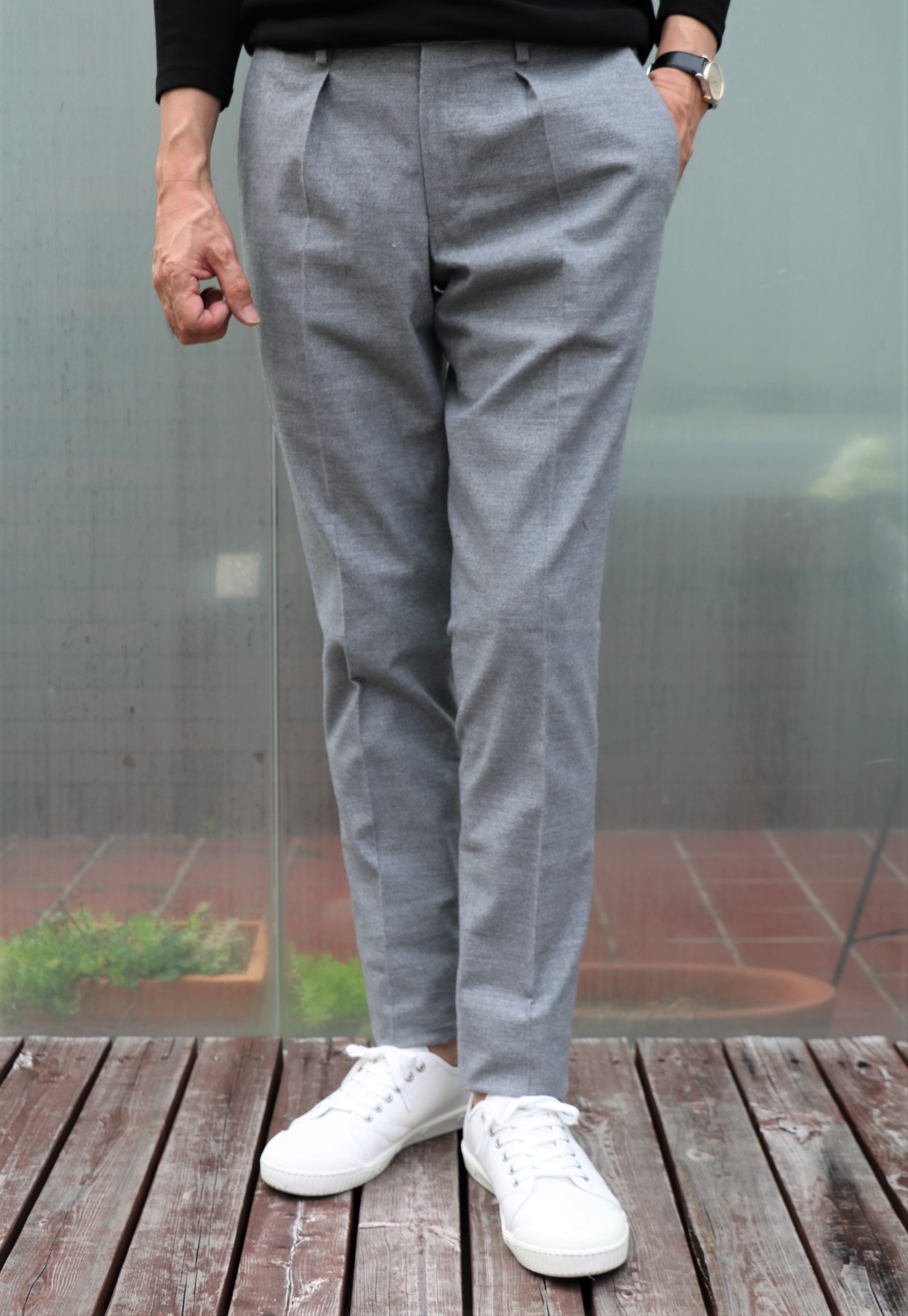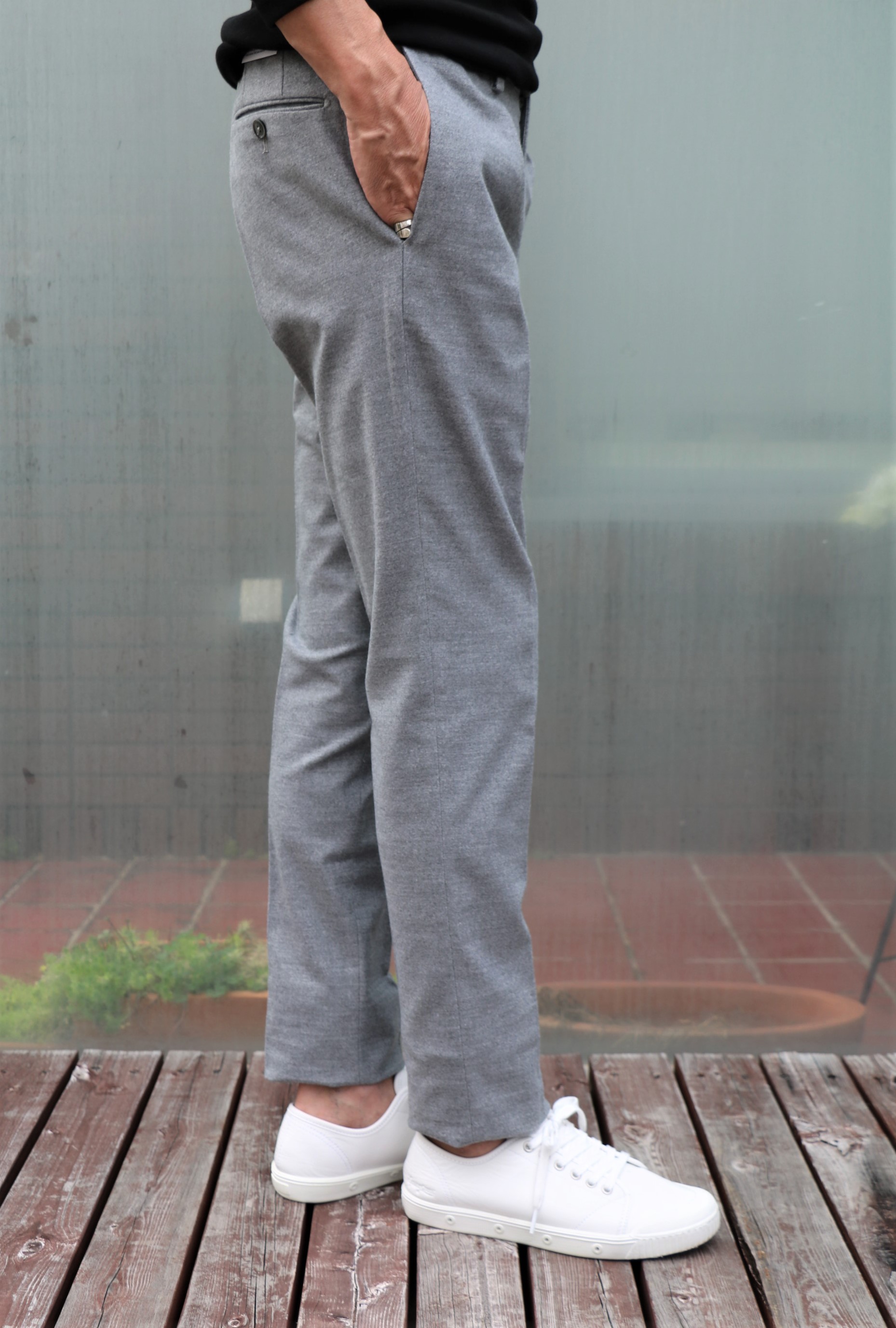 肝心のパンツのご説明です。素材はコットン・ポリエステル・レーヨン・ポリウレタンのウールライクなパンツです。無地に見せて、実はヘリンボーン柄に。ライトグレイのクールさと、やや起毛した生地のウォーム感。秋冬のモダンなトラベラーパンツとして活躍します。いや、今の時代なら、着用シーンは更に広がるでしょう。