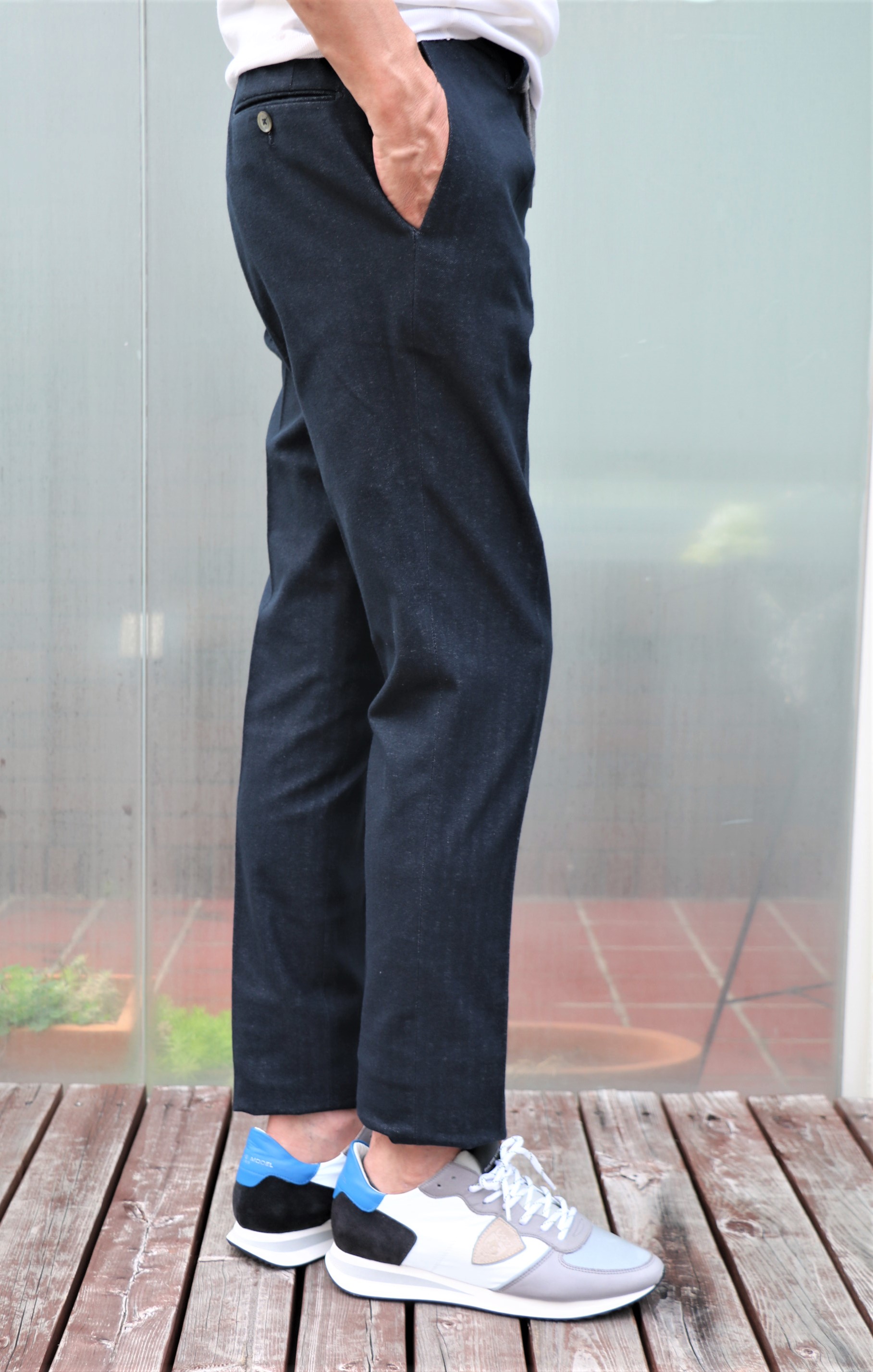 インディゴの青が魅力です。デニムとは一味も二味も異なる深みのある濃藍色。コーディネートはネイビーで合わせましたが、ブラックやグリーン、ボルドーなどとも相性の良い色合いです。さらに掠れたヘリンボーン柄の色の濃淡、いや白場が出ることで組み合わせにメリハリをつけてくれるはずです。