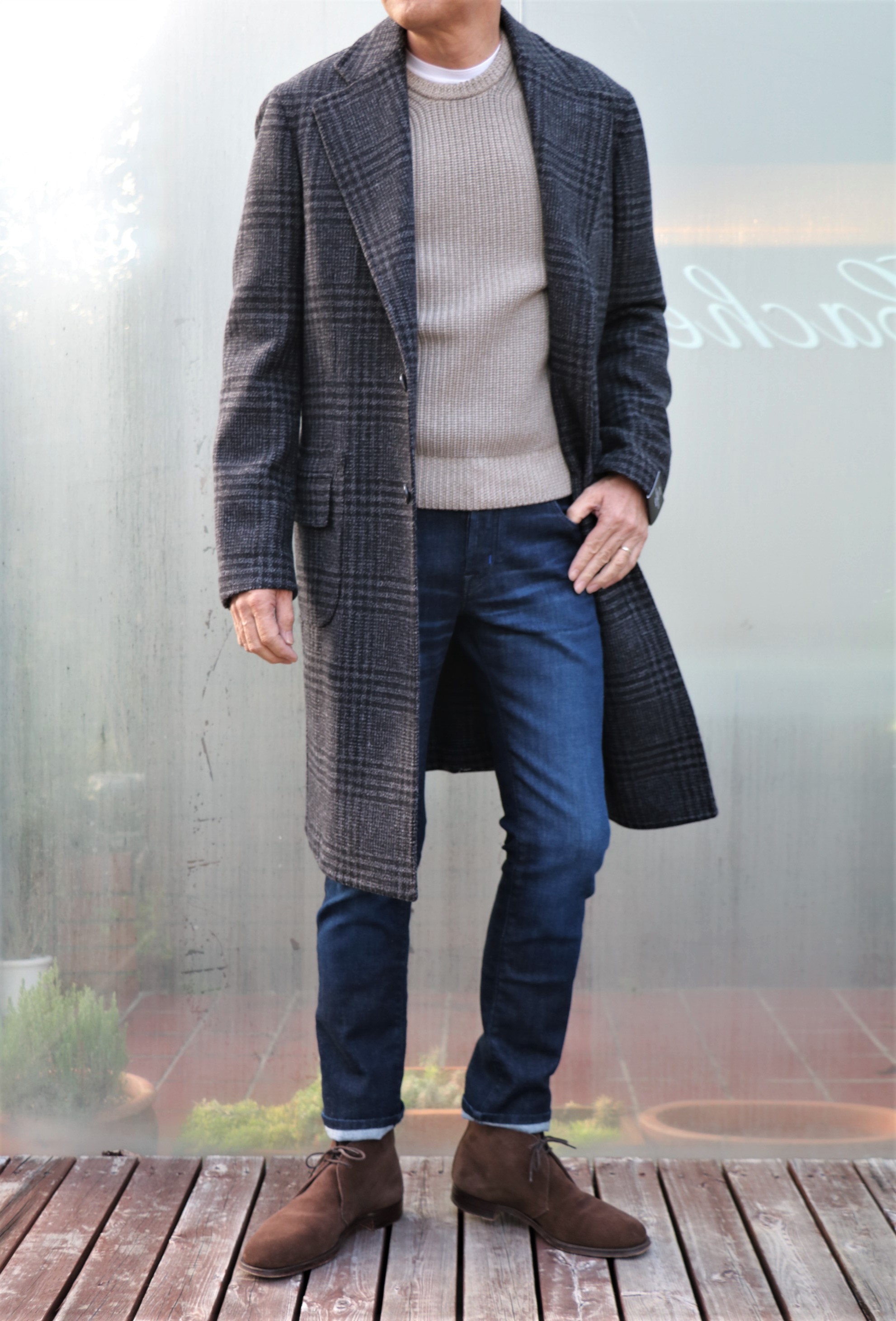 私を担当するカメラマンは、ジュニア。慣れているだけに撮るのに時間はかかりません。展示会を私物化していることは、何度もお話しさせていただいておりますが、このコートもかなり私的気分です。どこのかと言えば、【TITO ALLEGRETTO/ティト アレグレット】の「カシミア混ウール バックベルト付きテーラーコート」。オンでもお使いになれますが、ブルーデニム(JACOB COHEN/ヤコブ コーエン)にクルーネックのニット(未公開のDrumohr/ドルモア)をスウェット感覚で着て、デザートブーツやチャッカーブーツで合わせるのが好きです。テラスで撮影の場合、靴が傷むので私物を使いますが、本来ならば、今季ご提案しているCROCKETT&JONES/クロケットアンドジョーンズのこれや、Drake's/ドレイクスのあれを履きたいものです。