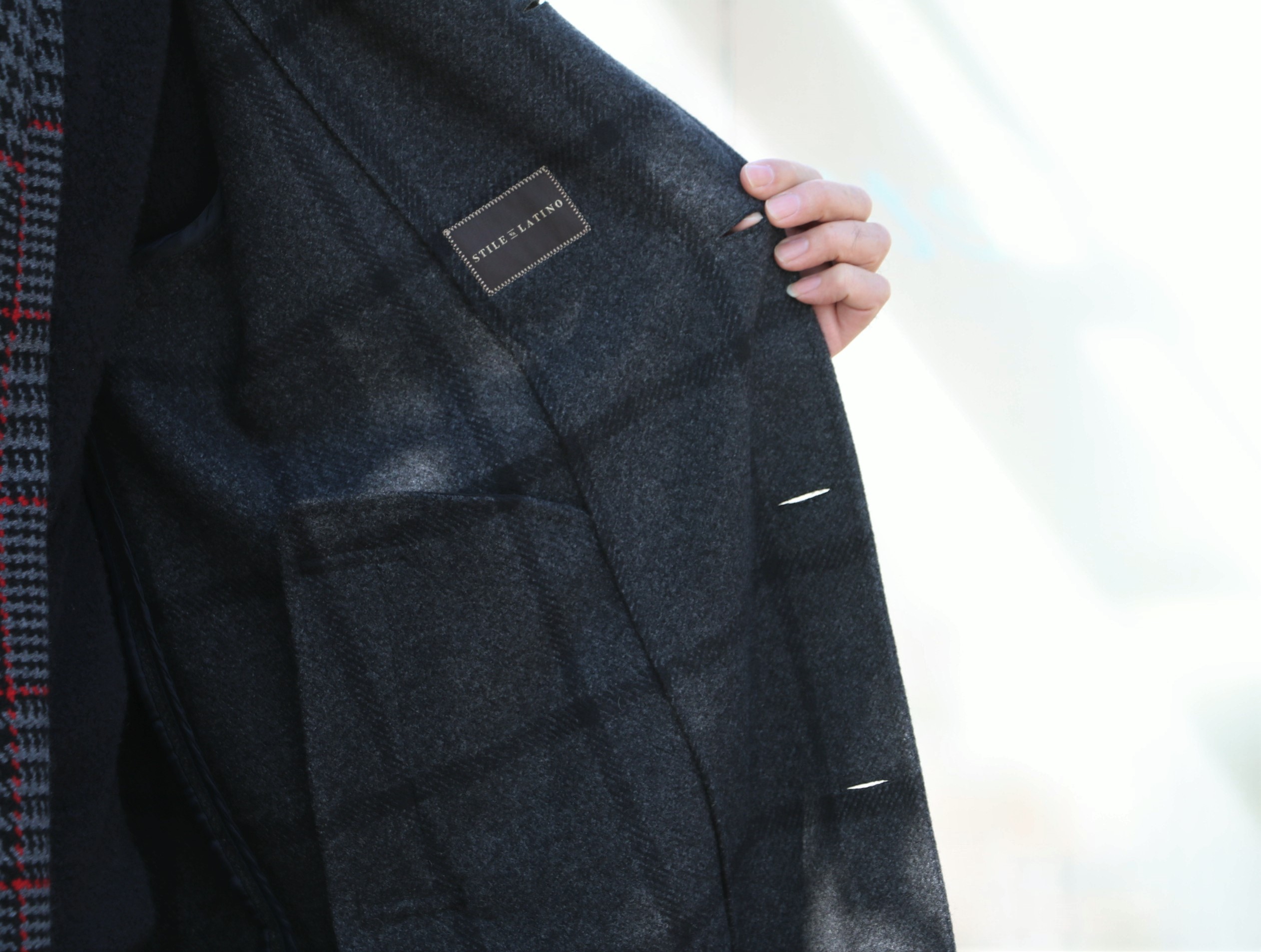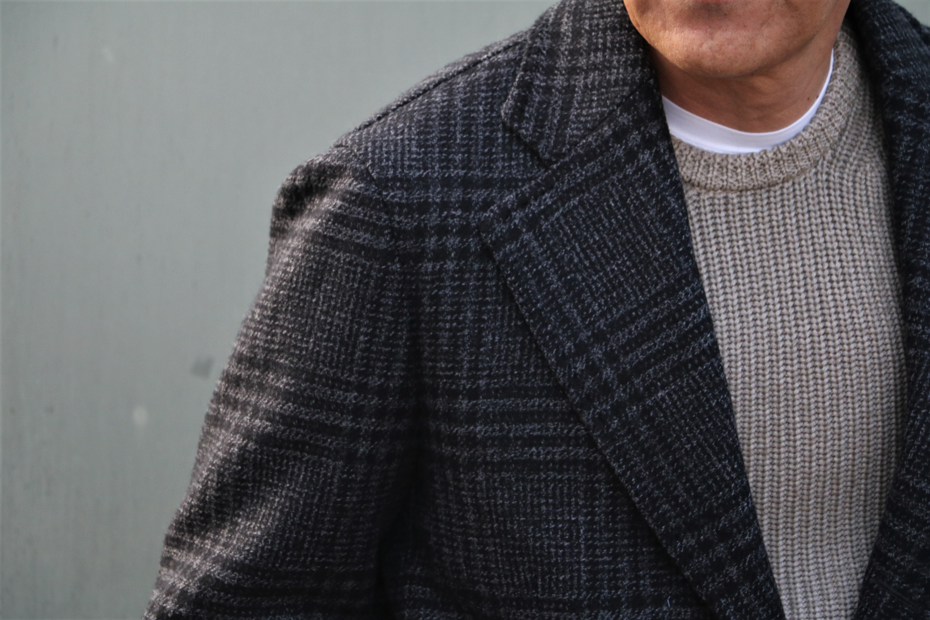ゴージの位置は高めで、大き目な上衿から折り返した段返りの5つ釦タイプ。生地はカシミア混ウールのしなやかな綾織り。そして、チャコールグレイとブラックの配色が、伝統柄ウィンドウペンをモダンに魅せています。