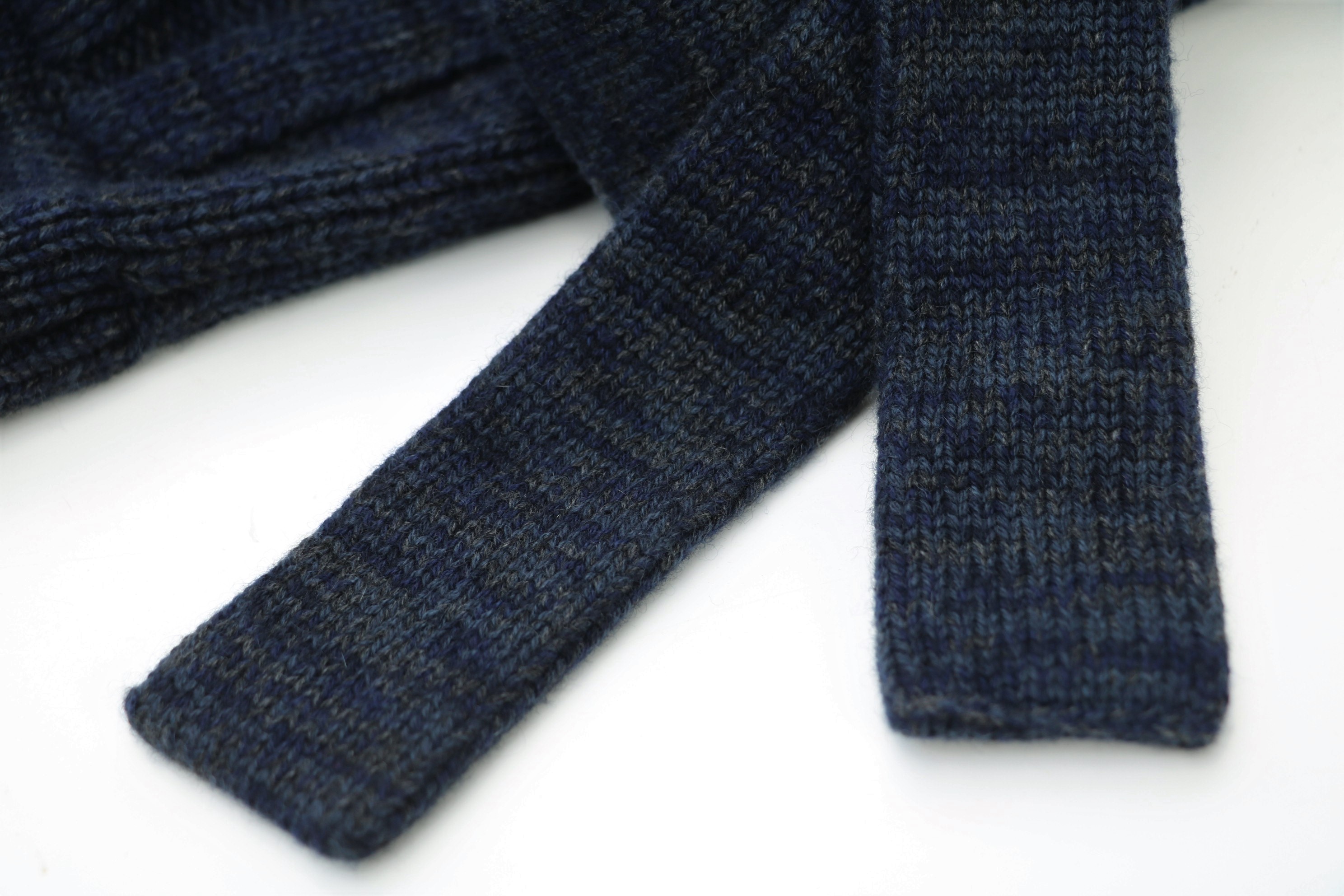 表情を豊かにしているのが、ネイビー×フェードブルー×杢グレイのミックス糸。奥行きのあるニットに仕上げています。