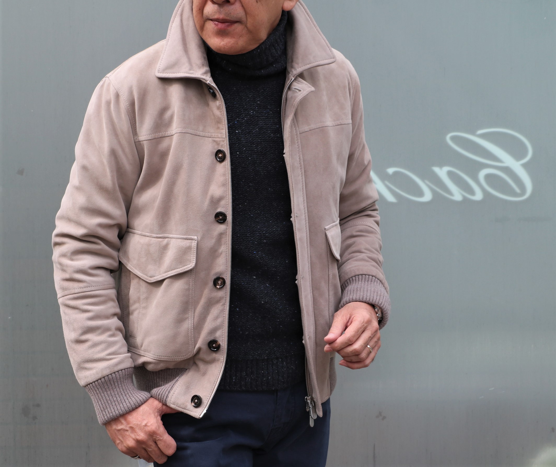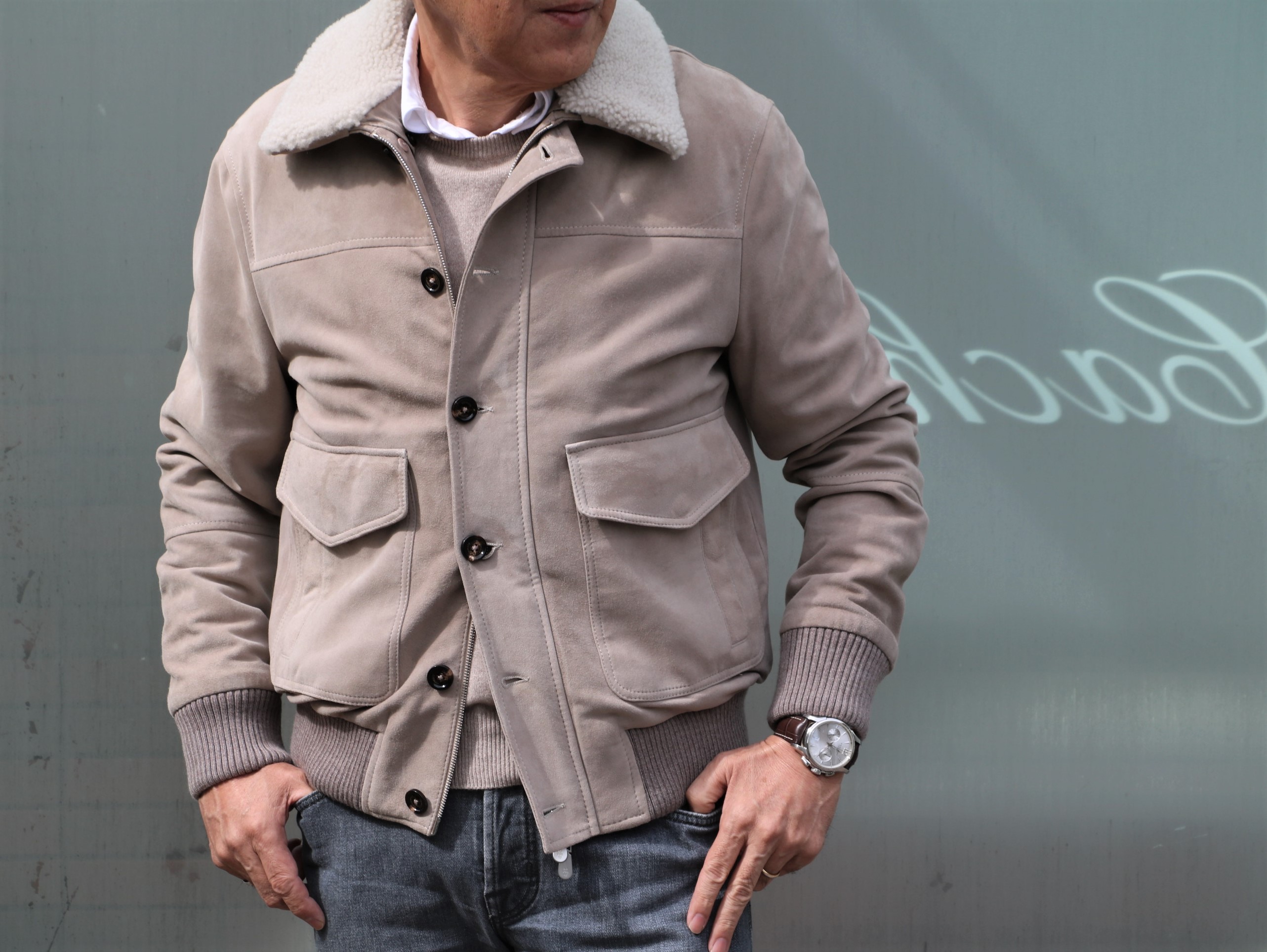 やはり好きなデザインの前を通り過ぎることができません。コレクションのメインに飾ってあったゴートスエードのG-1フライトジャケットに釘付けです。