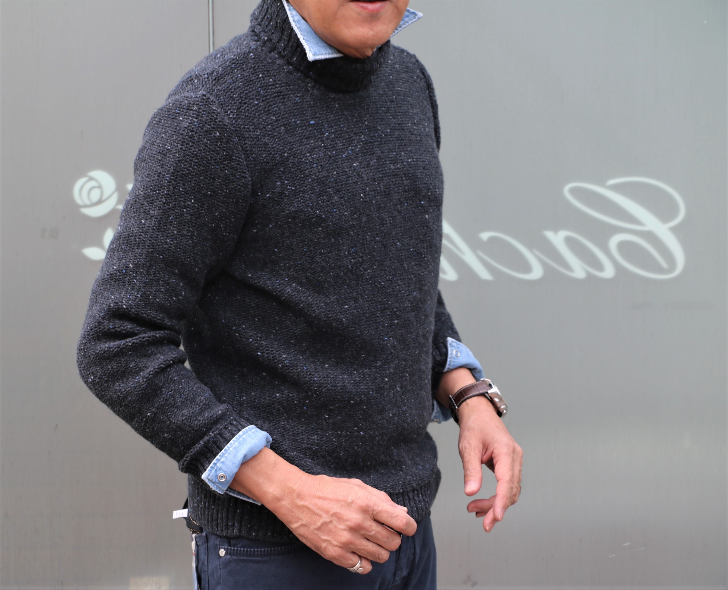 襟のファーを取り外した写真で着ていたニットも【eleventy/イレブンティ】。昨年のセレクトですが、色褪せることのないカラーネップ入りのタートルネックセーターです。サイズはSで着用しております。