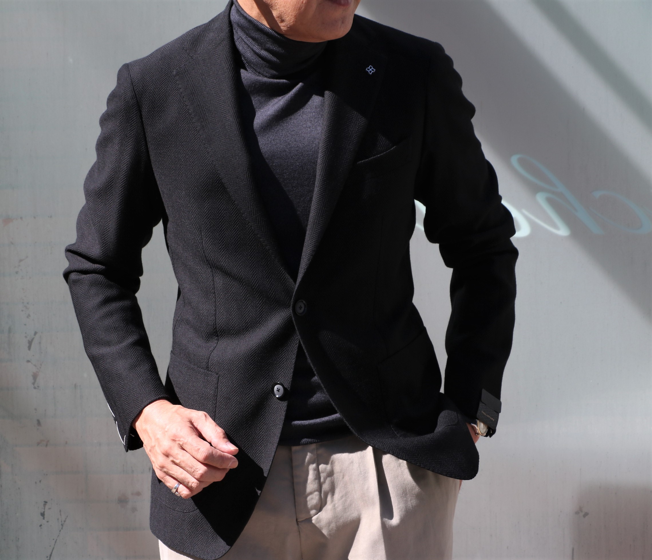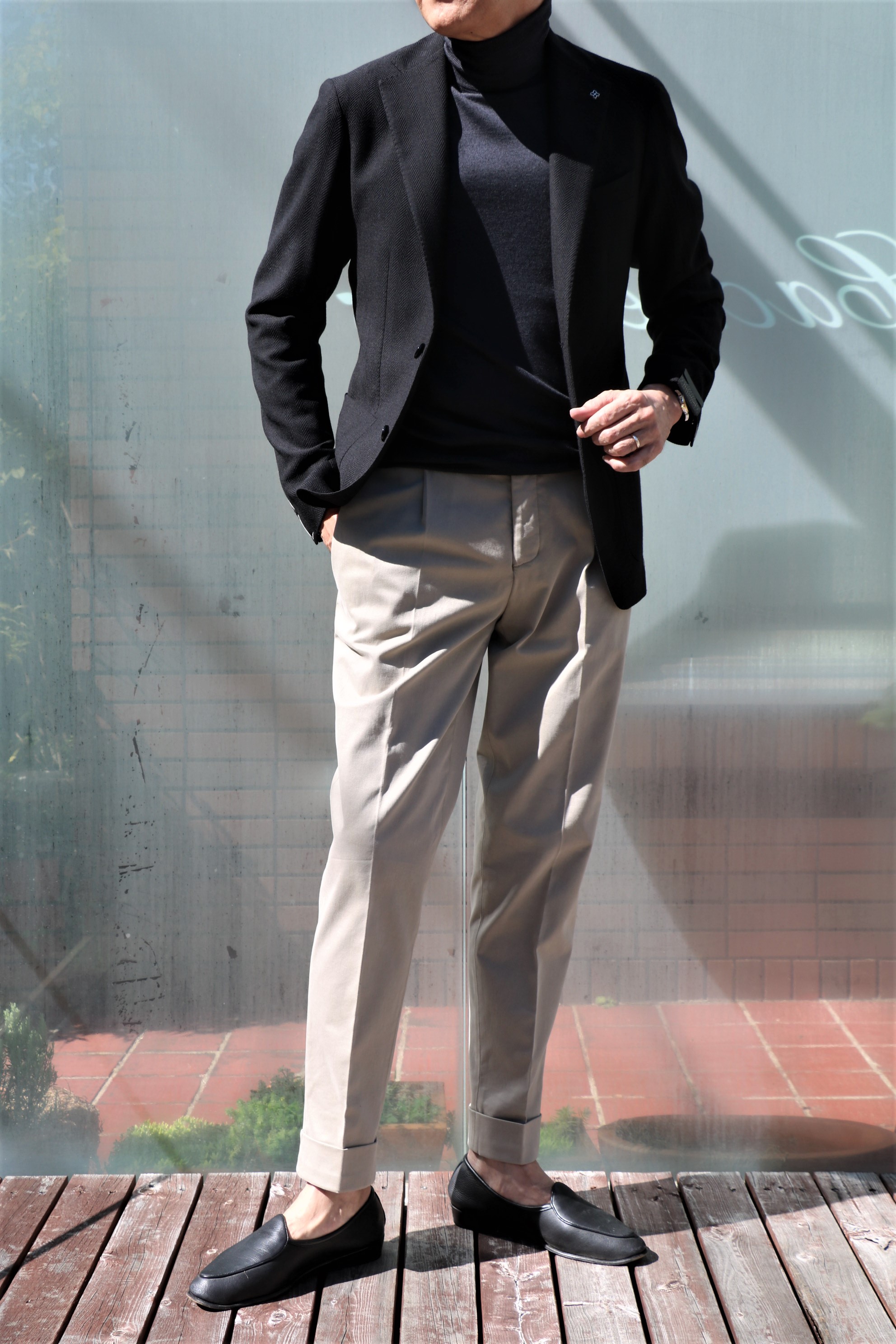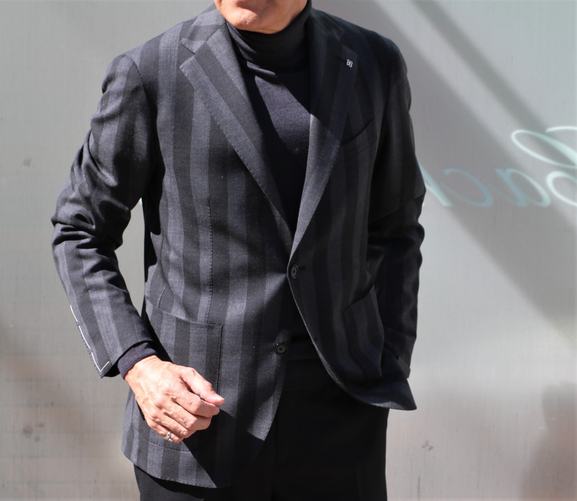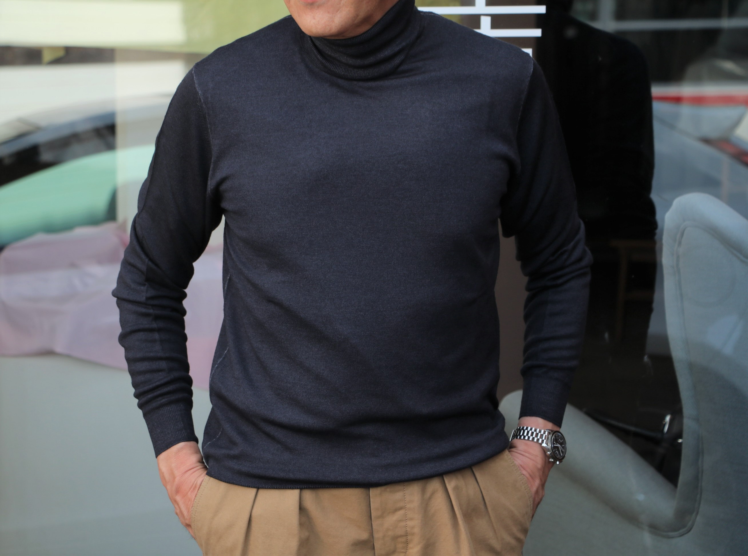 2つのジャケットに合わせたニットはFEDELI(フェデーリ)のタートルネック。光に当たると、ほんのり青みがでるダークグレイです。ブラックよりは優しいVゾーンを作り出します。揃えておかれると、縁の下の力持ち的な存在として、活躍するはずです。