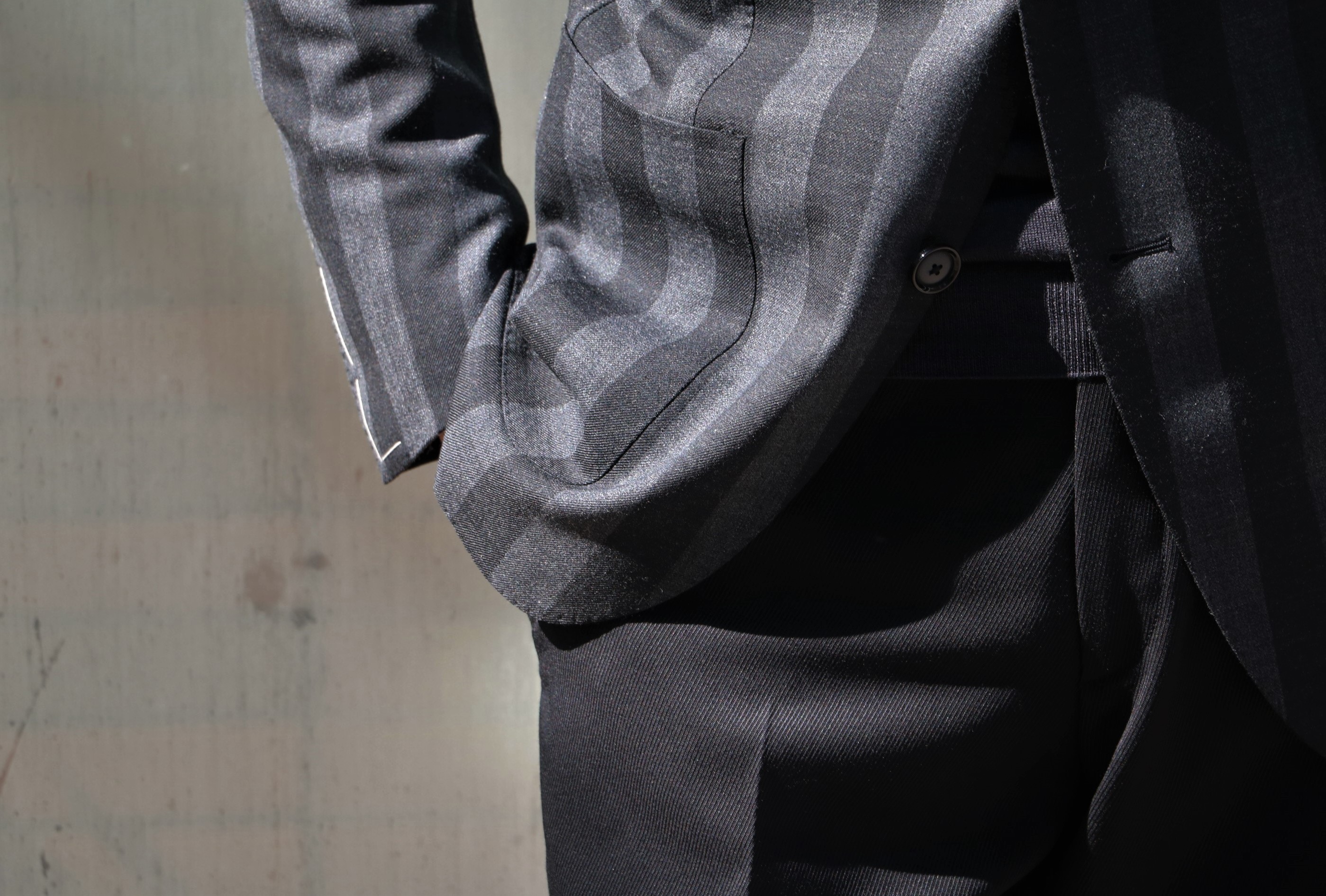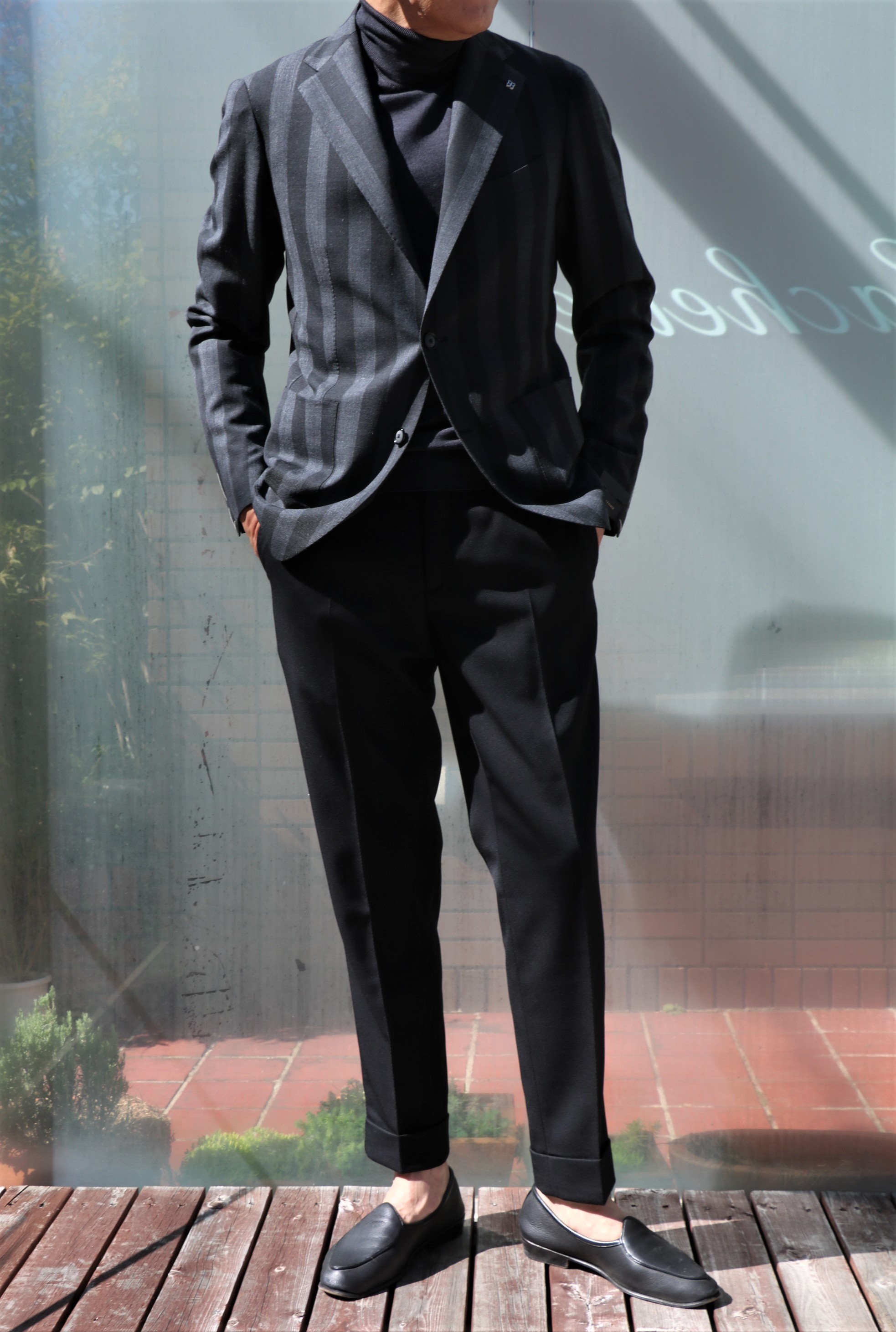 ボールドストライプ柄のジャケットなら、やはりボトムはブラックを穿きたくなります。ここで選んだのは、カルゼのウールパンツ。スポーティーでエレガントな表情をもつパンツです。後日のご案内です。