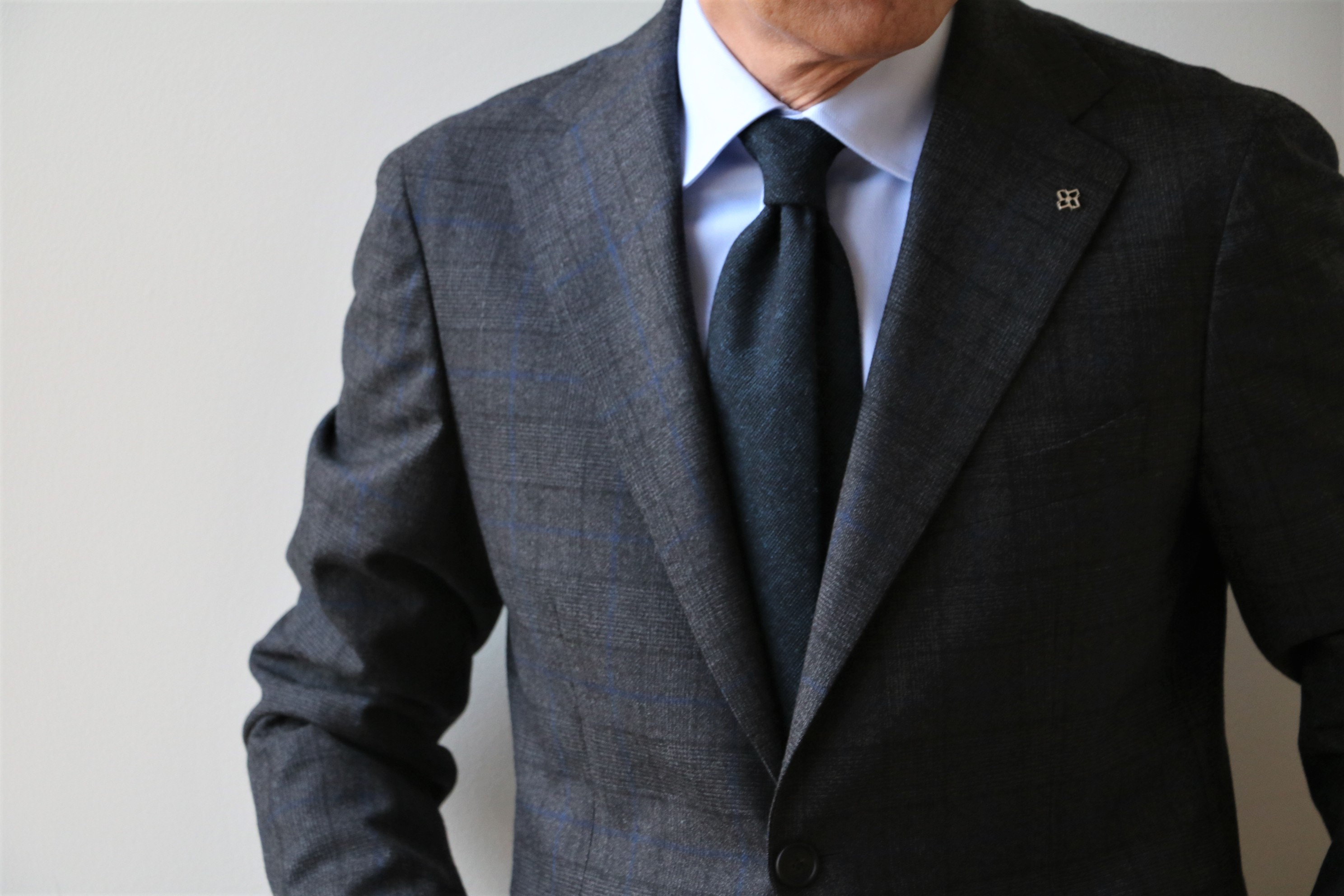 ダークブルーを締めたのは、TAGLIATORE(タリア トーレ)のグレンチェック柄スーツ。ブルーのオーバーペンに色を合わせています。シャツはMaria Santangelo(マリア サンタンジェロ)です。