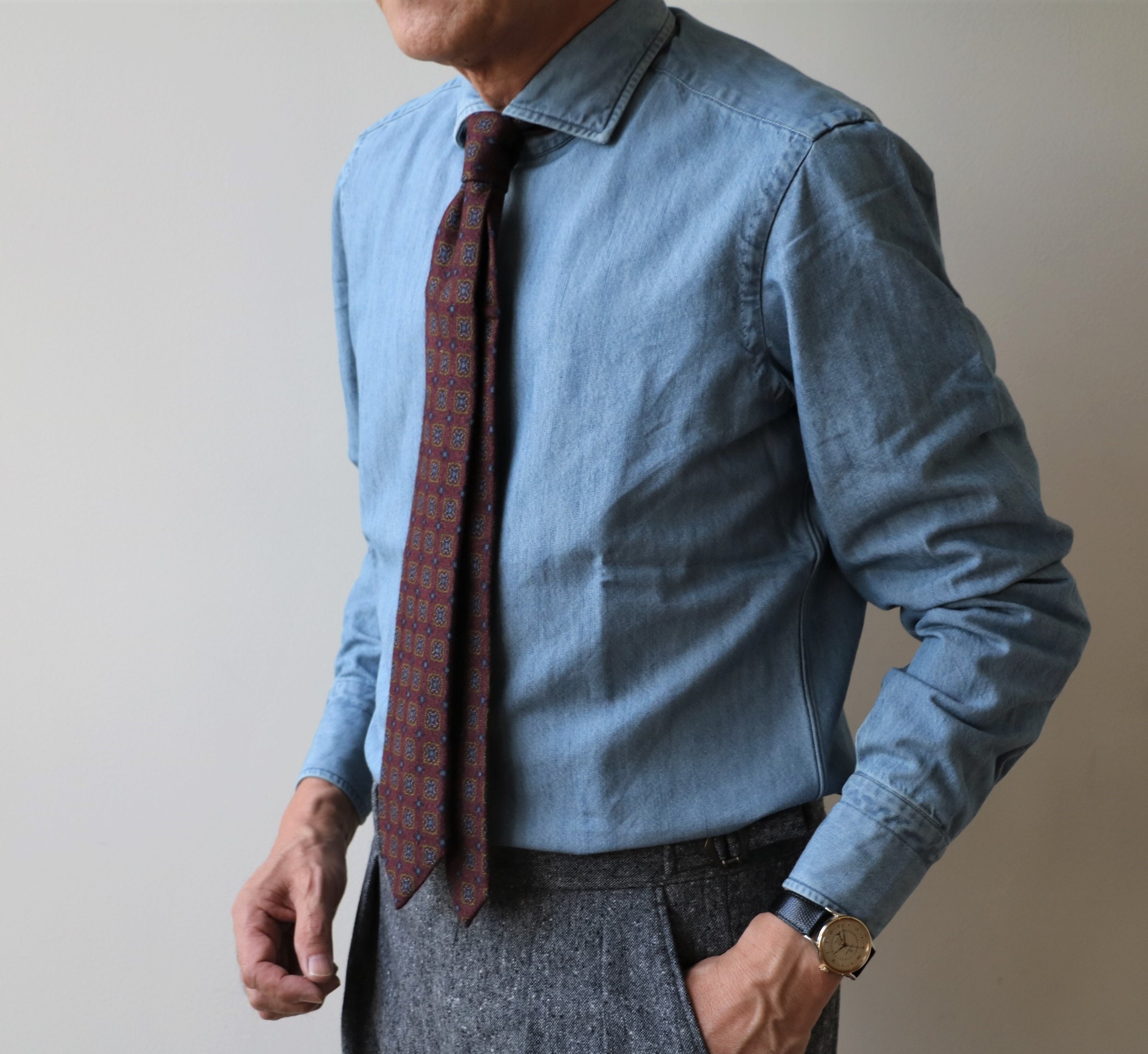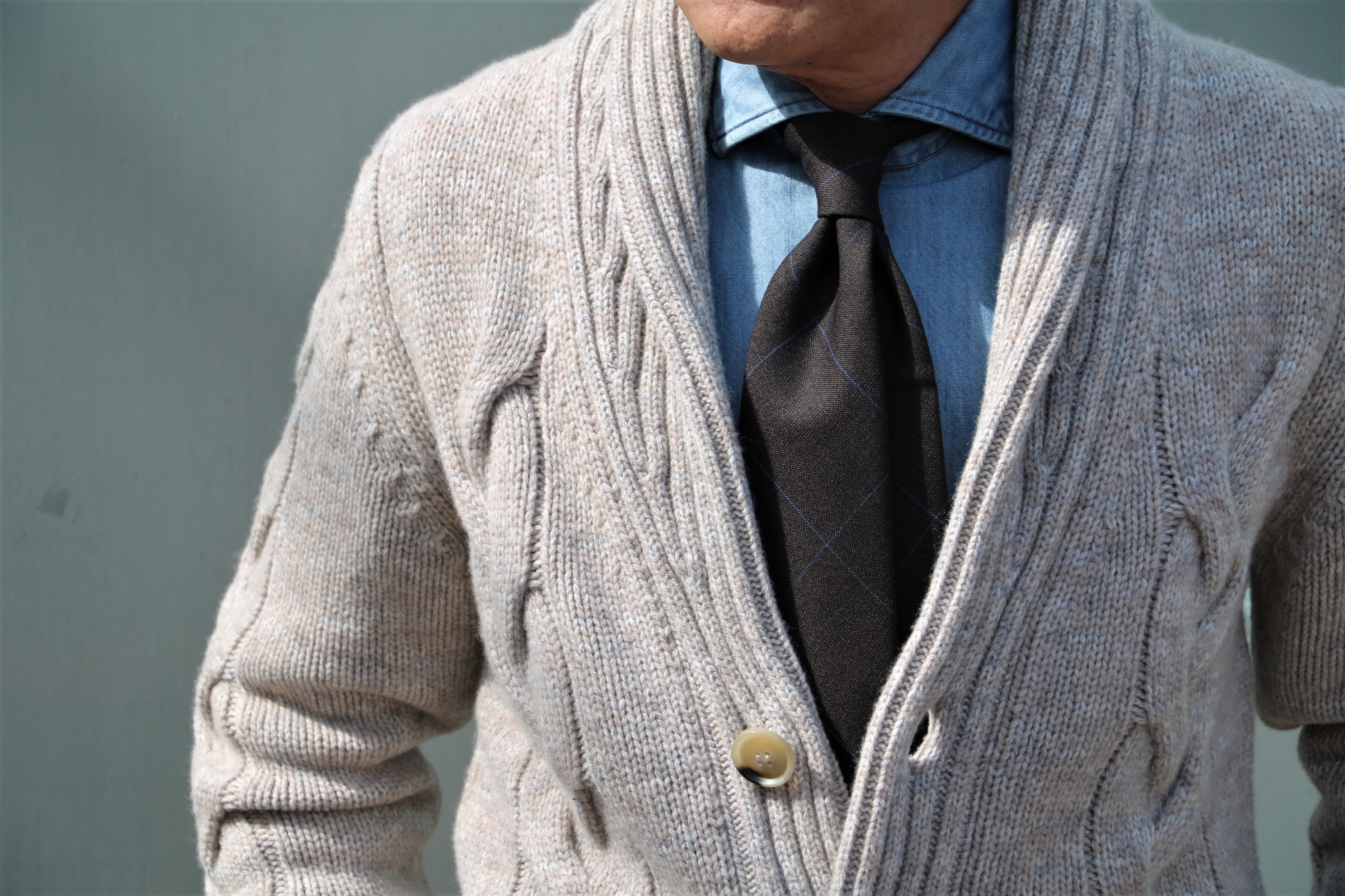 生地を見ているだけで、ときめいてしまうビジのネクタイ。迷わず選んだのが、ダークなグレイとブルーのウールタイ。メランジがシックで奥行きのあるVゾーンを作り出します。