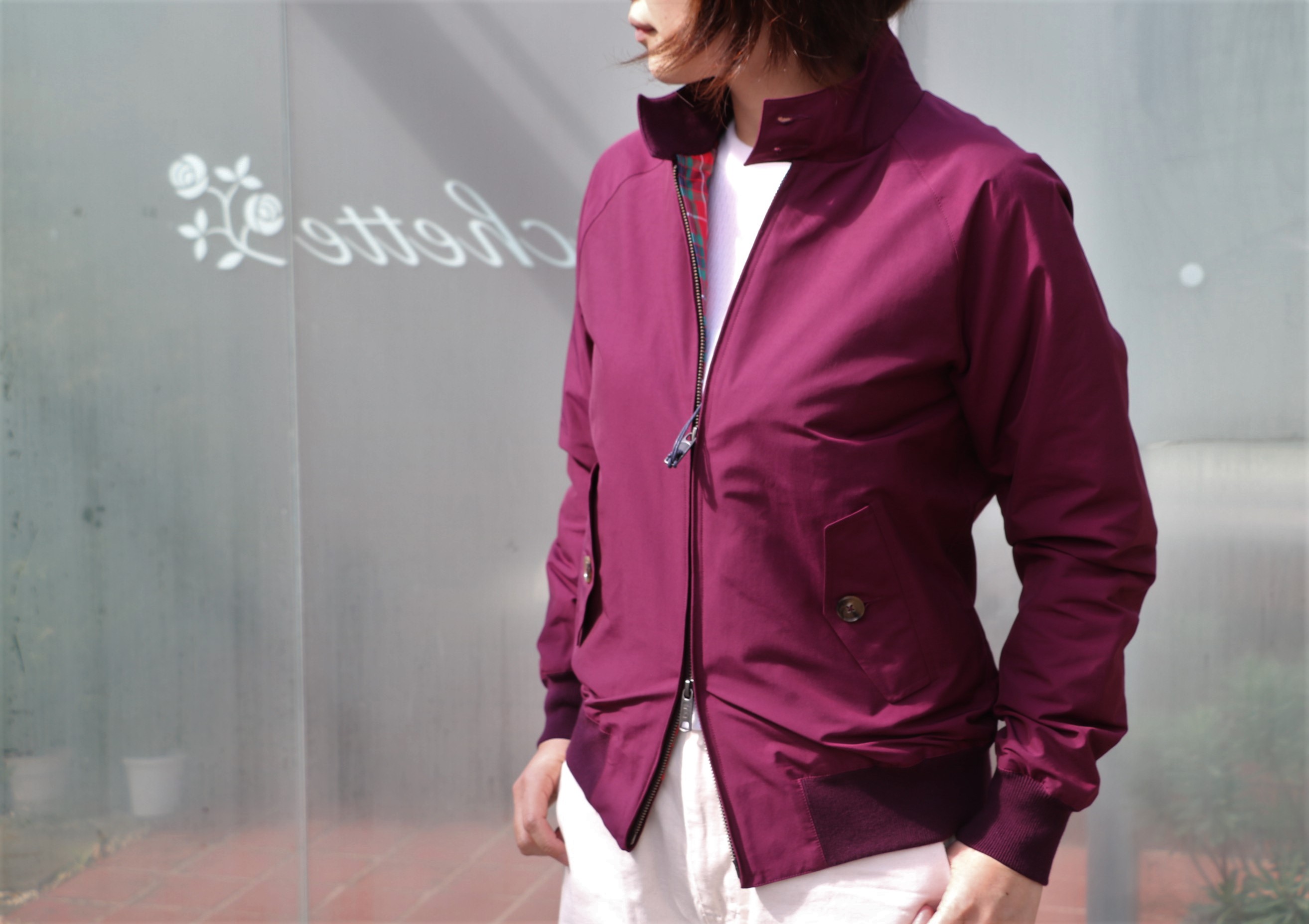 レディースも展開してみたいね...なんて会話から、モデルのマヤさんに着てもらうことに。新色のグレープワインです。彼女はサイズ36。やや袖が長くなりますが、後はジャストサイズ。ラグランスリーブですので、肩幅も気になりません。とてもきれいな色です。