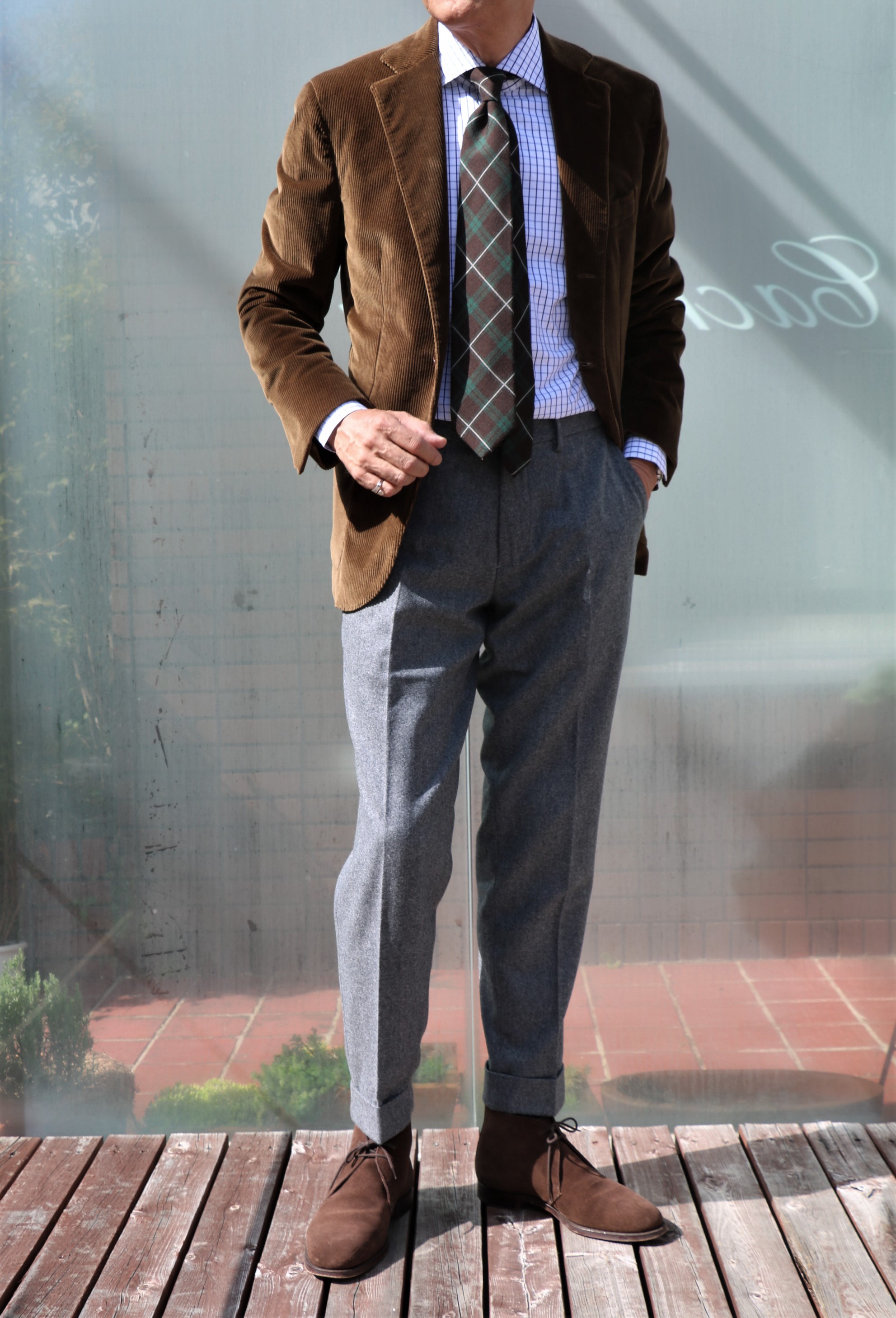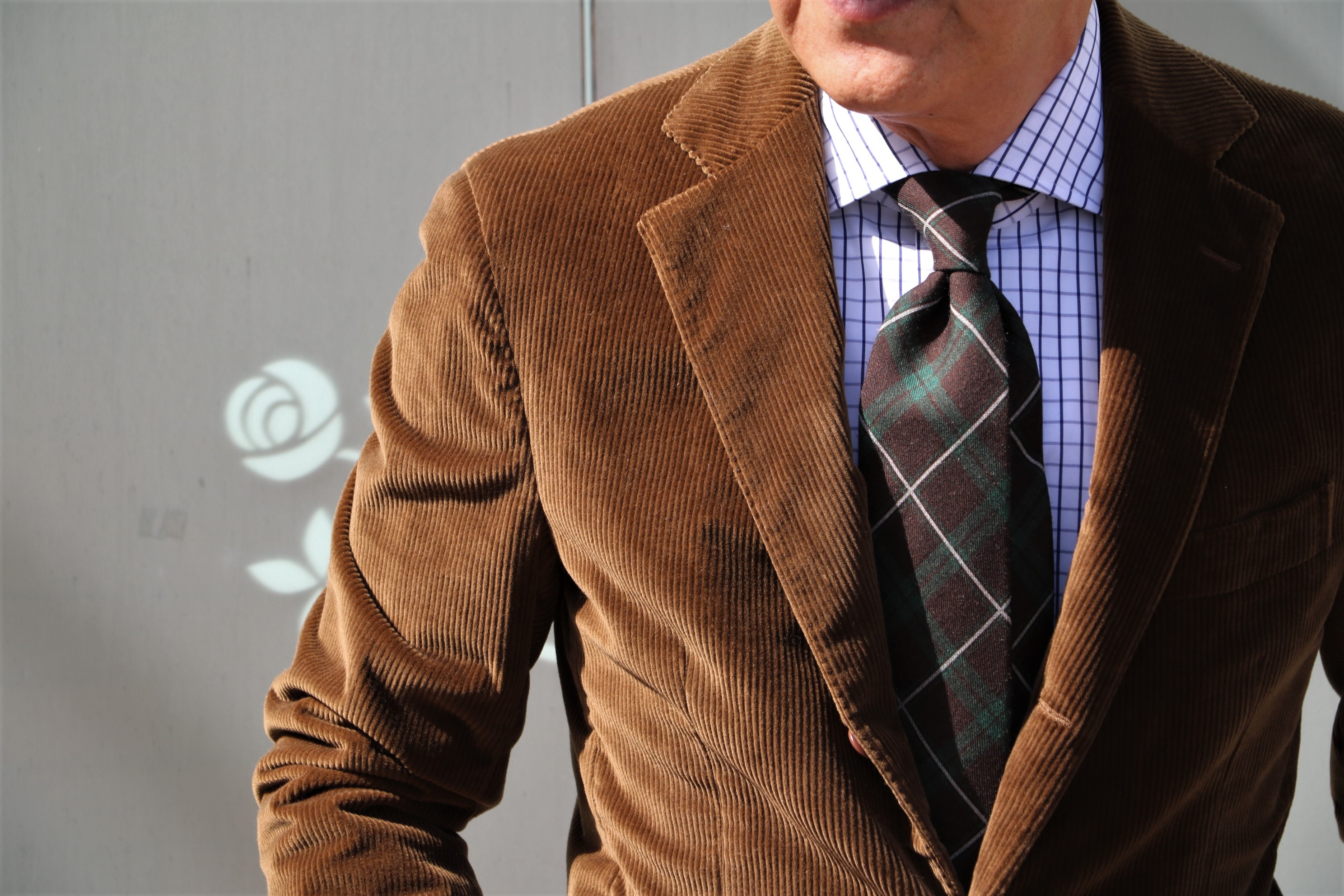 気合が入り、全身コーデです。気にかけていたのに、タカイちゃんに先を越されてしまったDe Petorillo(デ ペトリロ)のコーデュロイジャケットに結んでみました。シャツは私物となったAVINO NAPOLI(アヴィーノ ナポリ)のグラフチェック。パンツはマイサイズのみのBorelio(ボレリオ)、靴は私物のCROCKETT&JONES(クロケットアンドジョーンズ)です。