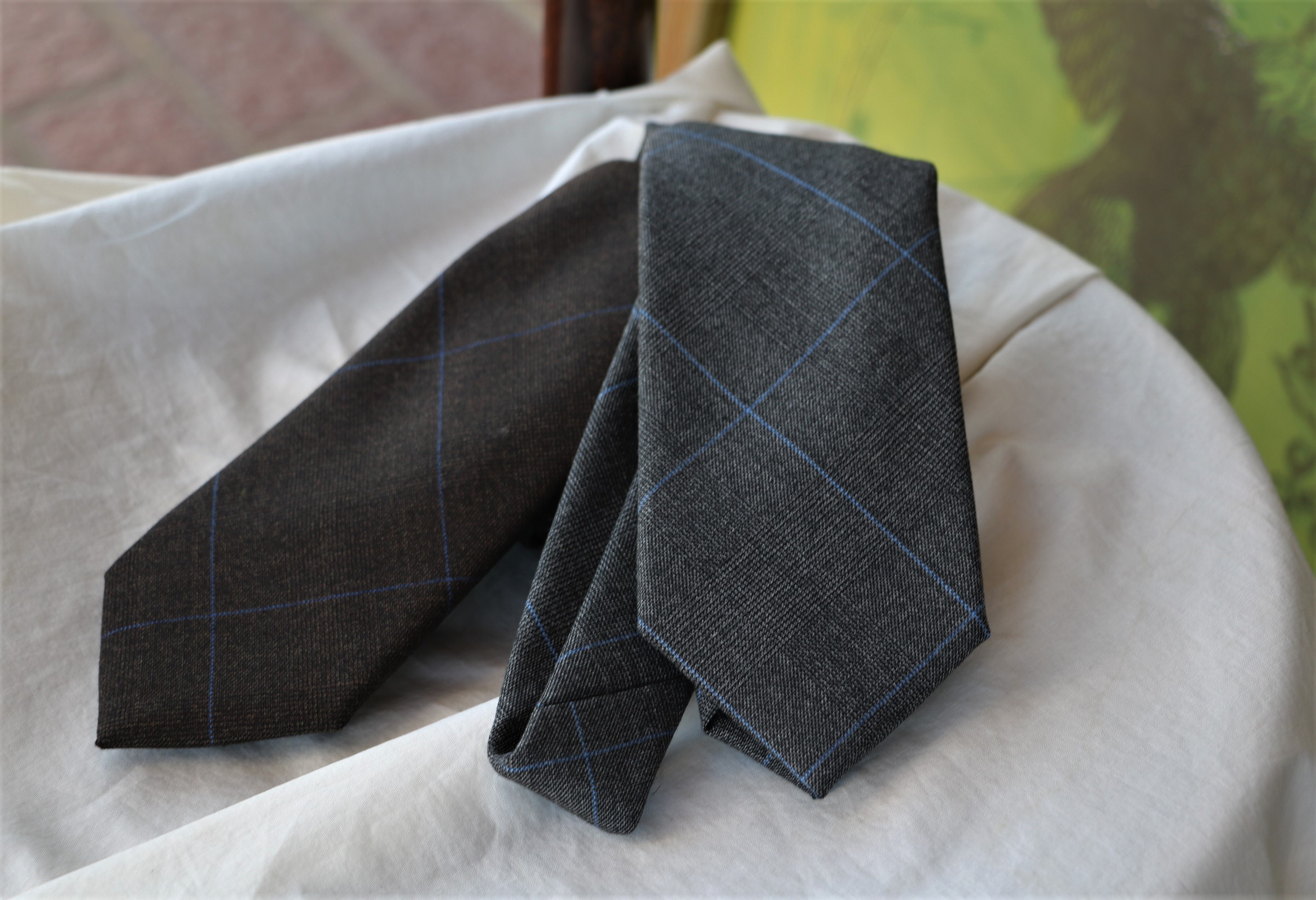 スーツ生地にしたら、素敵な出来映えになるだろう...なんて思いながらセレクトしたのは、グレンチェックにオーバーペンの入ったウールタイ。シックなブラウンとグレイにサックスブルーがアクセントです。ブルーが入ることで、地味になり過ぎず、シャツの色と調和しながら、Vゾーンをシックにまとめ上げます。