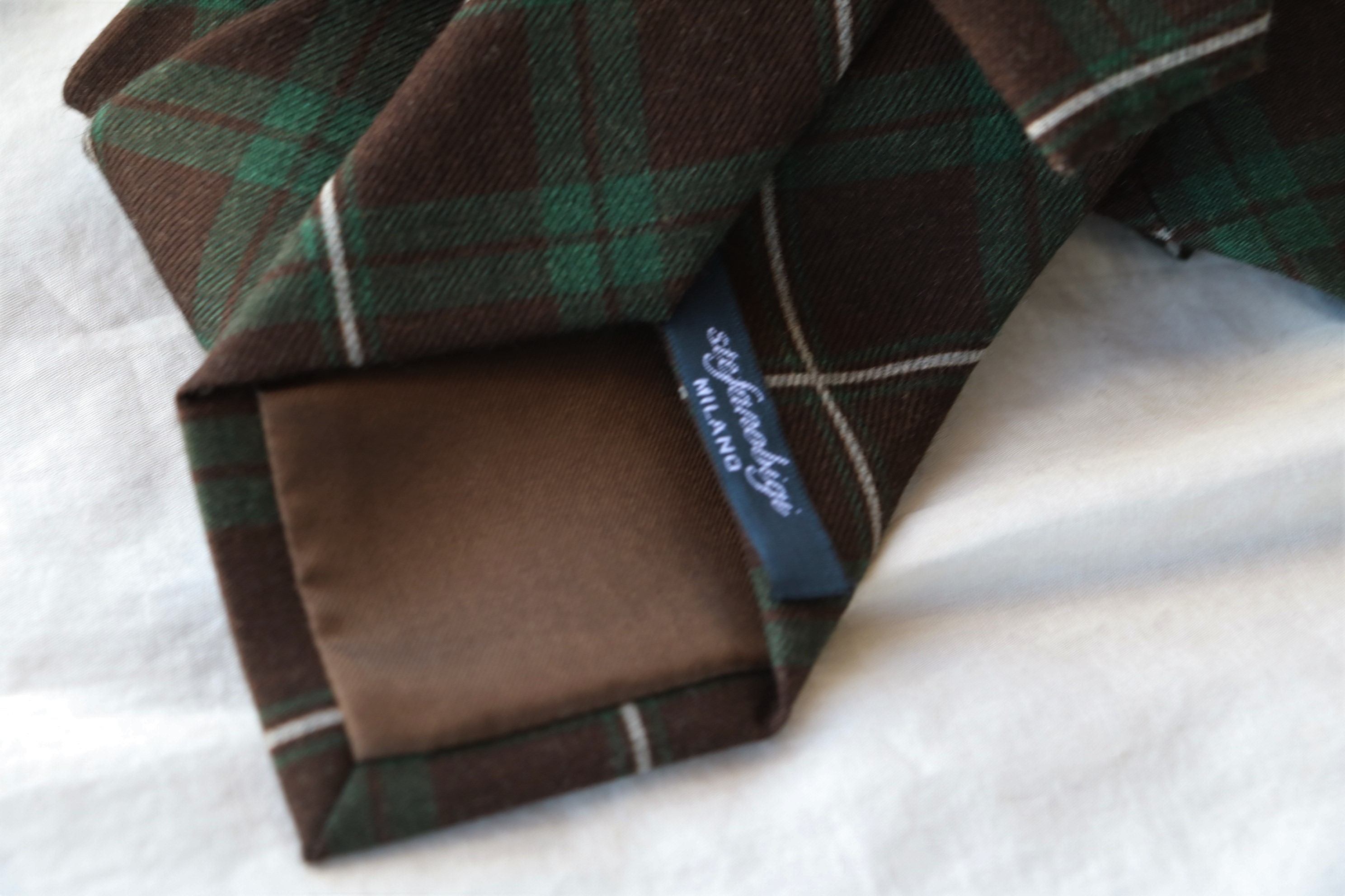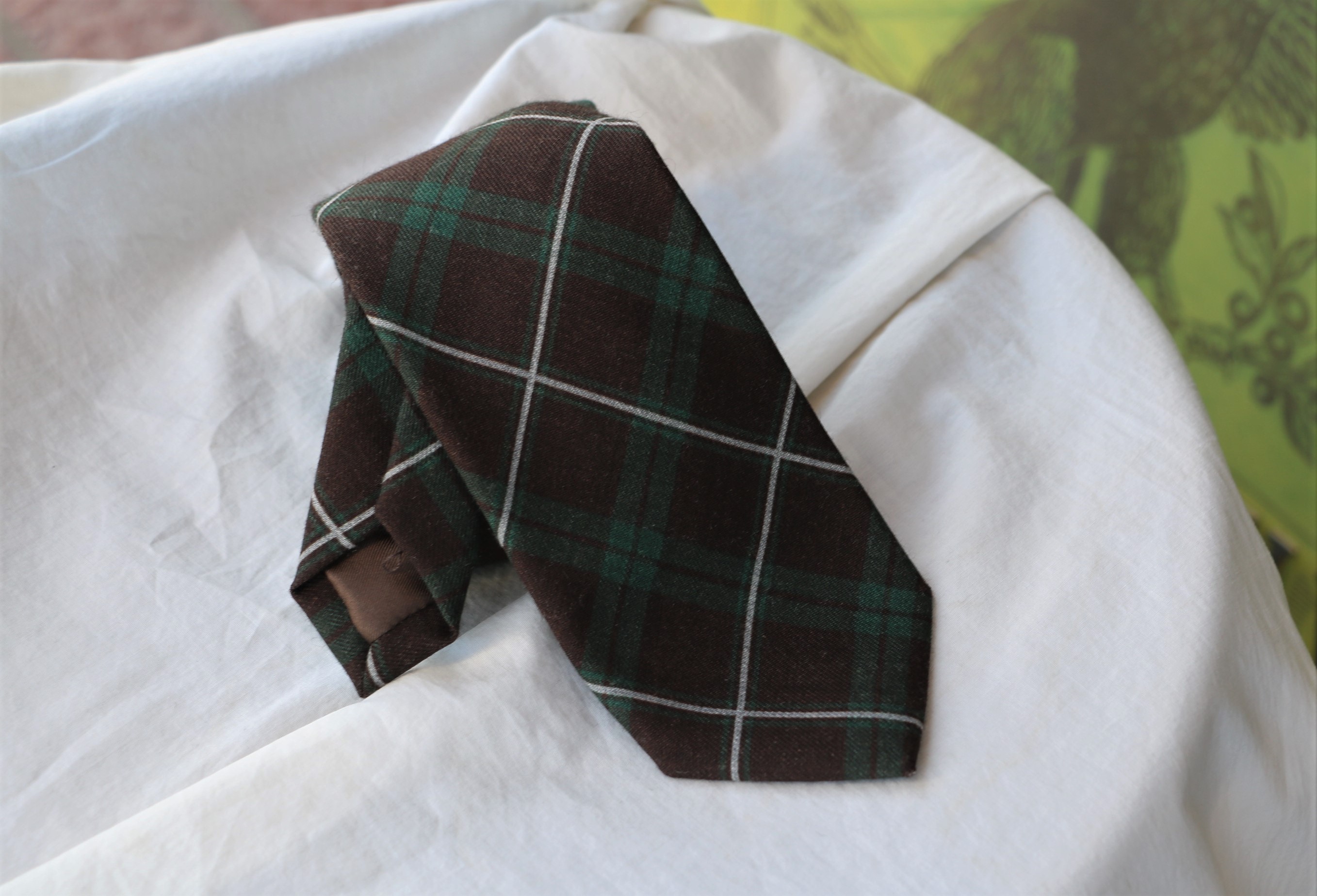 ブラウンとグリーンのチェックにライトグレイのペンを配したカントリー調のネクタイ。ウール100%ですが起毛感は少なく、もたつきのない締めやすさが魅力です。