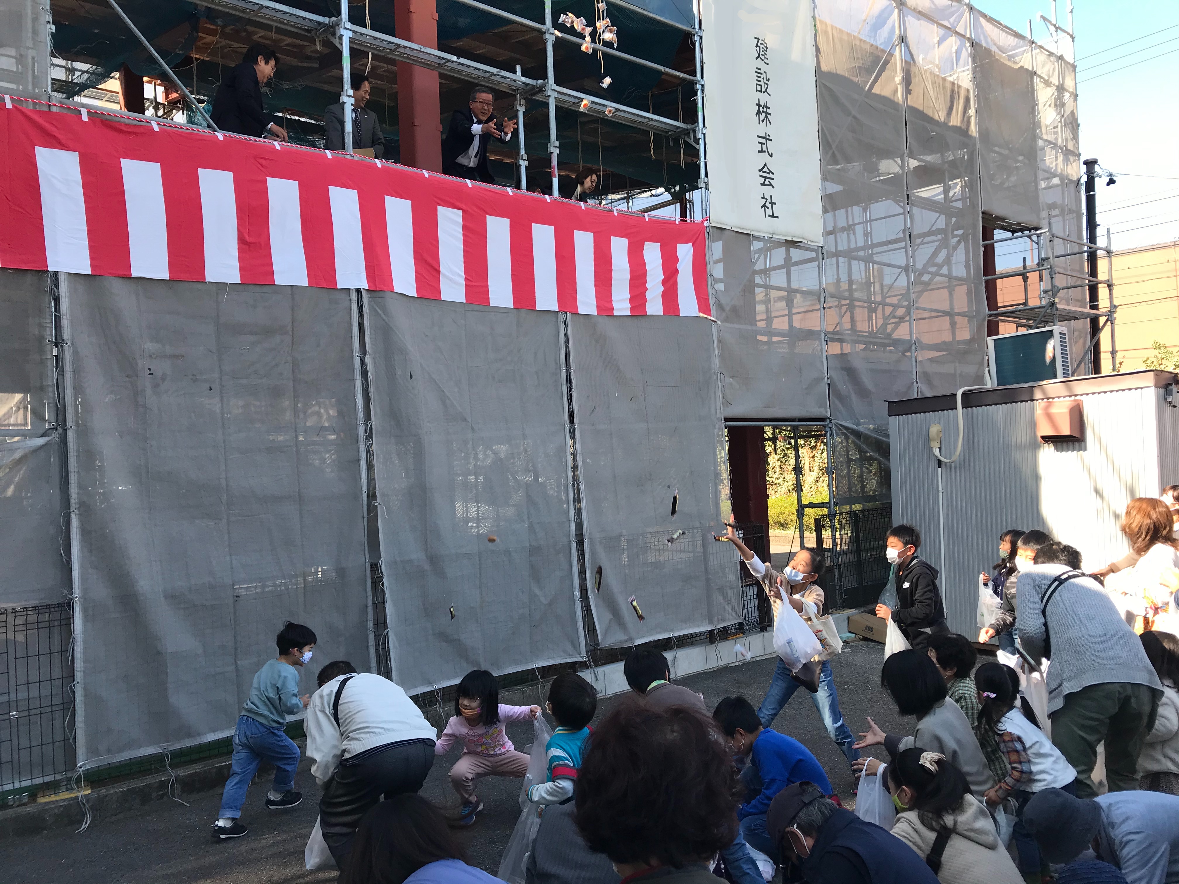 現在、GLORY GUYの裏手で建設中の建物は、ここ竜美ヶ丘ガーデンプレイスのガレージ兼住居とのこと。新築で建物を立てる際に行う上棟(じょうとう)という工程が無地に終わったことを祝い、大安の本日、近隣の方々を招いて餅投げです。