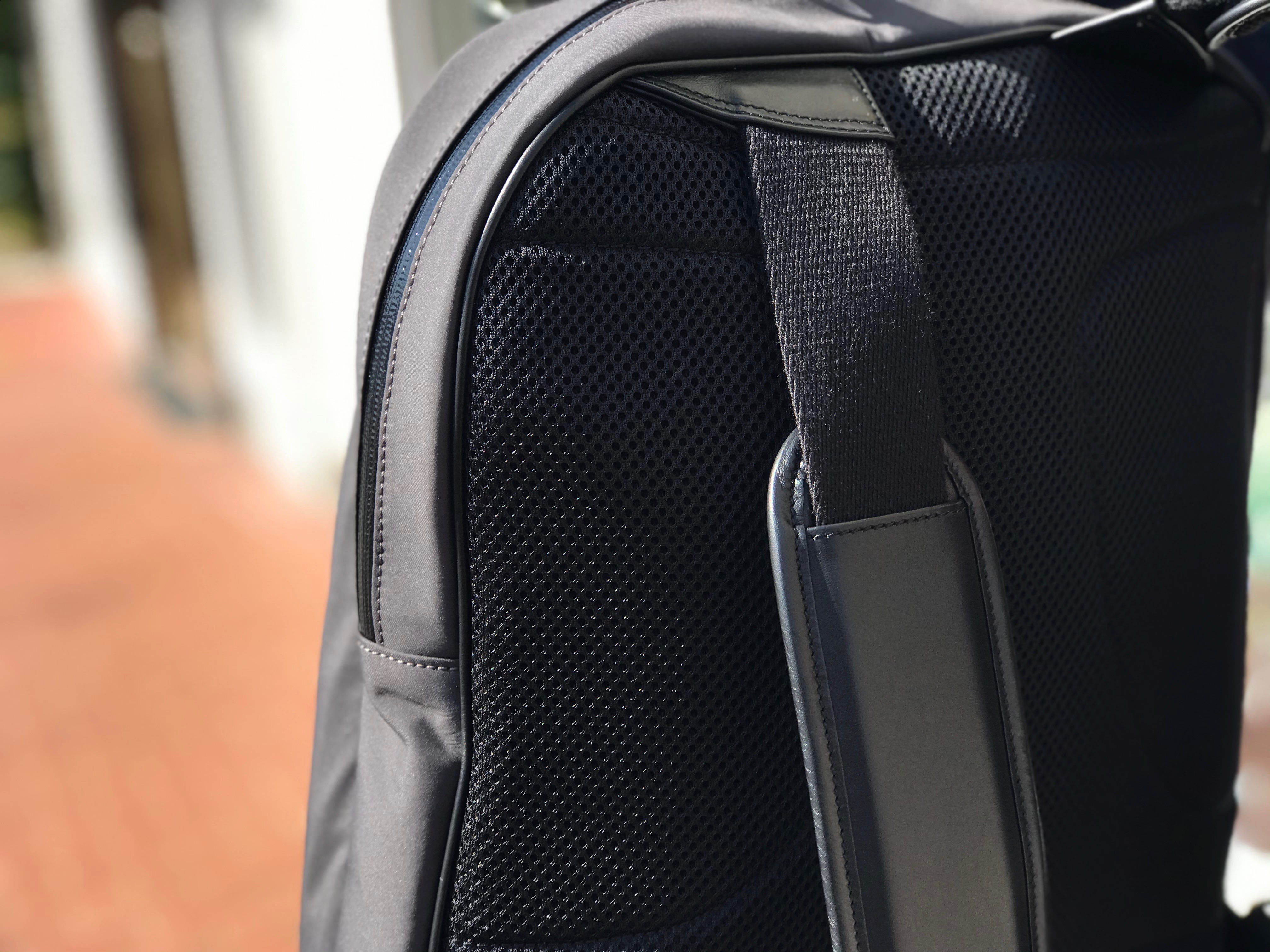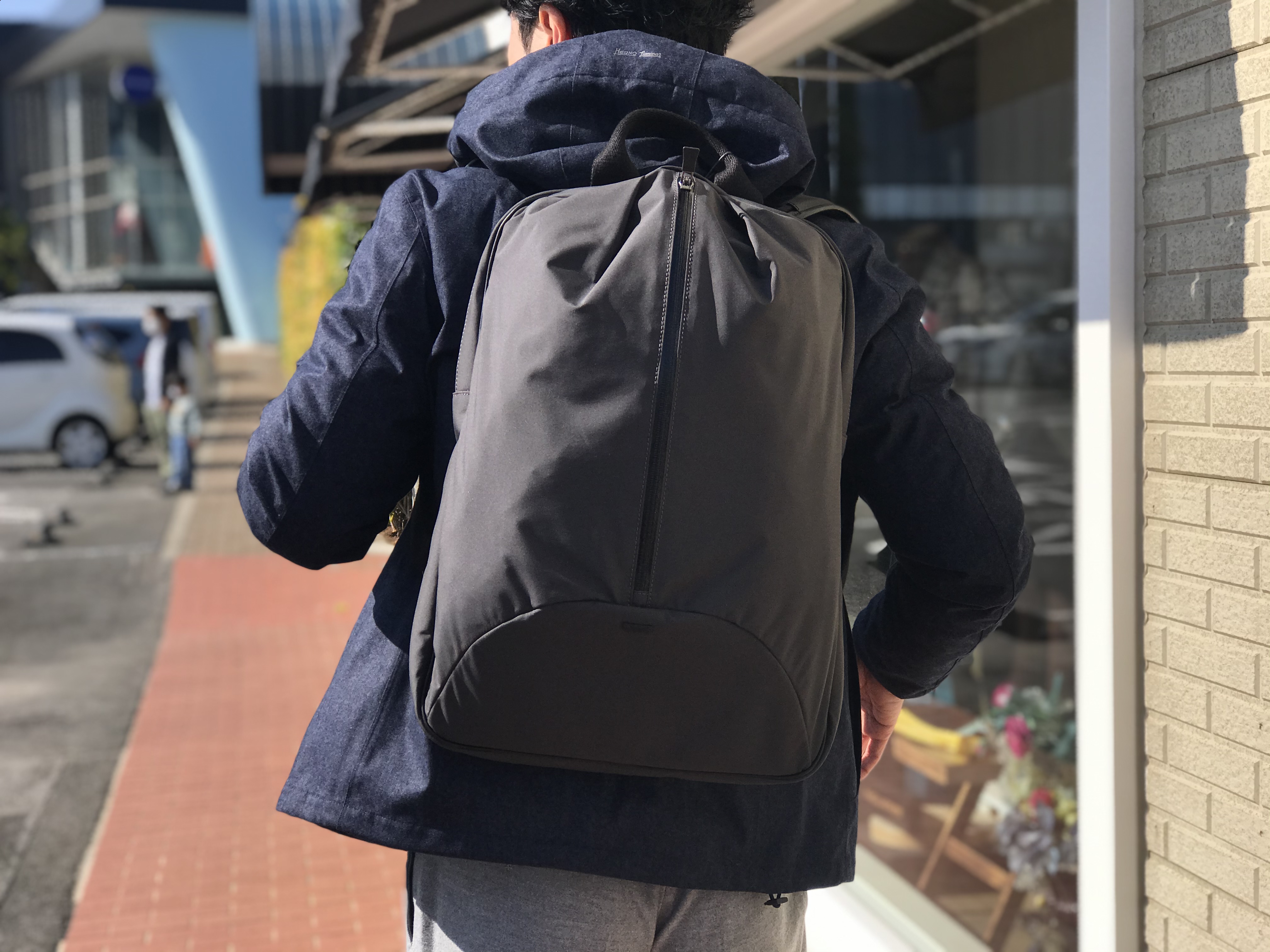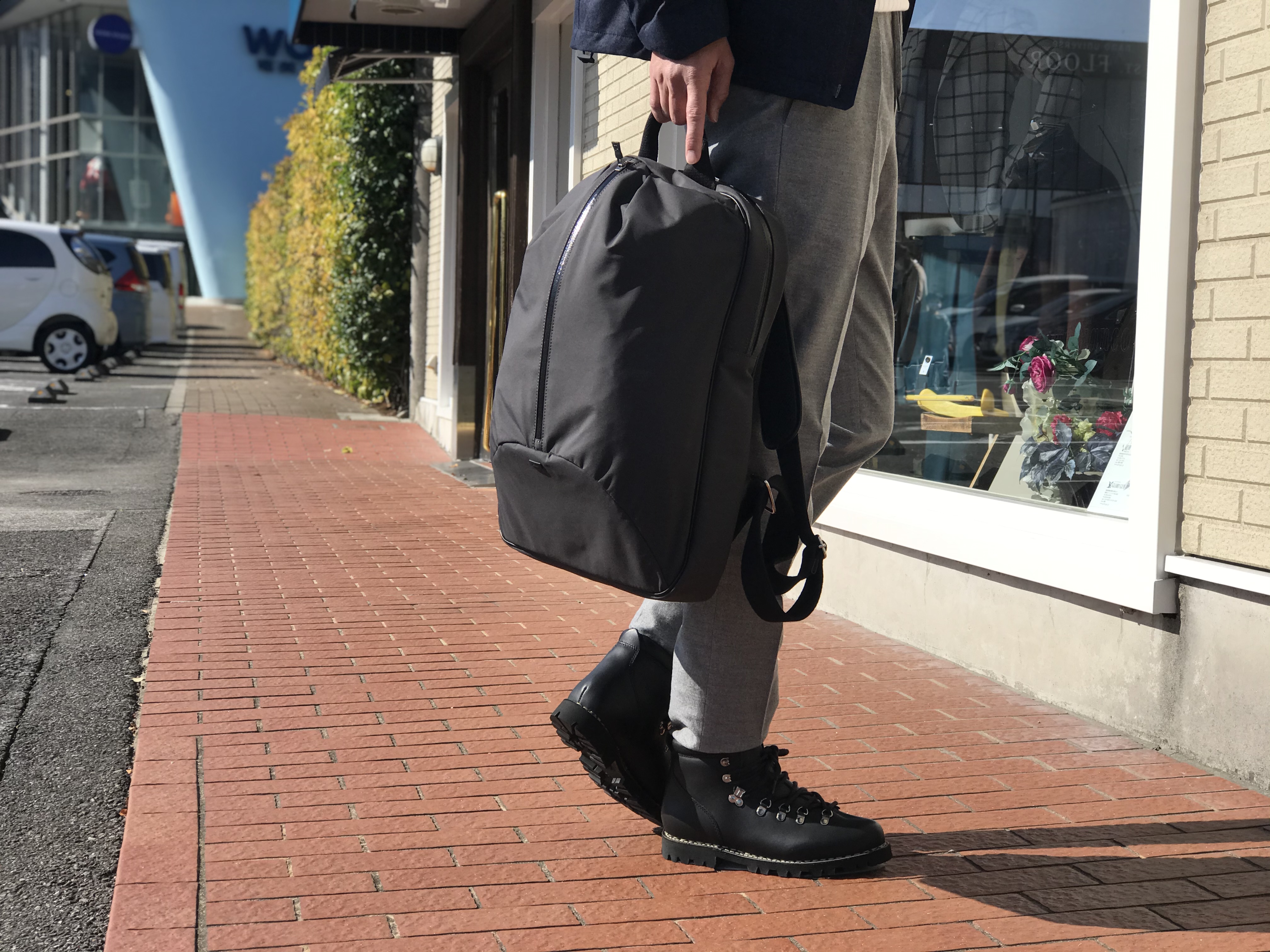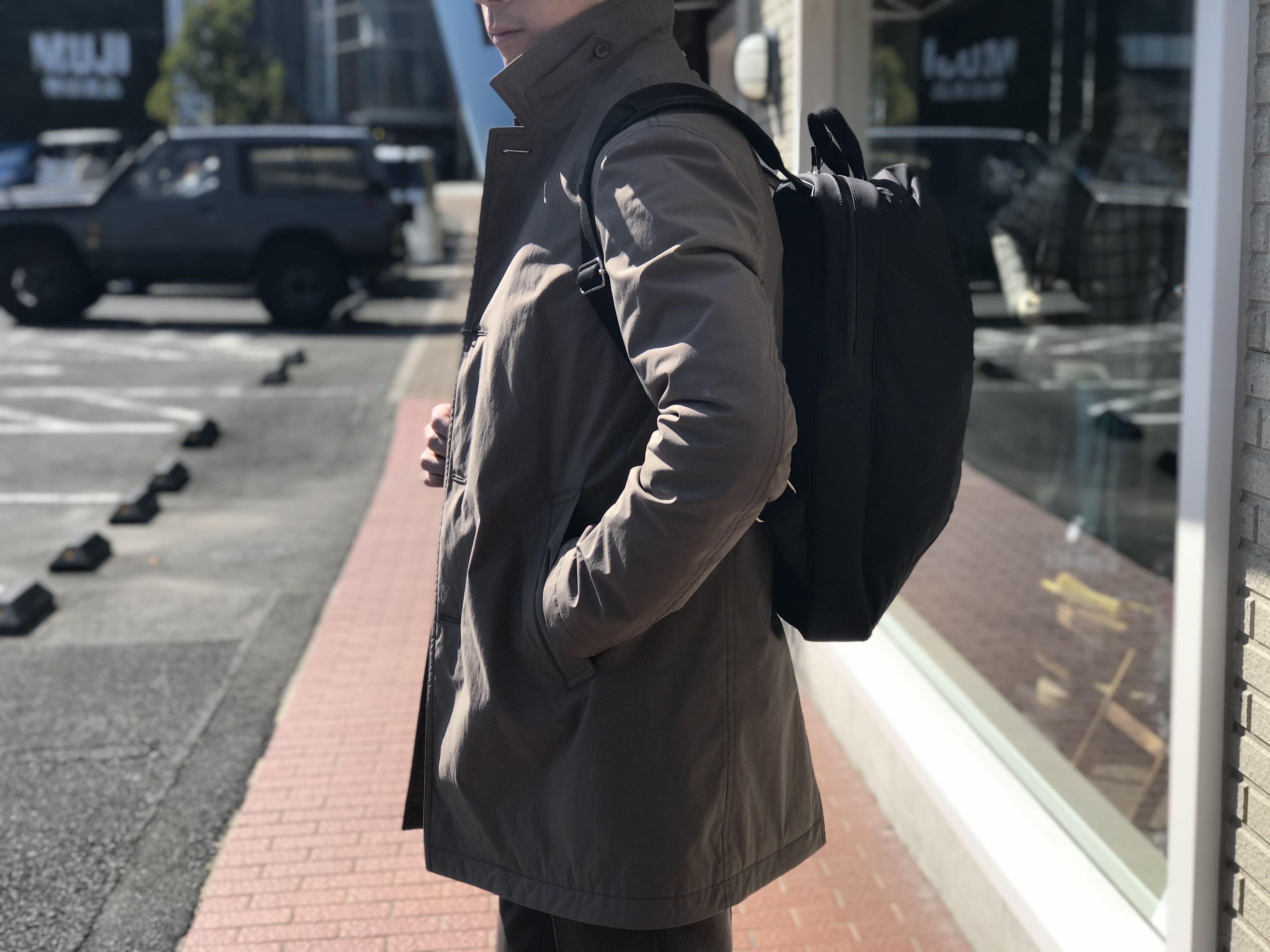 シャープなデザインは、ビジネスシーンでのコート着用時もスタイリッシュに。ベルトは短めに調整し、背中の上の方で背負うのが良いのかと。
