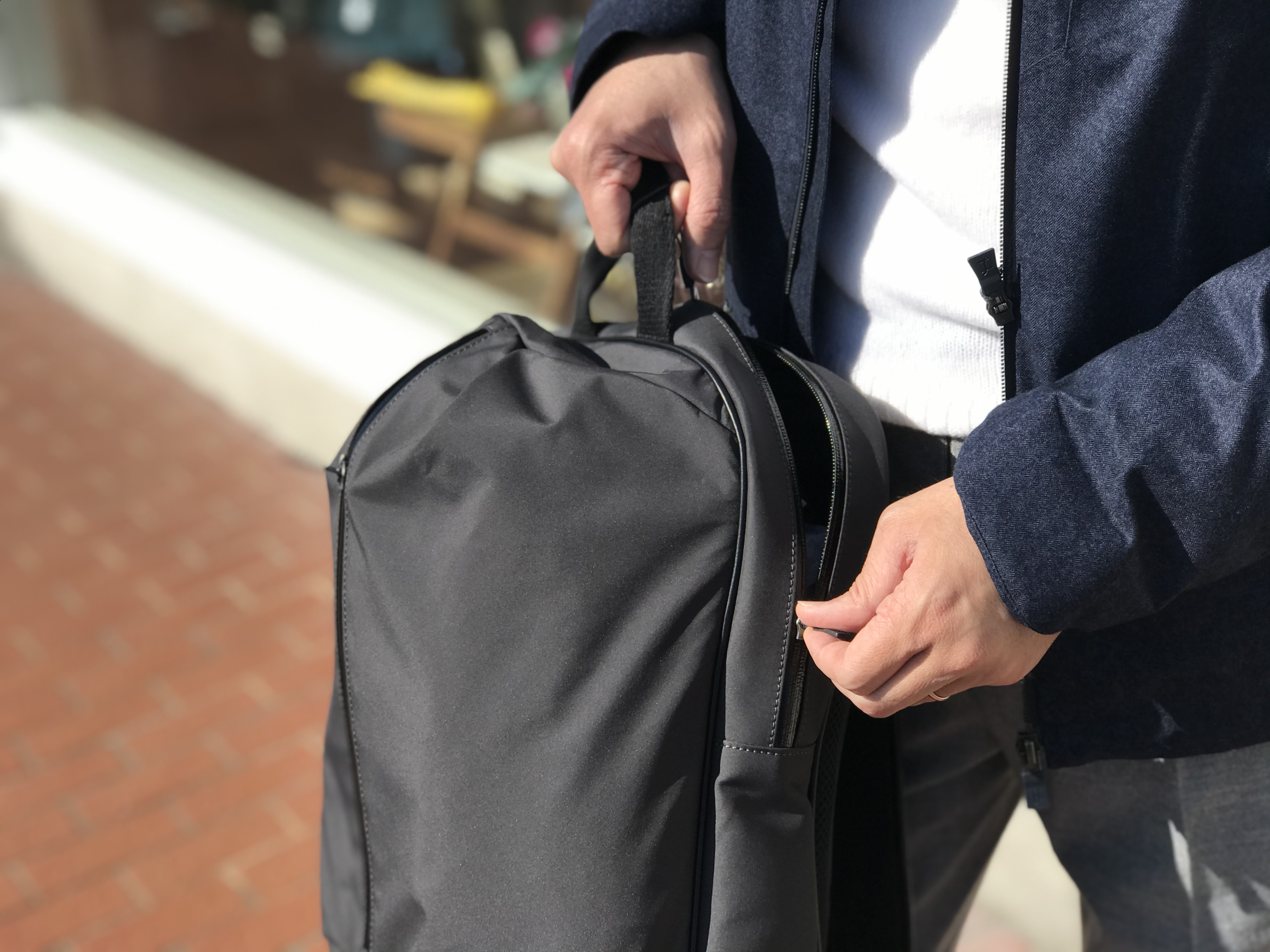 リュックタイプですが、上部に取り付けたベルトで手持ちにも。