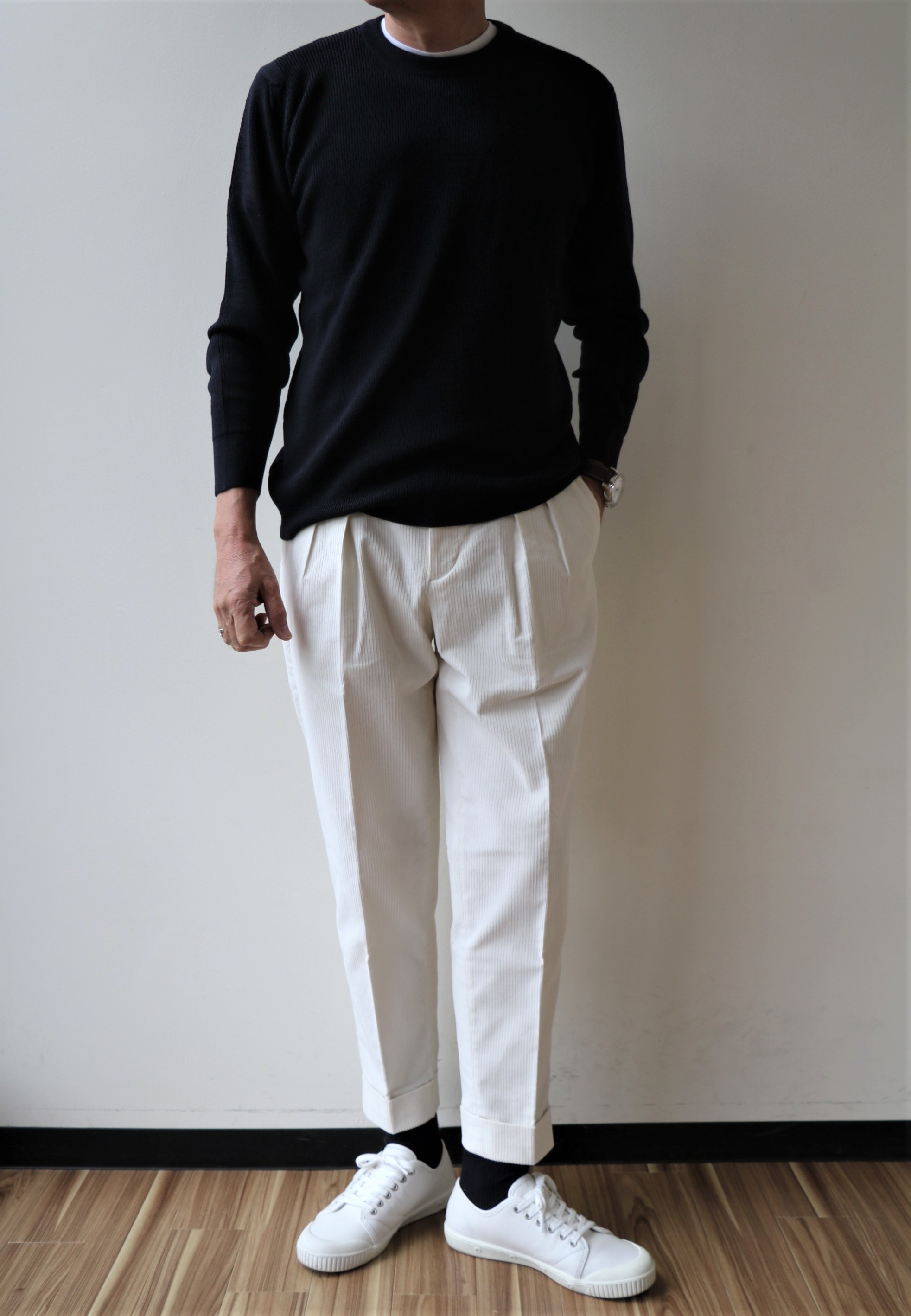 合わせたパンツはPT TORINO(ピーティートリノ)。コーデュロイのキャロットフィットが相性抜群です。靴はParaboot(パラブーツ)のミカエルとSpring Court(スプリングコート)の「G2」でフレンチな足元です。
