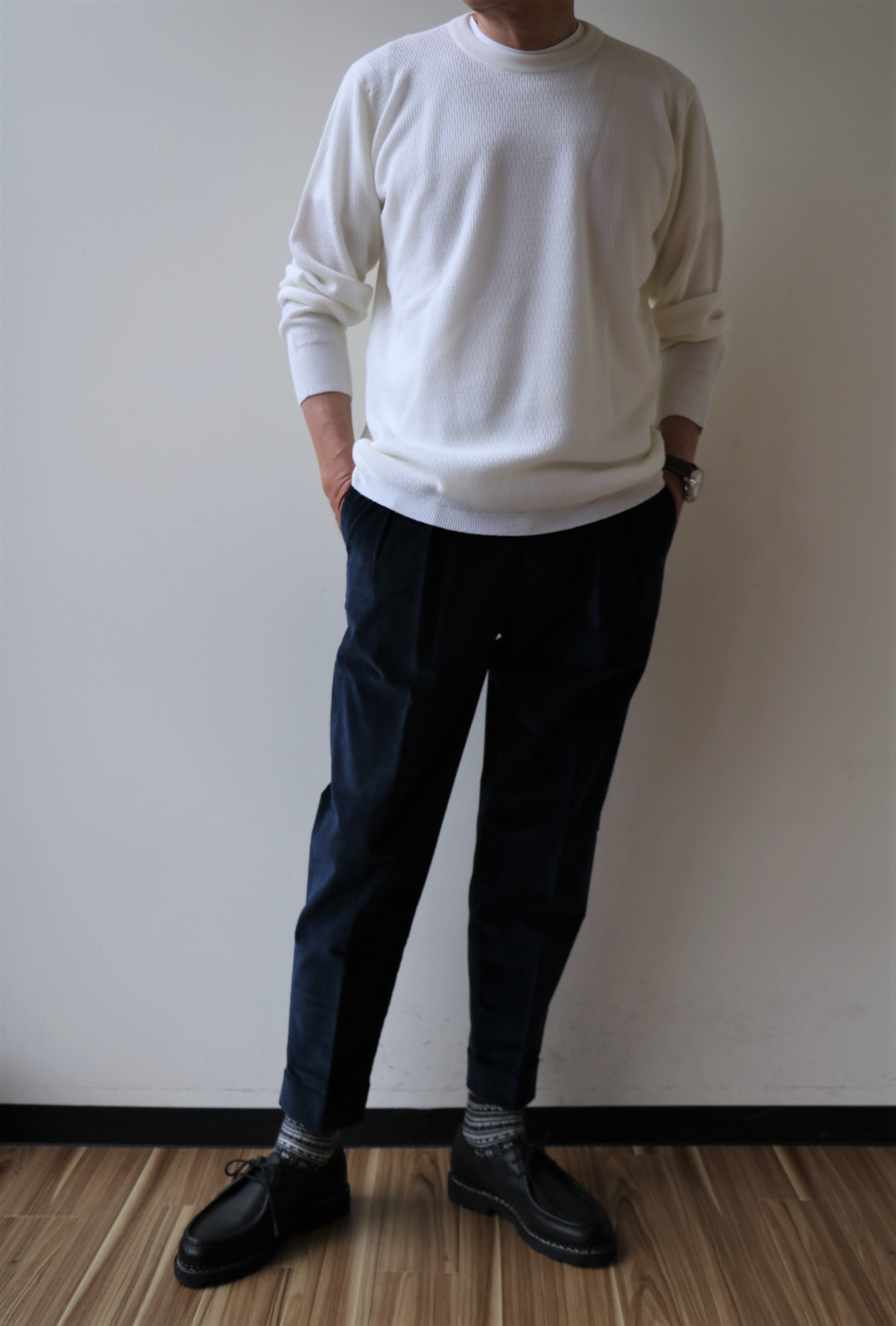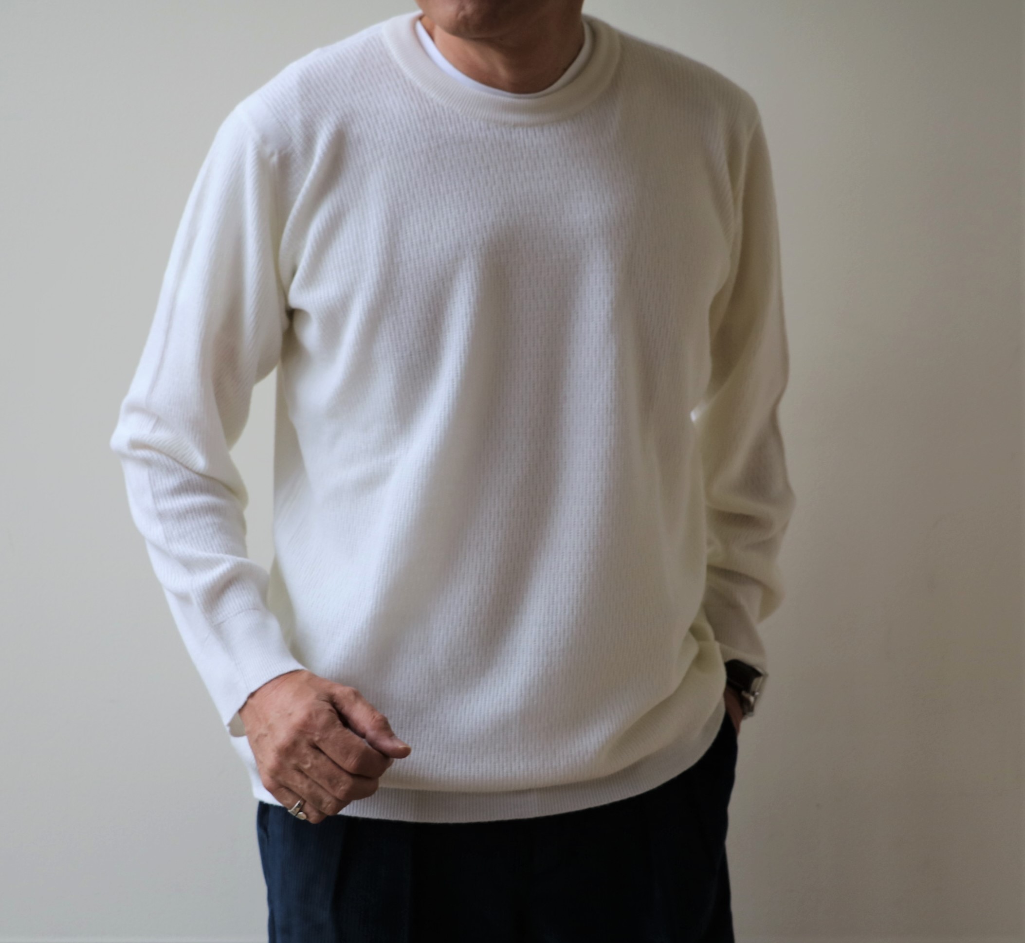 昨日のレディースのブログでもご紹介していたサーマルニット。サーマルとは「熱の、温度の」などを意味する「Themal」が語源。編地の凹凸感が空気の層を作り、保温性を高めてくれるニットをサーマルニットと呼びます。汗ばむ時でも生地の凹凸感による、肌への接地面を減らし、さらりとした着心地を。気温が下がれば、この凹凸感が空気を集め、保温効果を高めてくれます。寒暖差のある季節の変わり目など、重宝することは間違いありません。
