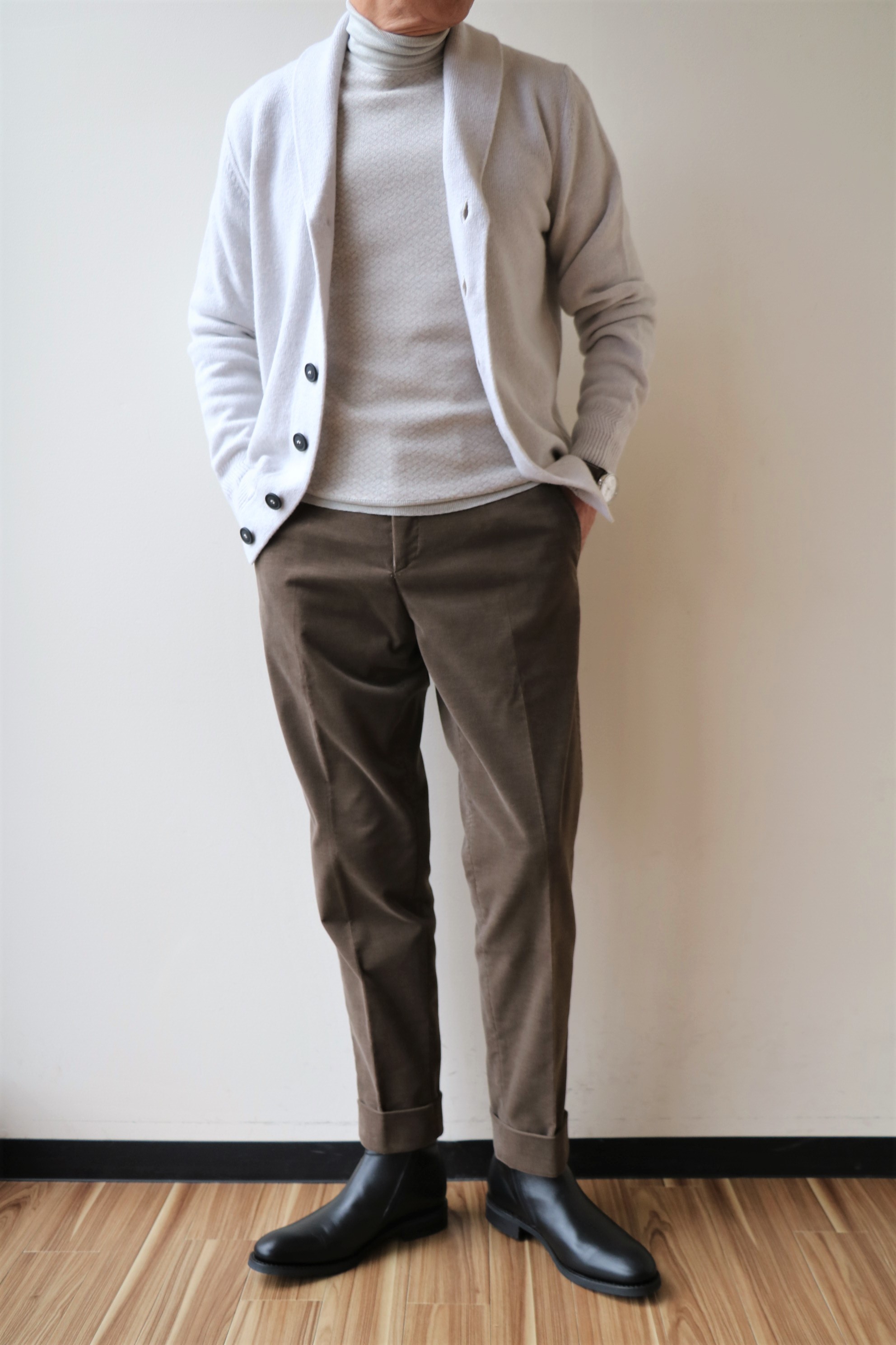 インのニットは後ほど。パンツはBorelio(ボレリオ)のコーデュロイを合わせ、Paraboot(パラブーツ)のブーツを履いております。