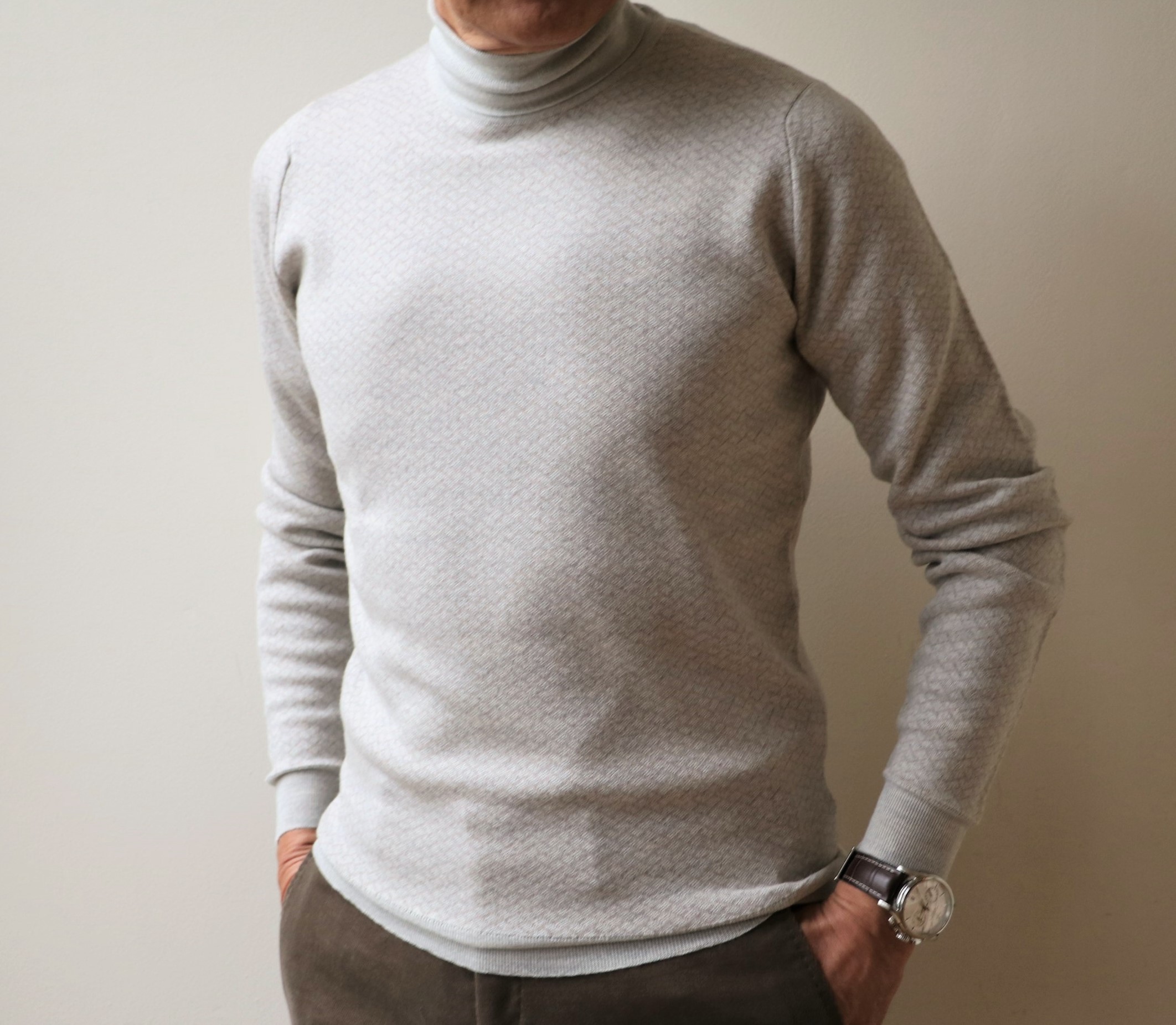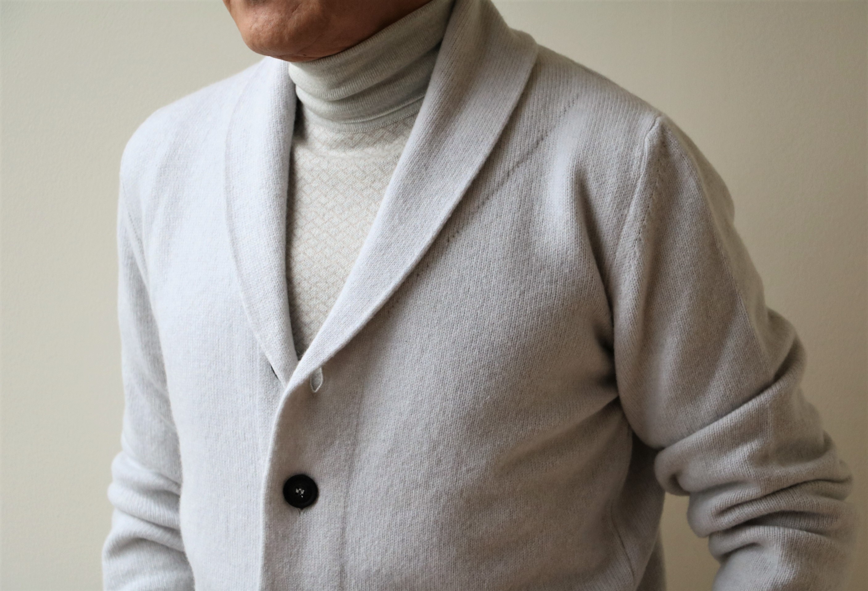 ショールカラーカーディガンのインに合わせたタートルネック。STANDARD FITのモデル「RARE」です。