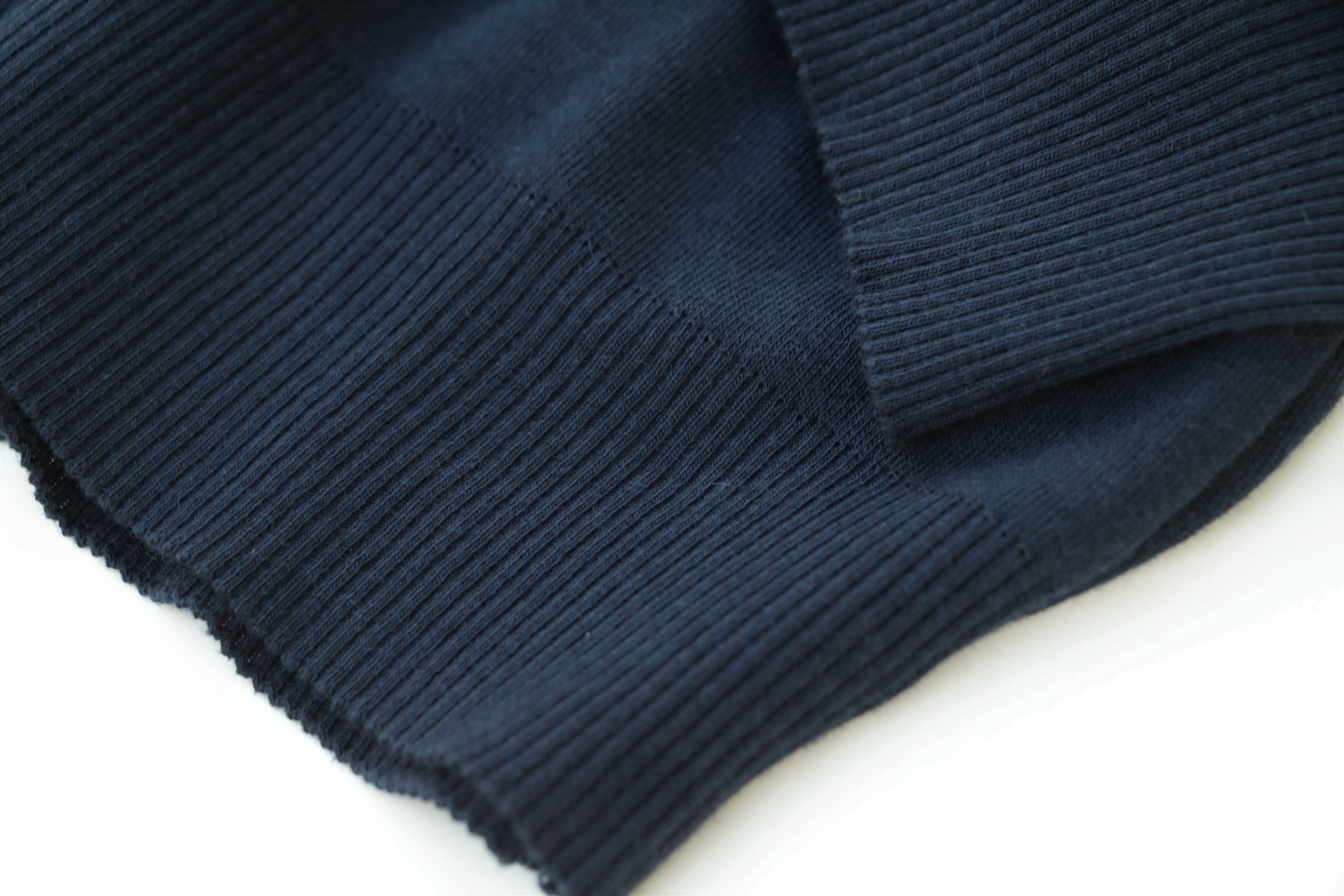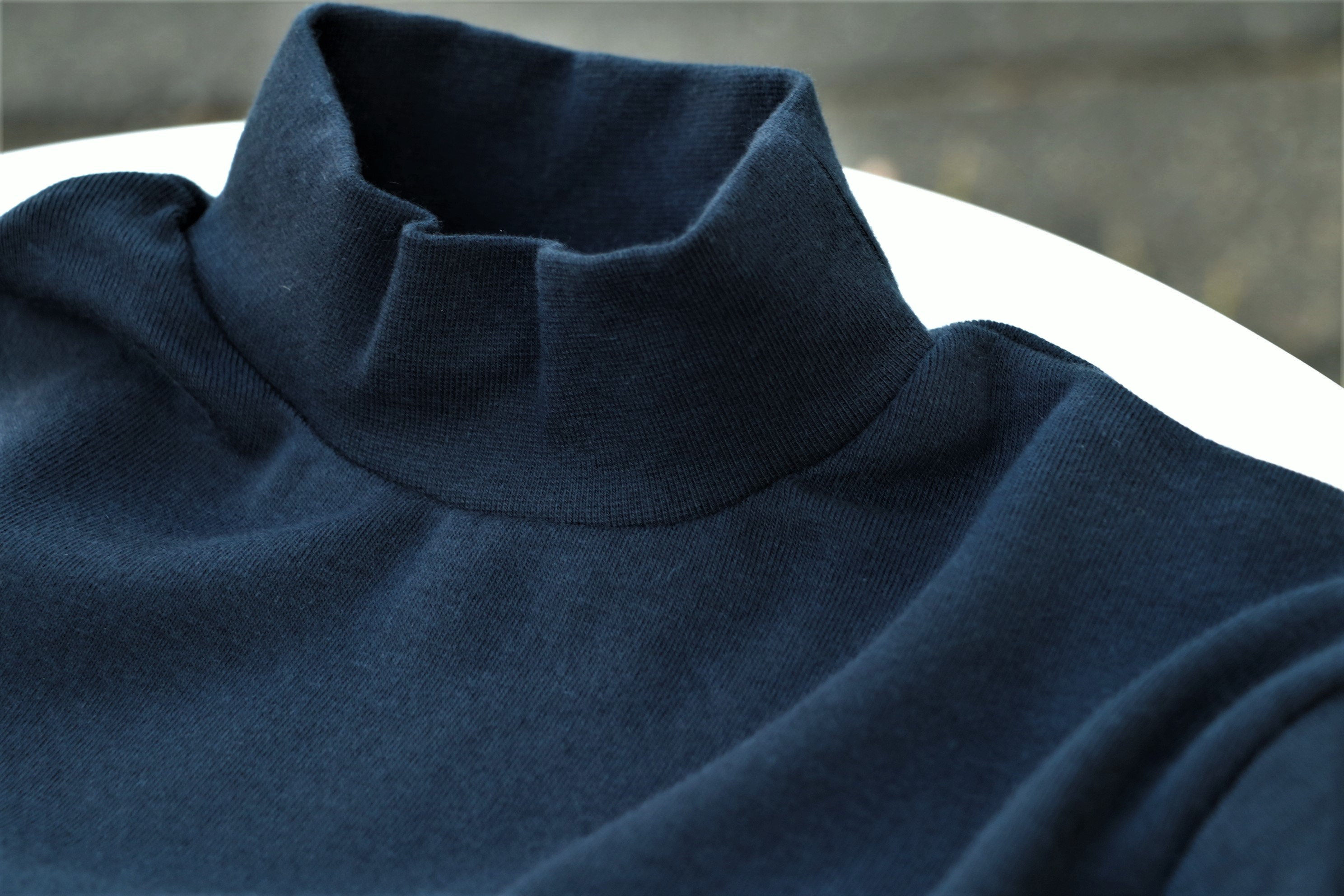 展示会で一目ぼれしたのは、コットン85%にカシミアブレンドののカットソーとニットを組み合わせたモックネック。オーダーした色は3色。そのうち入荷したのが、こちらのフレンチネイビーのM、Lサイズ1点ずつ。オーダー通りに入れば、全色で20枚弱になるところ、たったの2枚。う~ん、残念です。紹介する私の息も上がらない...けど、貴重な2枚です。