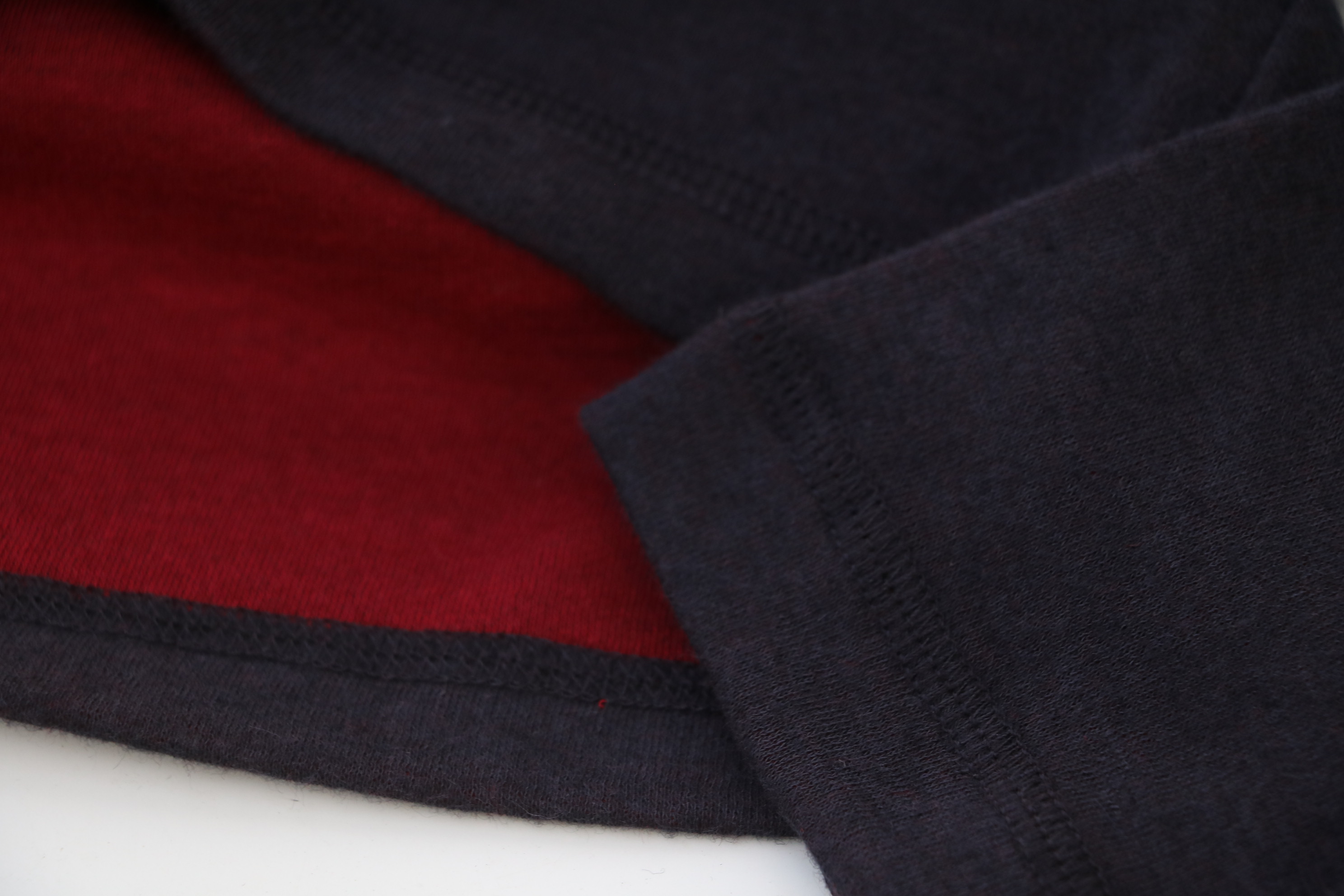 その中で、目を引いたのが、コットン・カシミアのダブルフェイス生地。実はキャンセルや売り切れで、ロングスリーブTシャツに関しては、このネイビーとボルドーの配色のみのご紹介です。