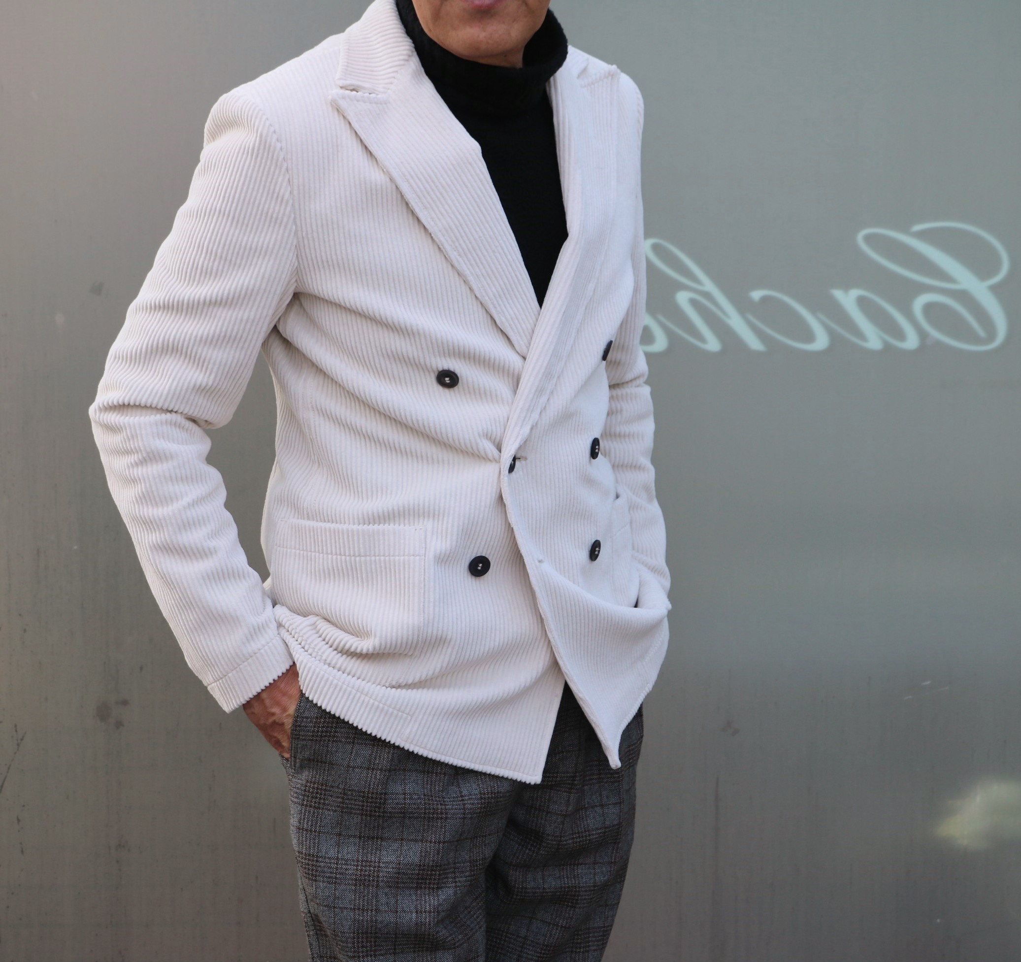 PT TORINO(ピーティートリノ)のお気に入りチェック柄パンツを穿いたなら、このジャケットを合わせてみたくなります。こちらもT-JACKET(ティージャケット)の「太畝コーデュロイダブルブレストジャケット」。各雑誌が取り上げている、注目の目立ちジャケットです。気取らずに華やかさをお求めな方には、お勧めします。