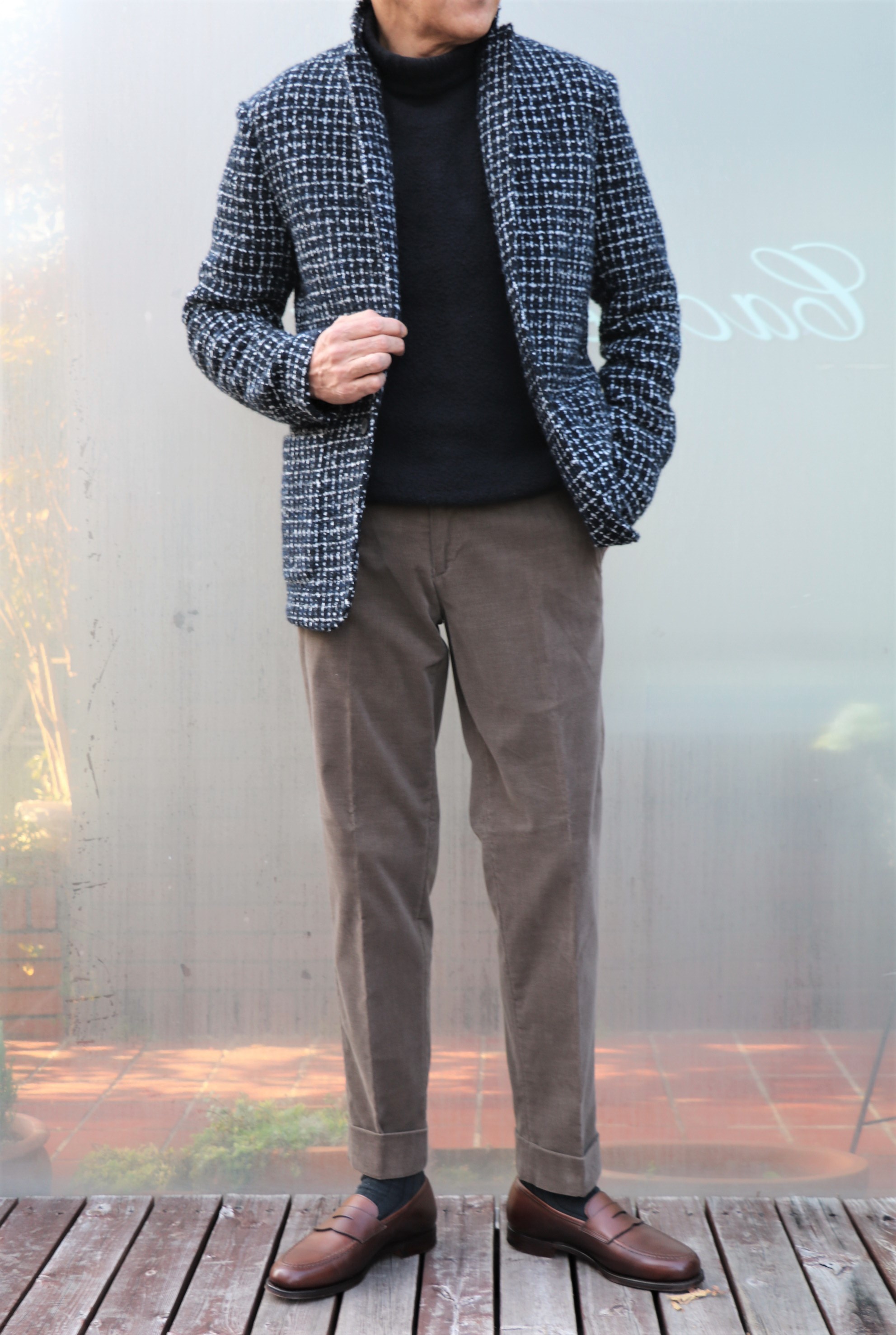 インのタートルは、そのままにパンツをコーデュロイに。私の穿いているフランネルと同じモデル「VAN」になります。ジャケットも同じく【T-JACKET/ティージャケット】。足元もスニーカーからローファーに替えてみました。