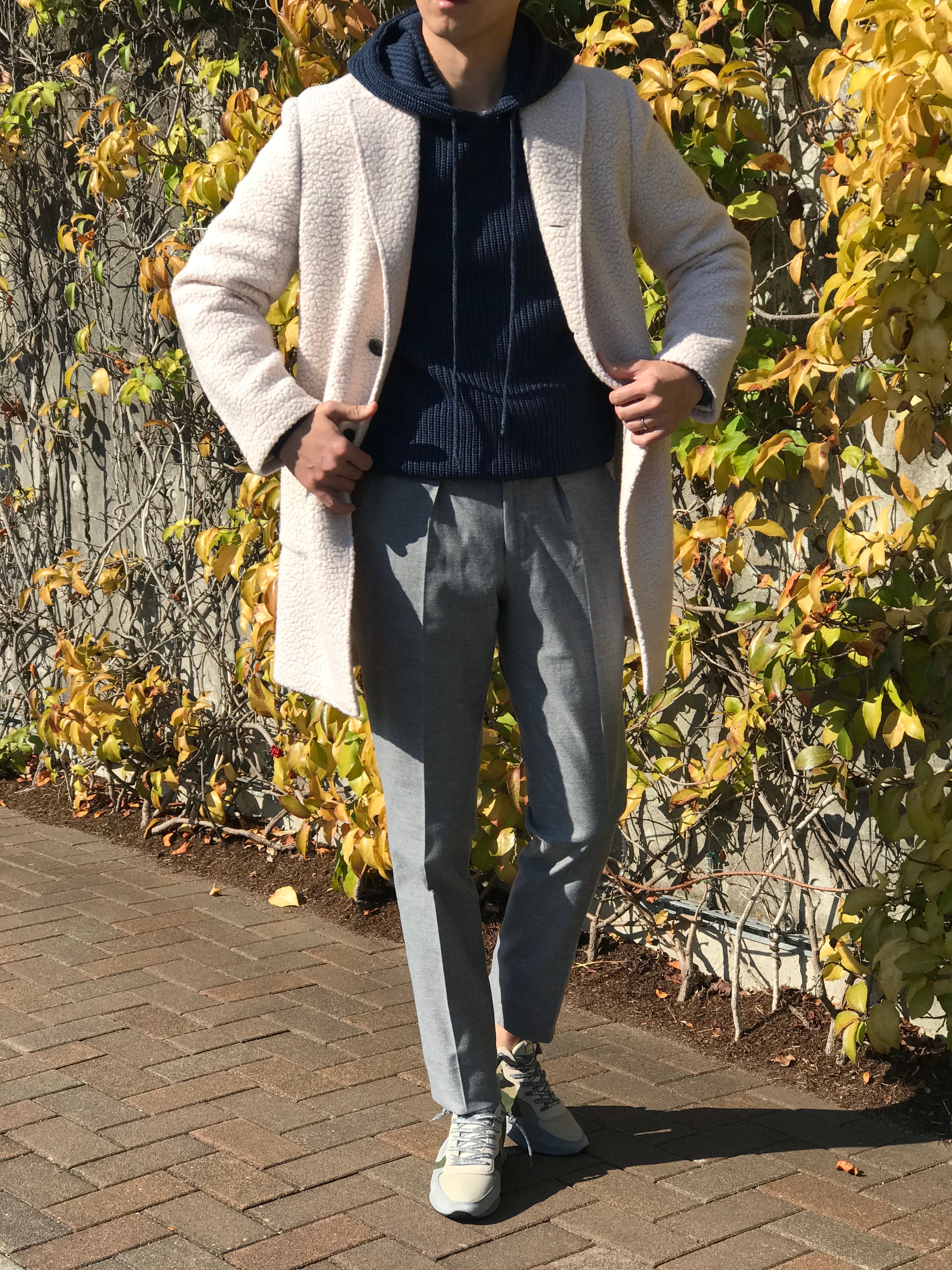 オフホワイトはスポーツをイメージしたコーデに。ニットはDRUMOHRでパンツはPT TORINO。スニーカーはPHILIPPE MODELです。ふわモコのテディベアコートであれば、"コート×パーカ"や"コート×スニーカー"といった、コートを日常着に落とし込んだコーデもお手のものです。
