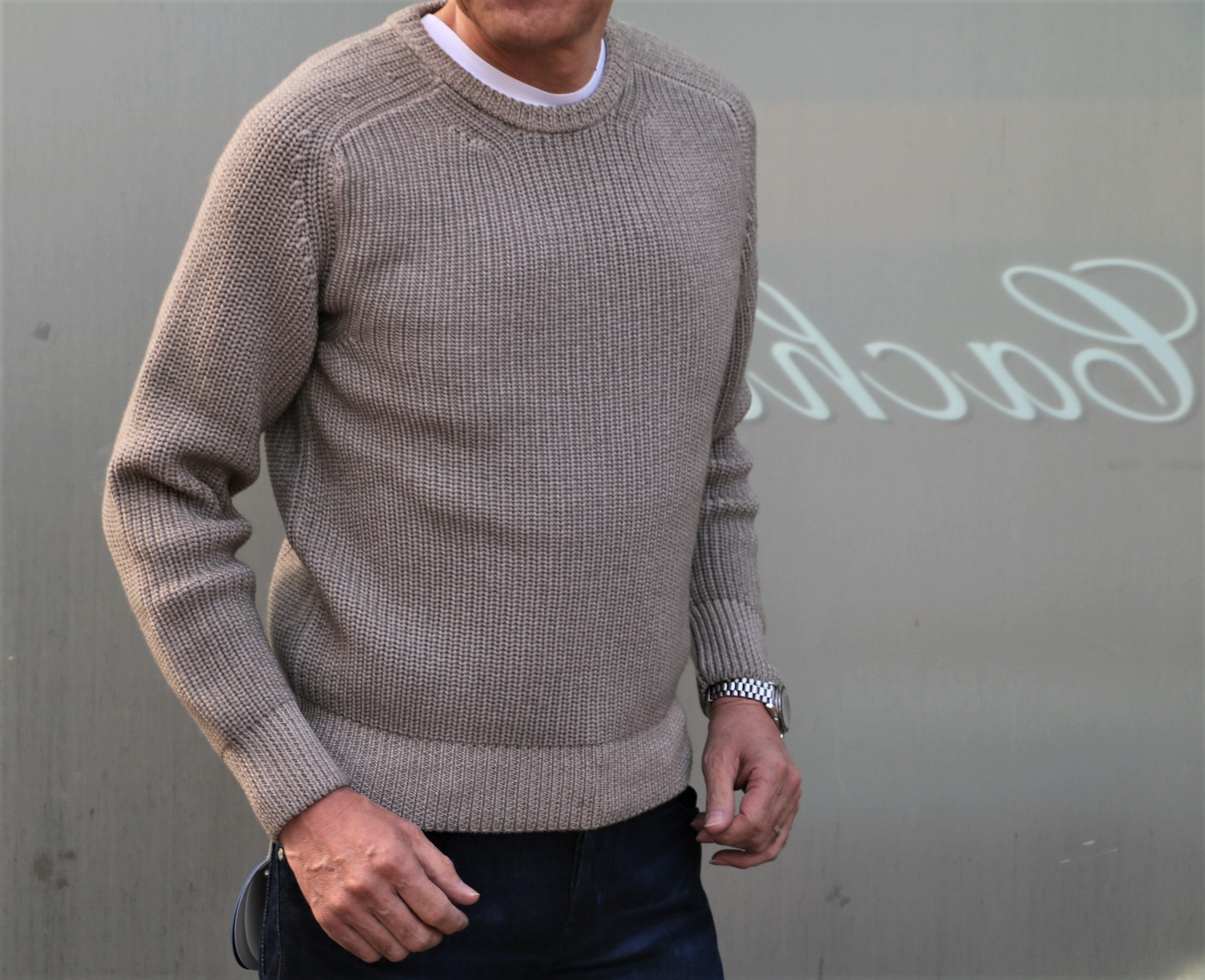モノトーンもいいけど、そろそろ色を。そんな気持ちがバイイングに表れております。とは言え、グレイには注目です。ブラック程、きつい色調ではなく、他の色とも馴染みやすいニュートラルカラー。特に多くは持たず、長く付き合っていきたいコートなどは、グレイが最適。フォーマルシーンは別として、オンオフ問わずに着ることができます。そんなグレイのコート(TITO ALLEGRETTO)が本日の...いや、インに合わせている【Drumohr/ドルモア】のニットのご案内です。