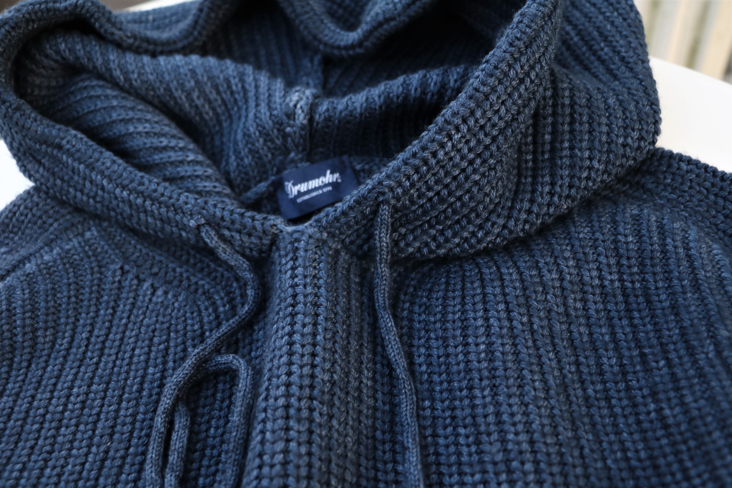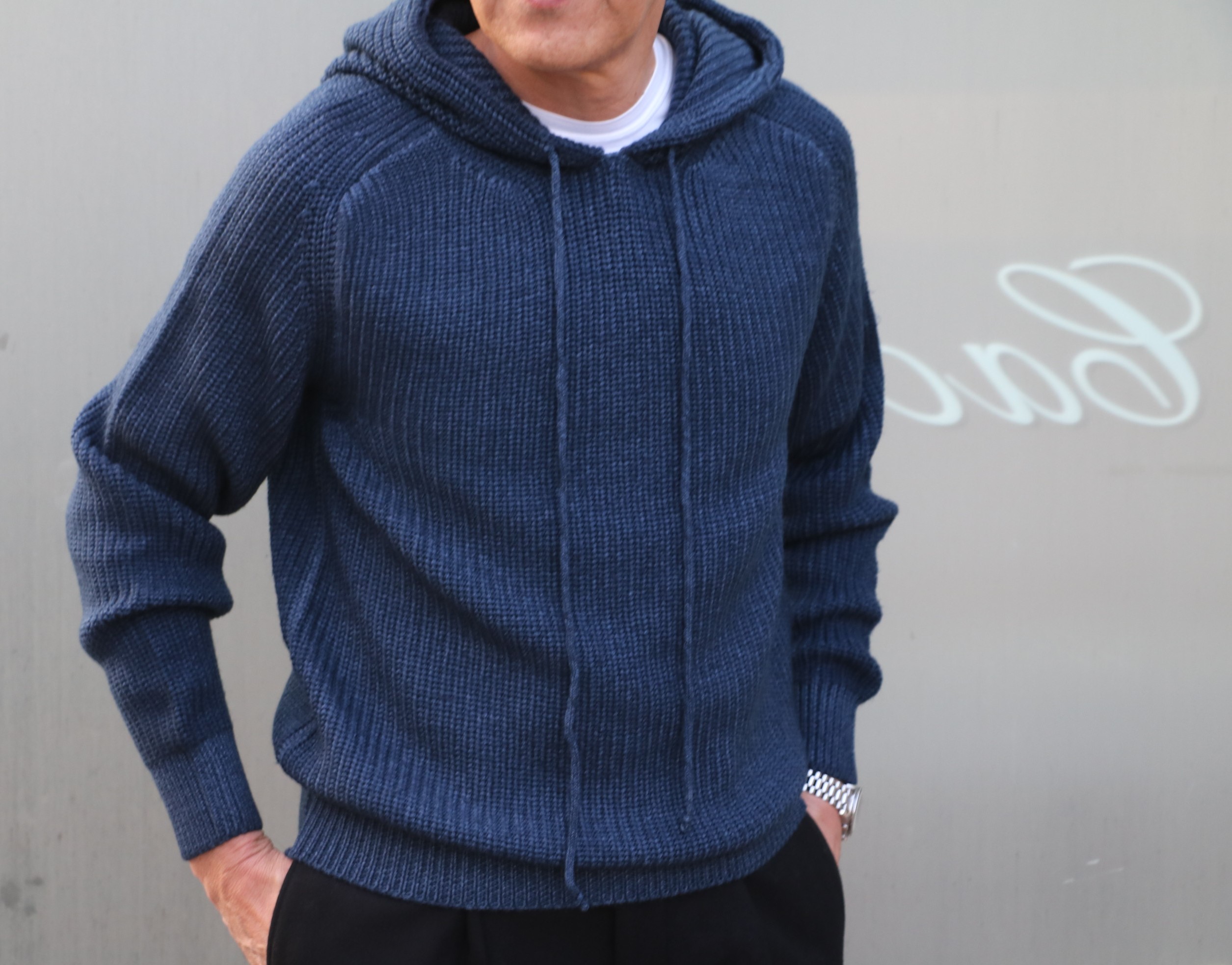 ラウンドネックと同じ糸を使ったプルオーバーのパーカーニットは、インディゴでセレクト。ブラックのパンツ(Borelio)に合わせると、モダンです。