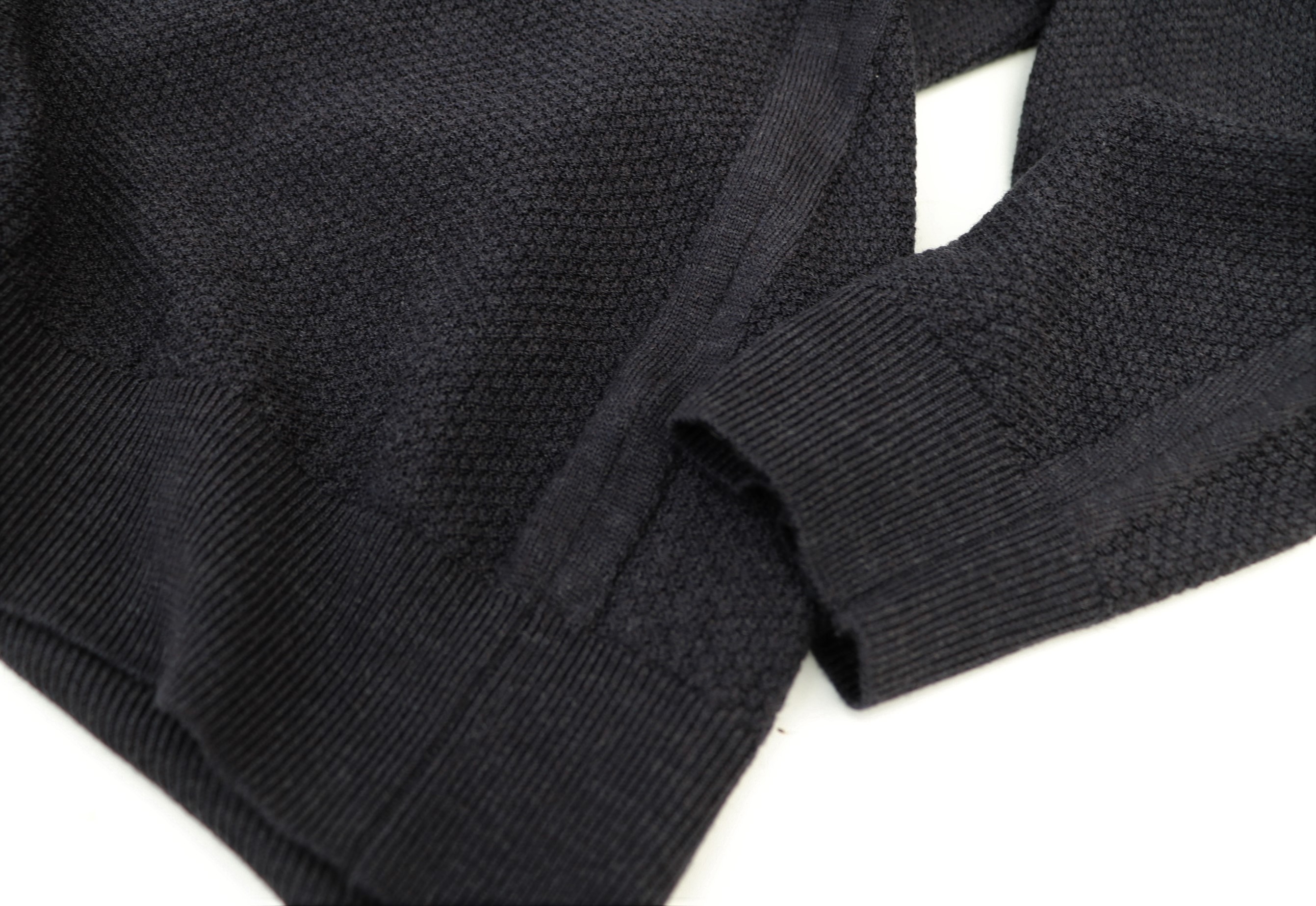 呼吸する素材ウール。衣服内気温や湿度を調整する機能を持ちます。24ゲージのハニカム構造による凹凸感は空気を含むことで軽さと保温性、さらには弾力性に優れます。