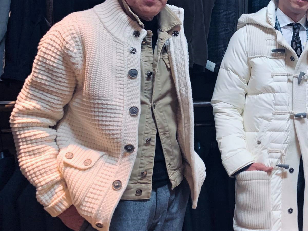 ブログでは何度も登場している、展示会では着用分までオーダーしたTRAMAROSSA/トラマロッサのデニムジャケット。昨夜のYou Tubeの収録をきっかけに遂に購入です。この写真でインに着ているのは、私物のFEDELI(フェデーリ)のハイゲージニット。でも、このスタイルでは日が陰ると寒い。ならばと、