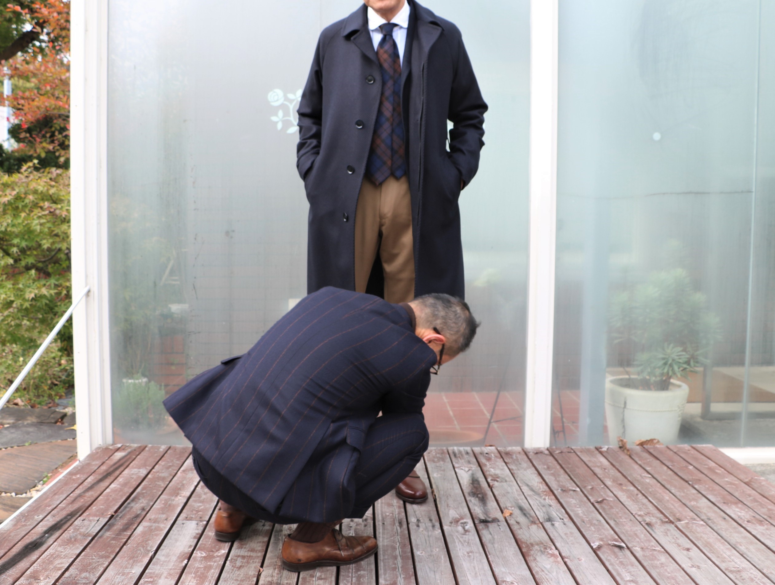 土日は隠れ場Cachetteも忙しく、撮影時間は限られます。効率よく撮影する為には彼の手が必要です。偶然にも、今日の彼の出で立ちは、タリアトーレのスーツ。それもコーディネートと同じ配色ネイビー×シナモンのバンカースーツ。残りサイズ48が一点です。サイズの合われる方で彼とお揃いをお望みであれば、ぜひご購入ください。近未来、彼がここに立つのも、ほぼ間違いないかもしれませんね。
