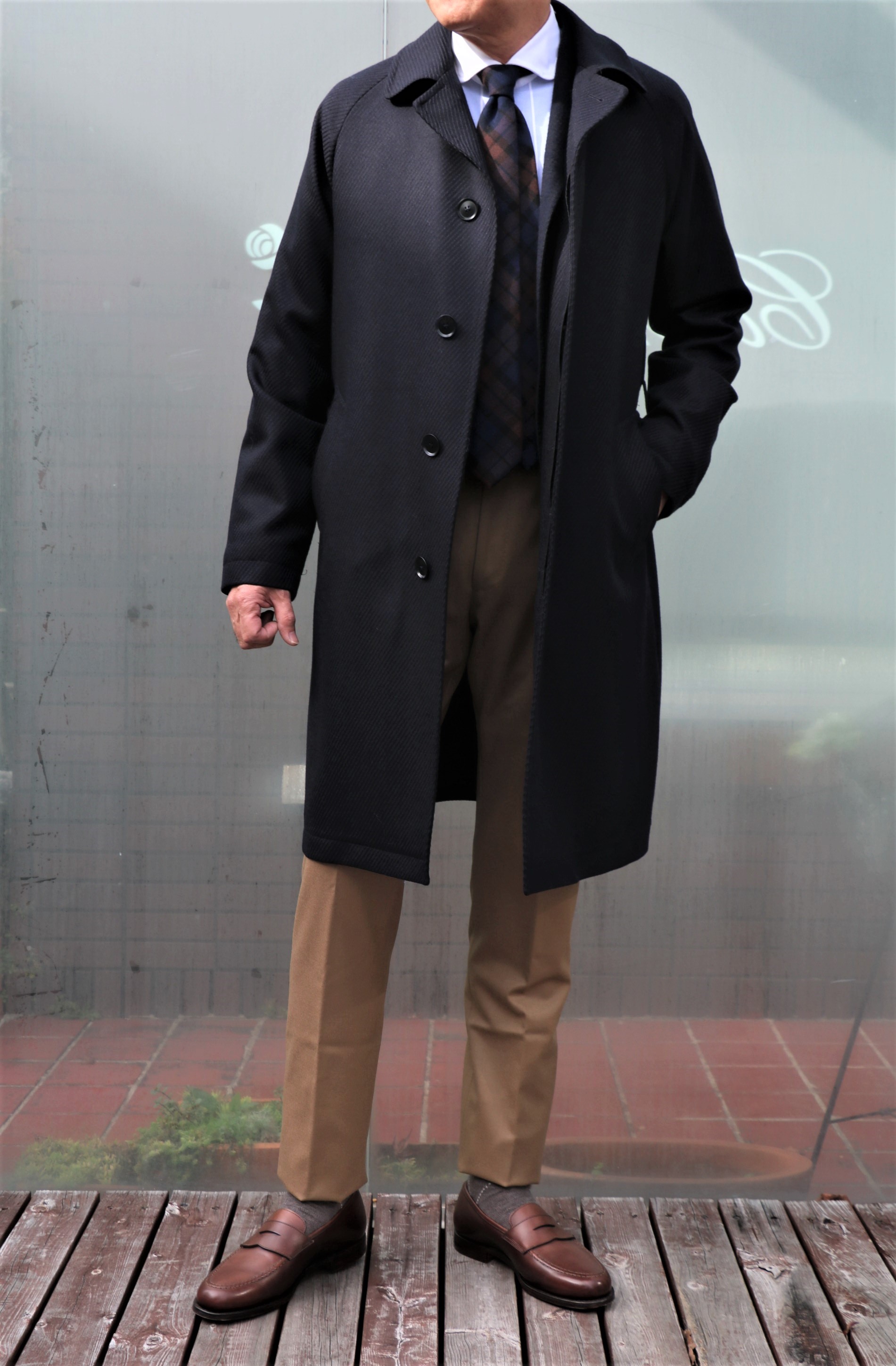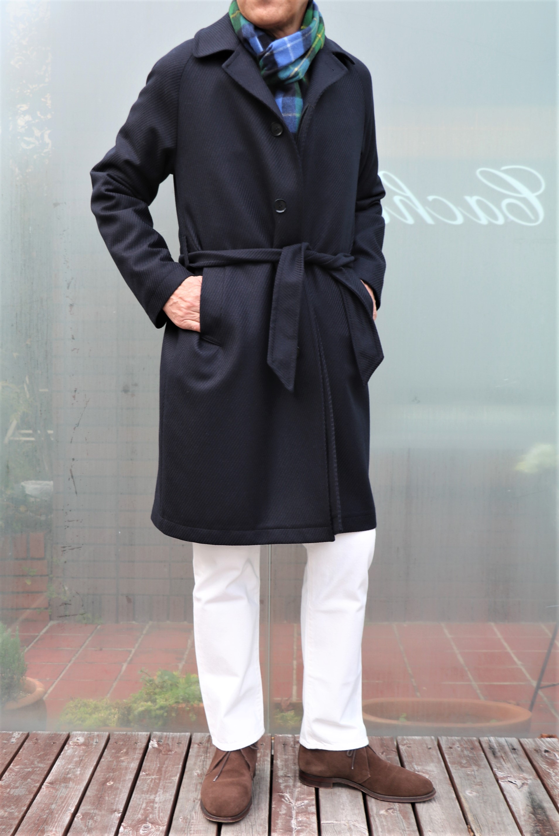 上のジャケットスタイルに羽織ったのが、ベルト付きのラグランスリーブバルカラーコート。昨年より登場し、【TAGLIATORE/タリアトーレ】のコートコレクションの中では最も人気のあるモデル「SALOMON/S」です。