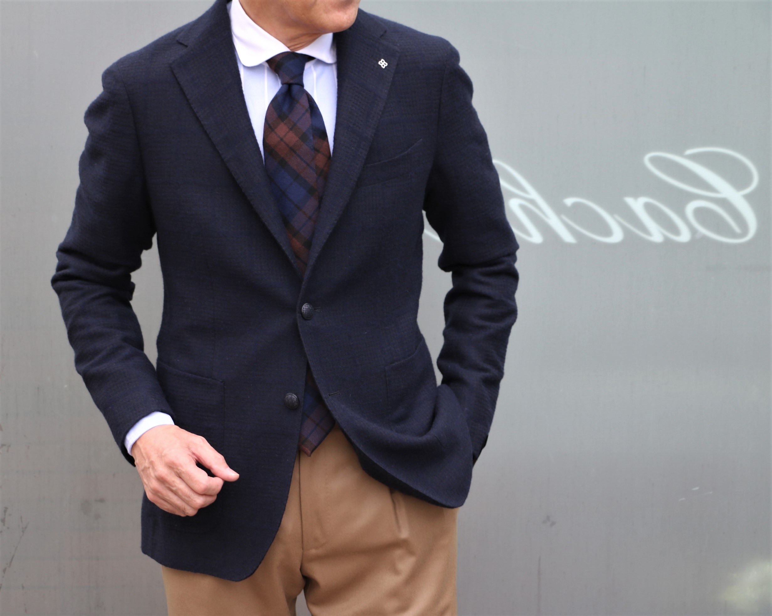 ブークレ調というのでしょうか。織地による凹凸感が全体の表情を豊かに。ベースがブラックに近く、深みのあるモダンなネイビージャケットに仕上がっております。丸みのある釦にも注目してください。