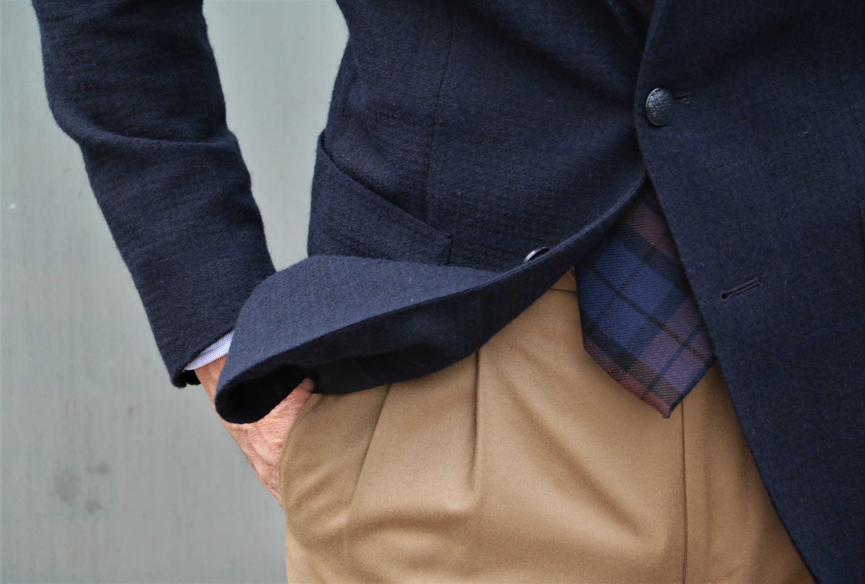 クレリックのラウンドカラーシャツ(Maria Santangelo)に、タータンチェックのウールタイ(FRANCO BASSI)を結び、キャメルのウールパンツ(未公開のZanella)穿き、足元はローファー。懐かしくも新鮮なコーディネートです。世代によって、どう評価されるかが気になる組み合わせでもあります。セレクトしたジャケットは、