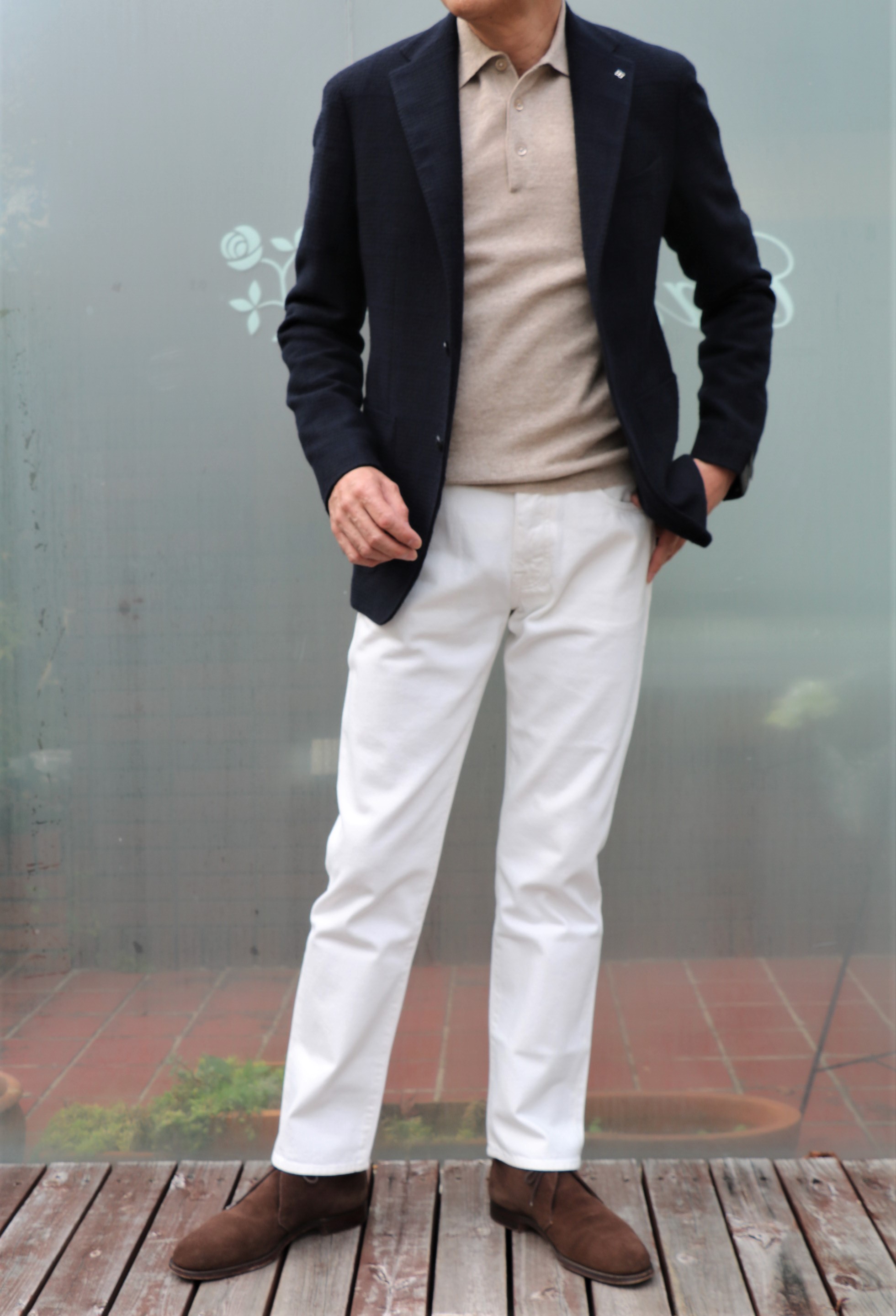 軽くて温かみのあるジャケットだけに、オフでも使いたいものです。カシミアのポロニット(Atelier Saman Amel)にワークテーストのオフホワイトパンツ(FORTELA)を穿き、居心地の良いスタイルをご提案です。