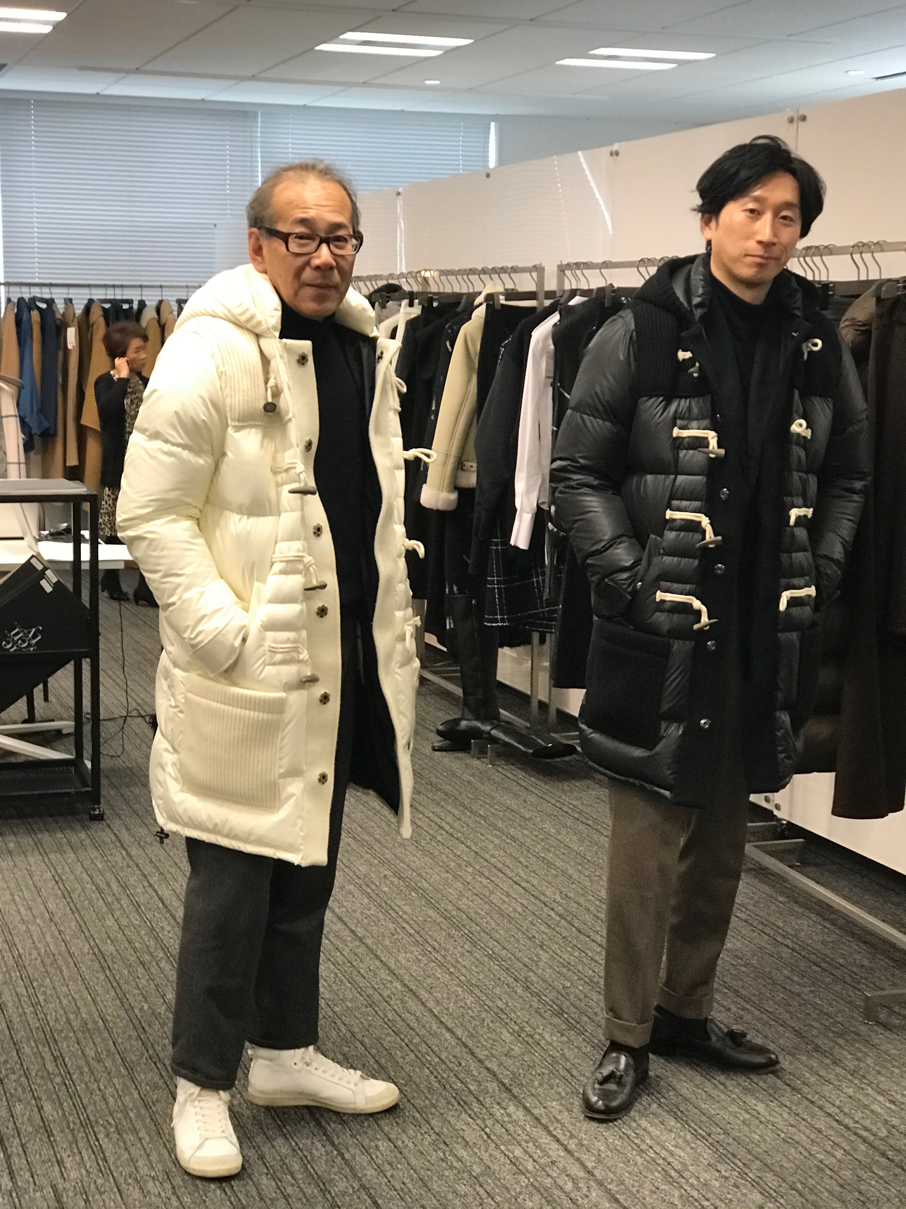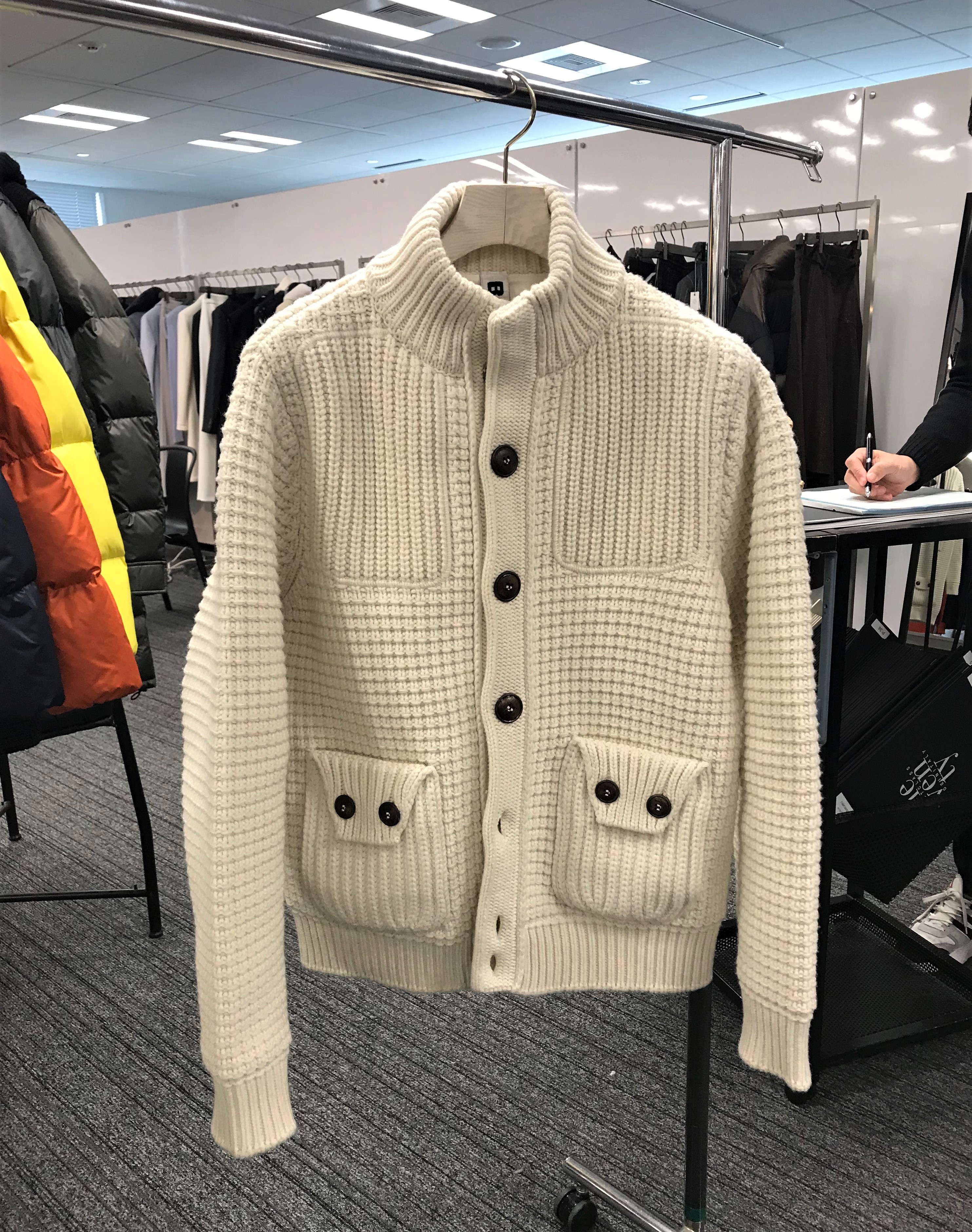 セレクトカラーは、サンプルのオフホワイト、ダークブラウン、チャコールグレイの3色。どれもアウターとして使いやすい色目です。世にもう少し色が戻ったら、オレンジやブルーなどのカラフルな色目も挿し込みたいものです。