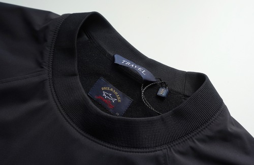 【PAUL&SHARK/ポールアンドシャーク】の展示会で注目したのが、このクルーネックのプルオーバーブルゾン。ジュニアがネイビーとブラックの2色を選んだほど、心に刺さったアイテムです。何が凄いかと言えば、