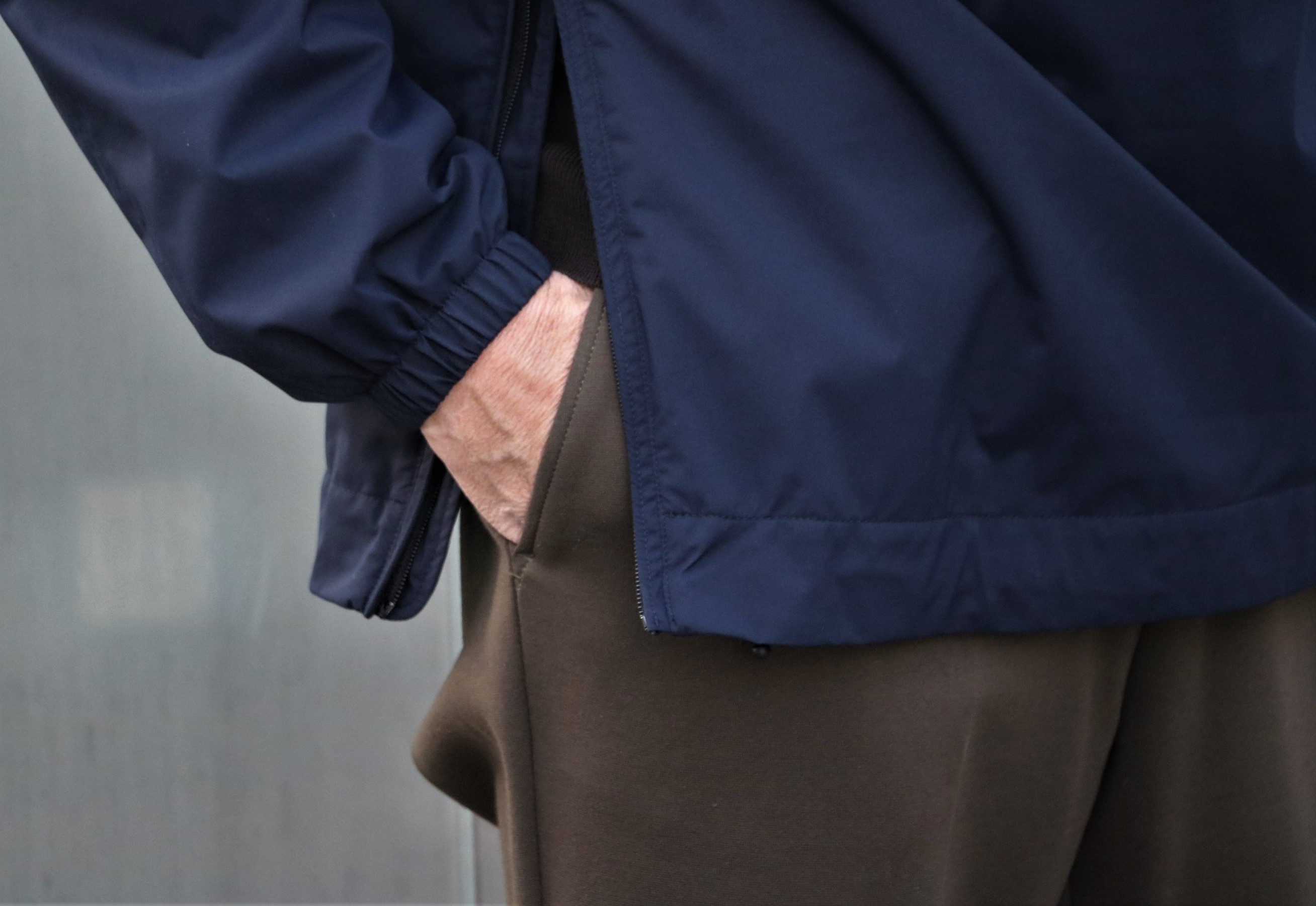 スウェットの上下に合わせたのは、サイズS。こんな風に着る機会の多いブルゾン。サイズはこちらの方でしょうか。タイトに着るカッコよさもありますが、生活の一つの道具として考えた場合、少しゆとりを持った方がよさそうです。軽量性・保温性・耐水性にプラスされるのは、ゆとりあるオトナのラグジュアリー感です。