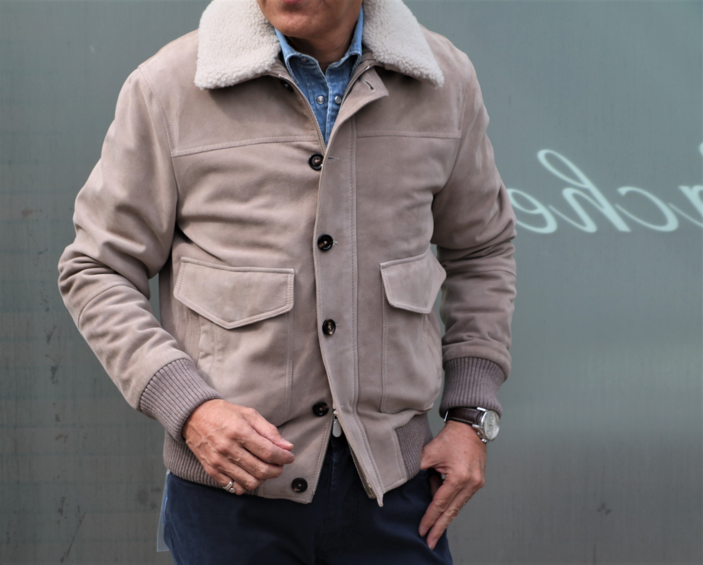 ボアと言えば、こちらを忘れてはいけません。eleventy(イレブンティ)のゴートスエード G-1型フライトジャケット。優しさは、格別です。