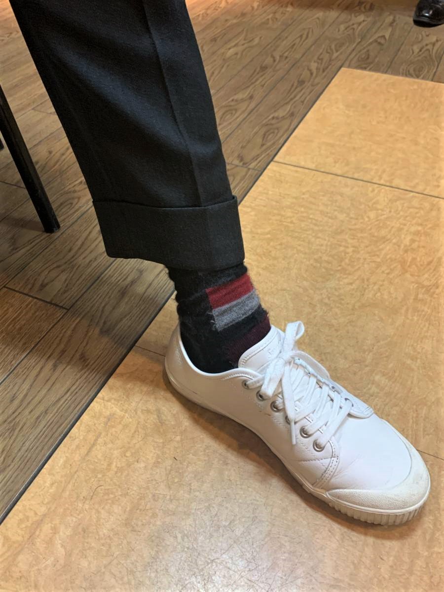 収録前の打ち合わせで褒められたのが、靴下(かつて扱っていたフランスの靴下メーカー、ドレドレのものです)。全身の中で、ここっ!!と思うでしょうが、実は最も大切なところ。この靴下が本日の主役だったのです。モノトーンのコーディネートについて気を付けることを次回の「おまけ動画」でもお話ししておりますので、ぜひご覧ください。