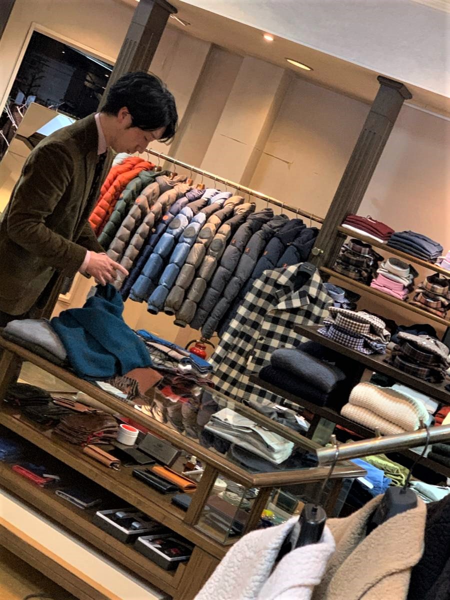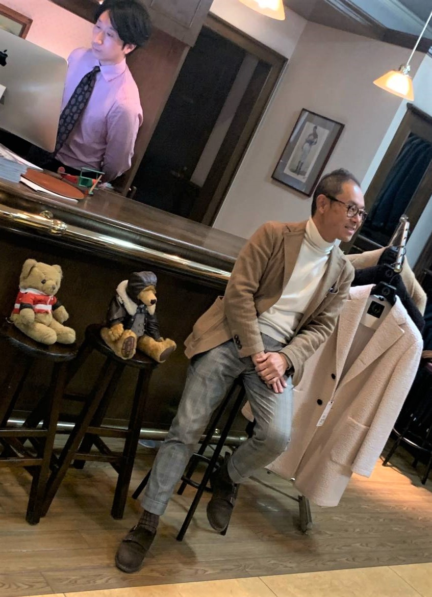 着比べです。マスヤマはT-JACKET、タカイはTAGLIATORE。どちらもTから始まり、二人とも身長はT(高い)。コーディネートは各自、好きなものを合わせています。マスヤマは展示会でも反応していたeleventy(イレブンティ)の