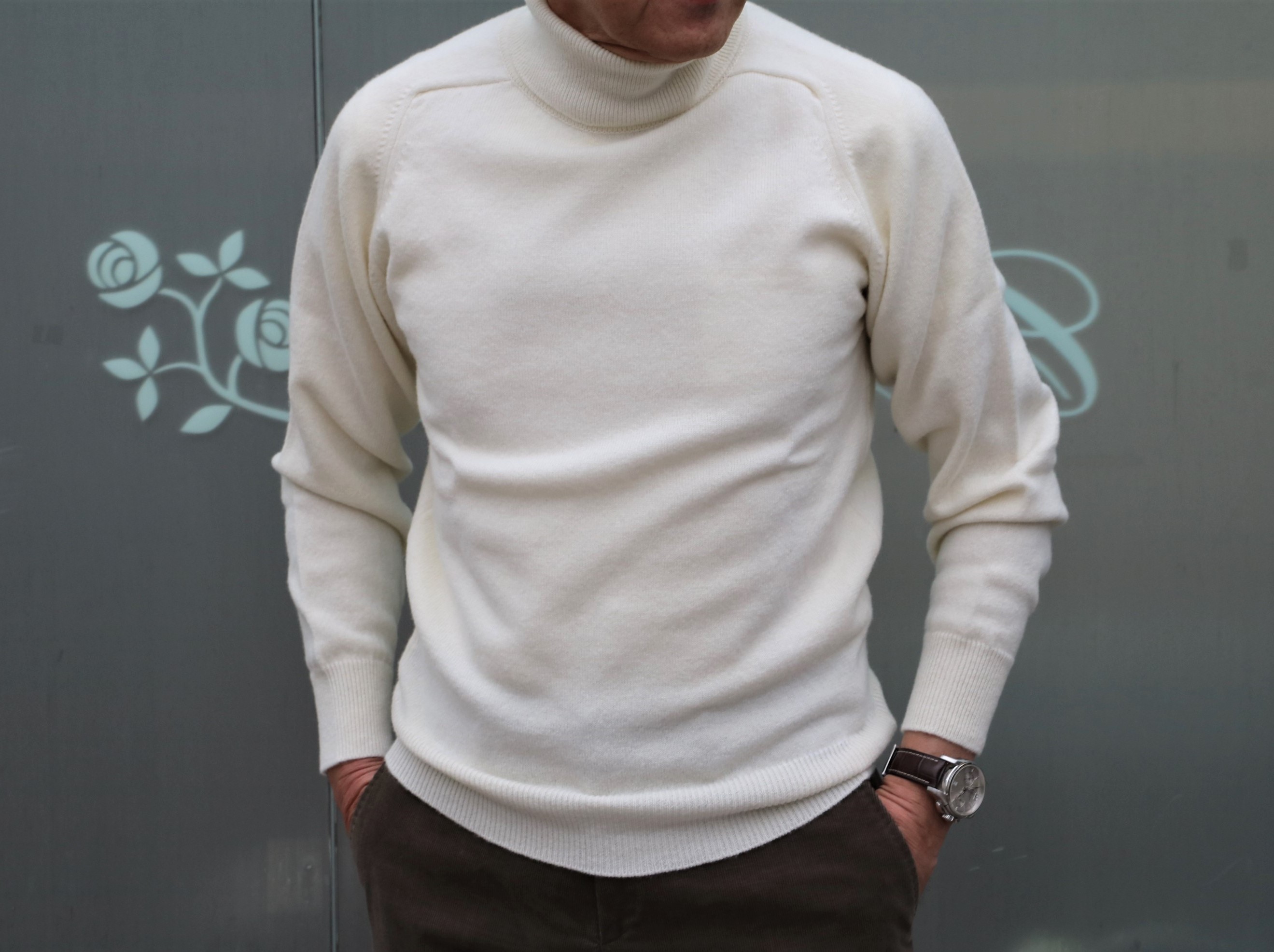 本日の出で立ちは、赤白ではなく、黒白とモノトーンです。着ているニットは、昨夜、隠れ場カシェートでジュニアから、「こんないいニットが売れない。値段も抑えているのに...」と、そんな愚痴がこぼれたWILLIAM LOCKIE(ウィリアムロッキー)。確かに日本においてはブランド力、知名度、周知度など、どれをとっても低いかもしれません。でも、その歴史は古く、スコットランド南東部ボーダーズ州ホーウィックで1874年に創業した老舗のニットメーカーになります。140年以上続くファミリー経営。スコットランドにある自社工場で昔も今も変わらない伝統的なニットを作り続けています。あのポールスチュアートもここに依頼しているそうです。どこかのタイミングでYou Tube「SUGURU STORY by gloryguy」でご提案したい、いや提案場所は「カシェート販売員チャンネル」でした。