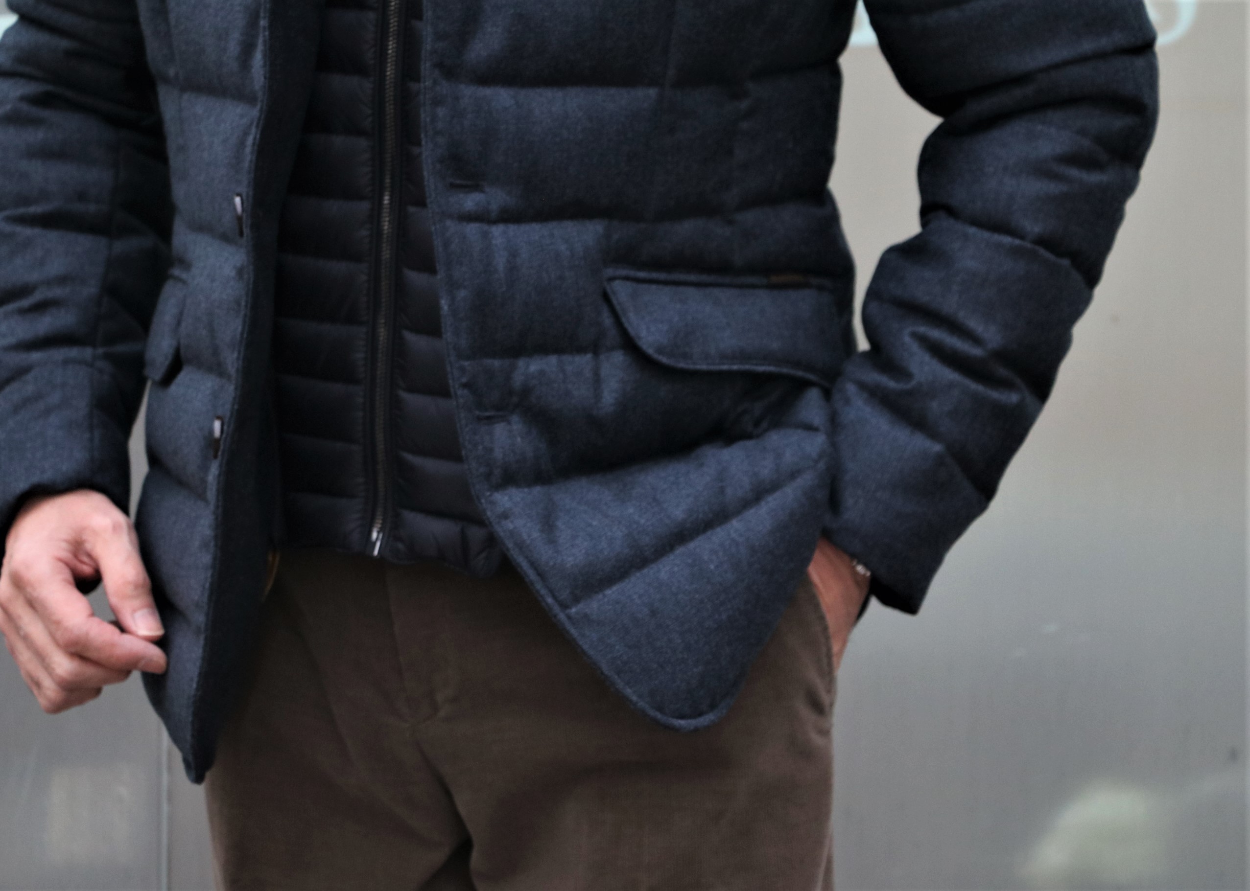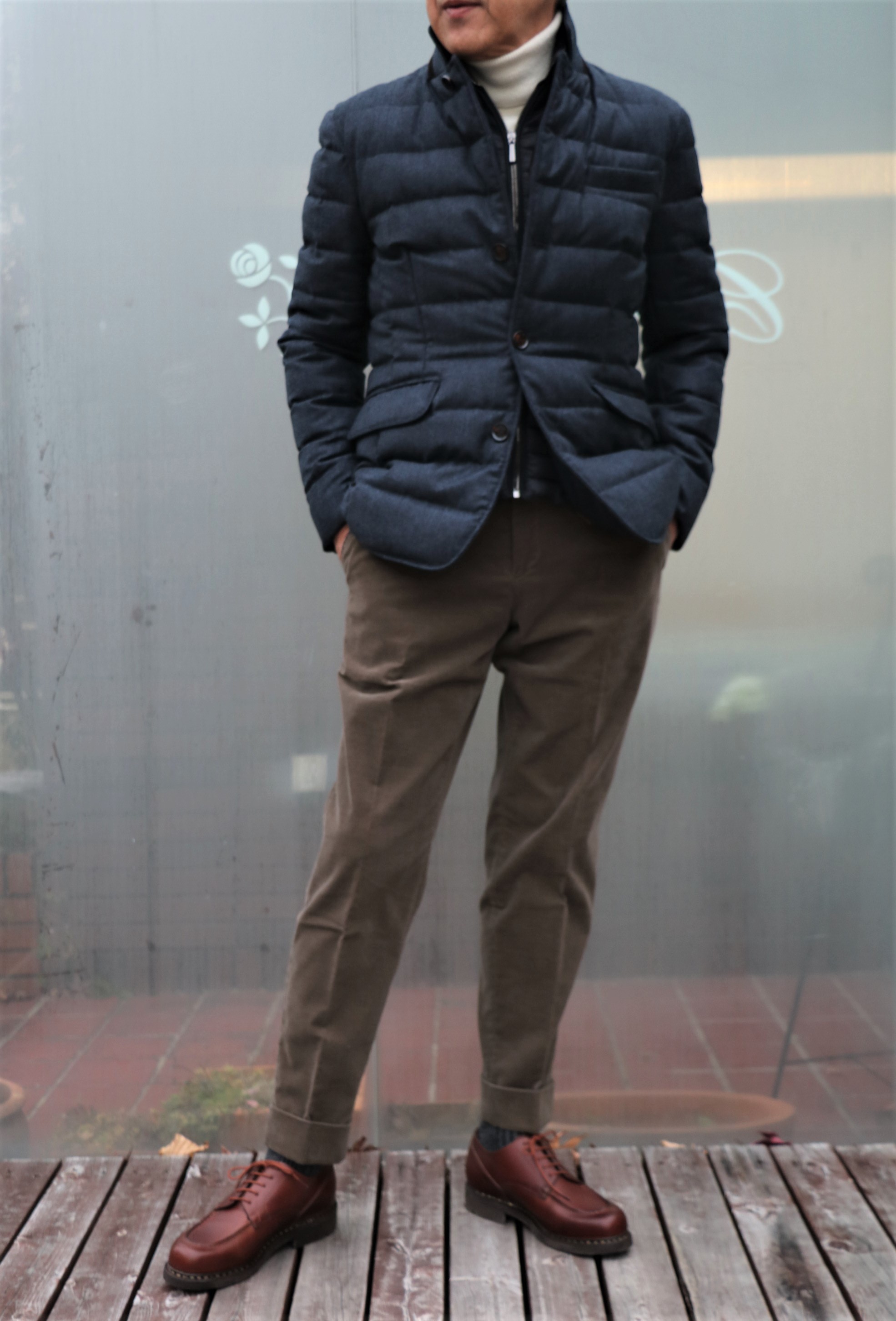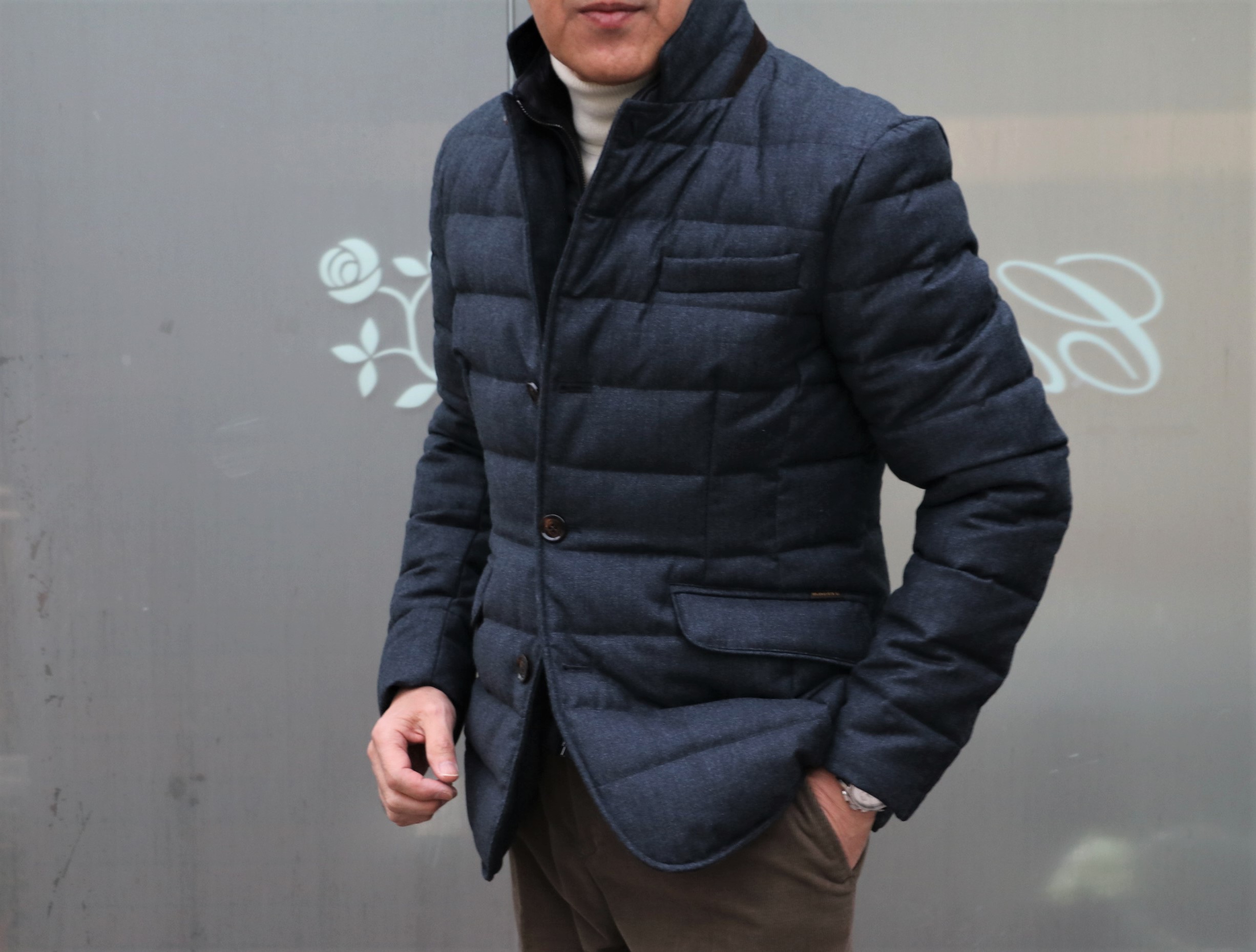 そんなスコットランドニットに羽織ったのは、1999年にイタリアのヴェローナで創業したアウターメーカー。MADE IN ITALY、最高品質、に拘った【MooRER/ムーレー】。例年以上に気温の下がった11月、12月。これから花見の時期まで需要があるのに、今の在庫では心もとない。そんな状況を代理店さんに伝えたら、素敵なダウンジャケットを送ってくれました。